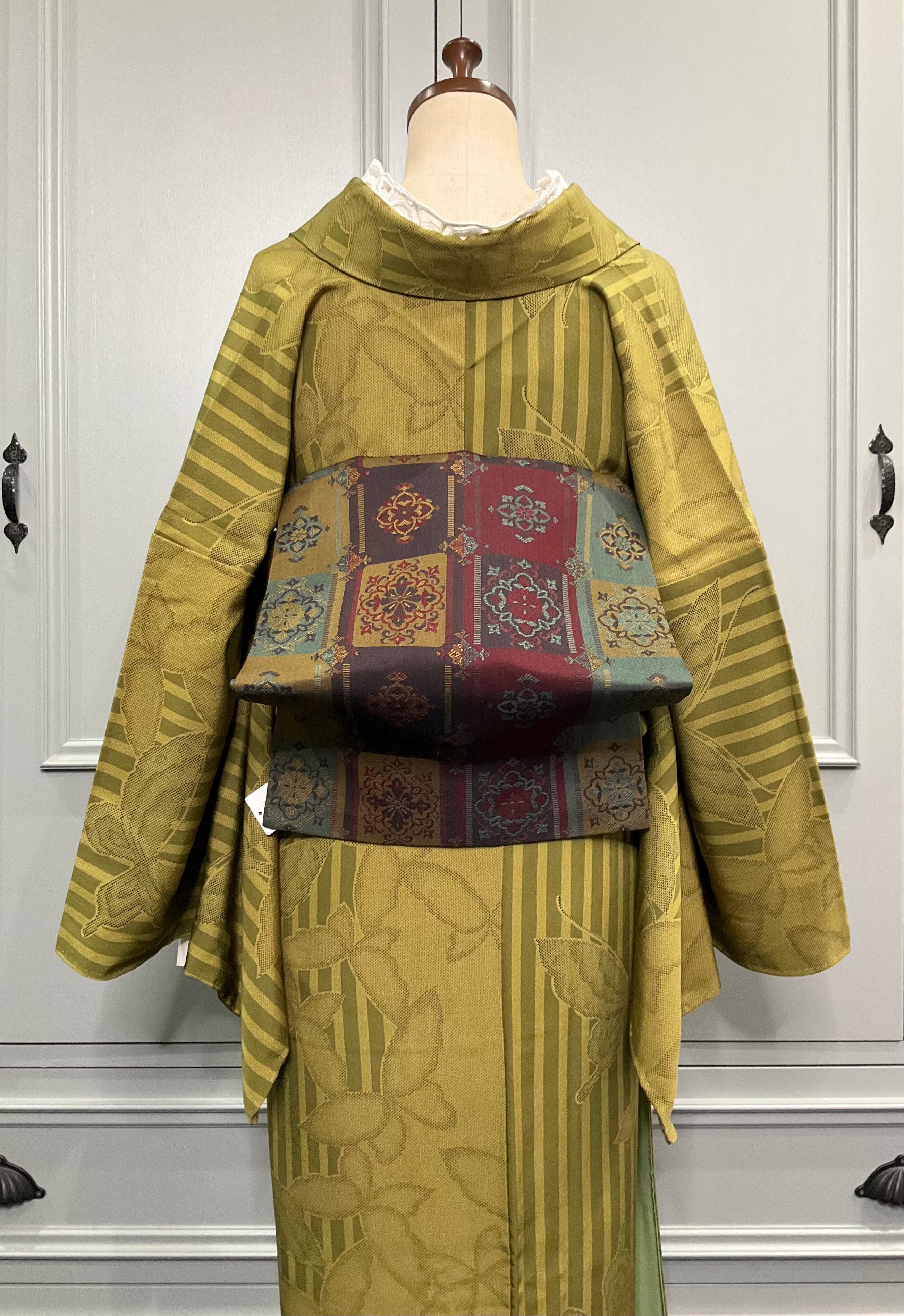 少しスモーキーなイエローグリーン系の地色に、ストライプ×蝶々柄がデザインされた、小紋着物です♪