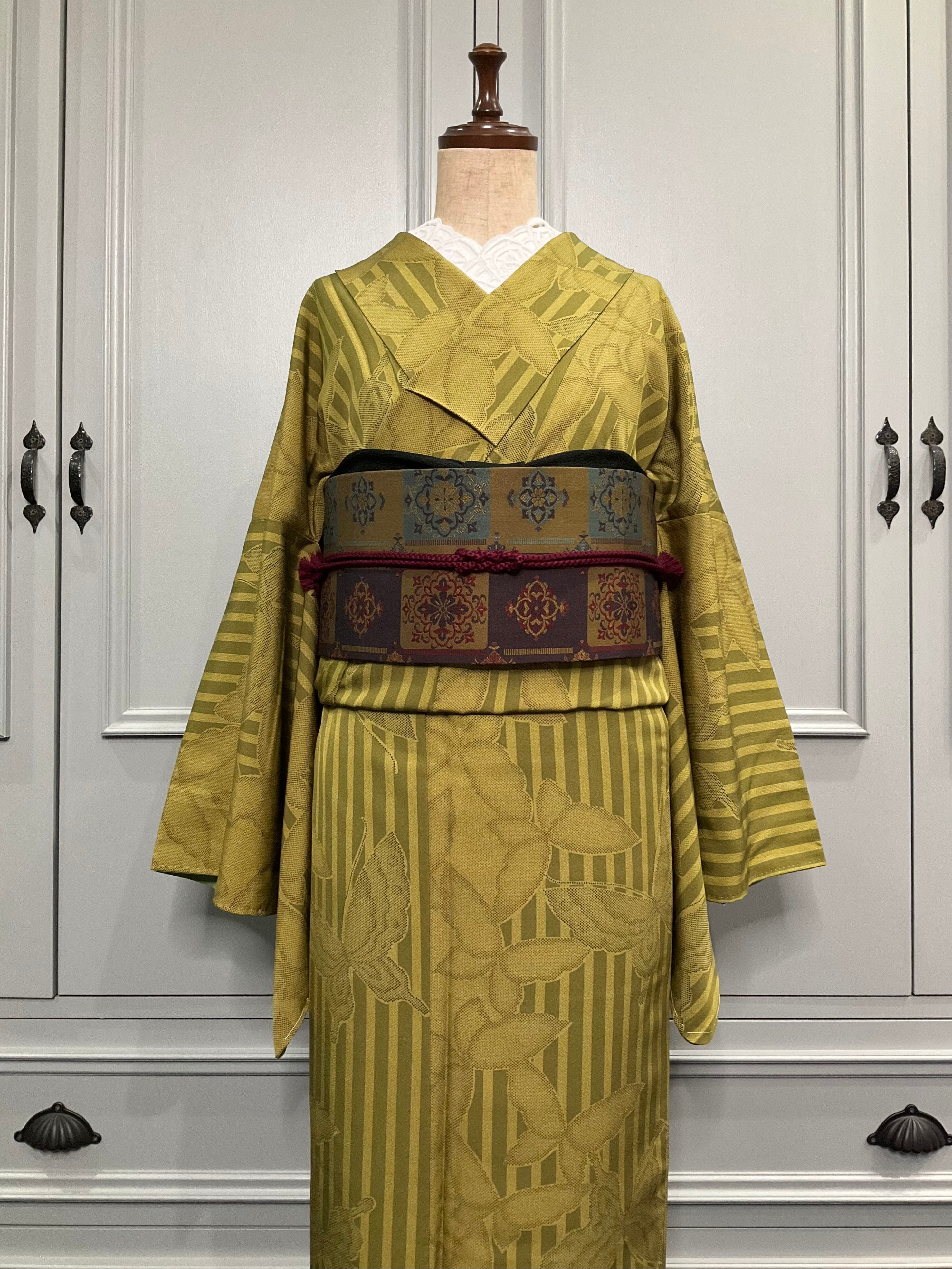 またこちらのデザイン、お太鼓部分を見ていただくとわかりやすいのですが、規則正しく縦に同じお色が並んでいる為、右回し・左回しと締める方向によって、胴回り部分に出るお色がかわるんです!