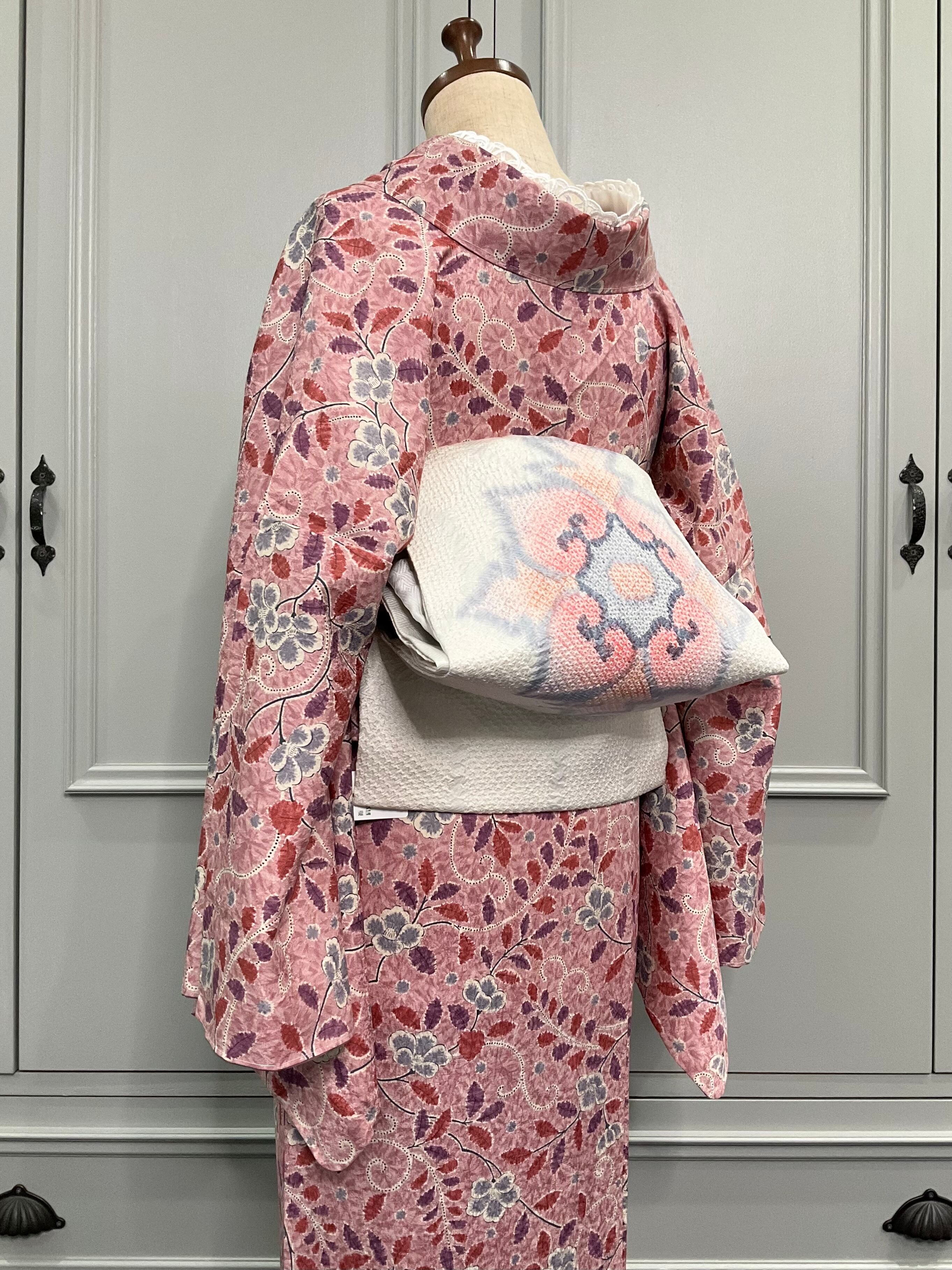 お太鼓部分と胴回り部分にデザインされている、暖色カラーの花模様も、ホワイトの地色によく映え、スッキリとした中に、華やかさを添えています^^