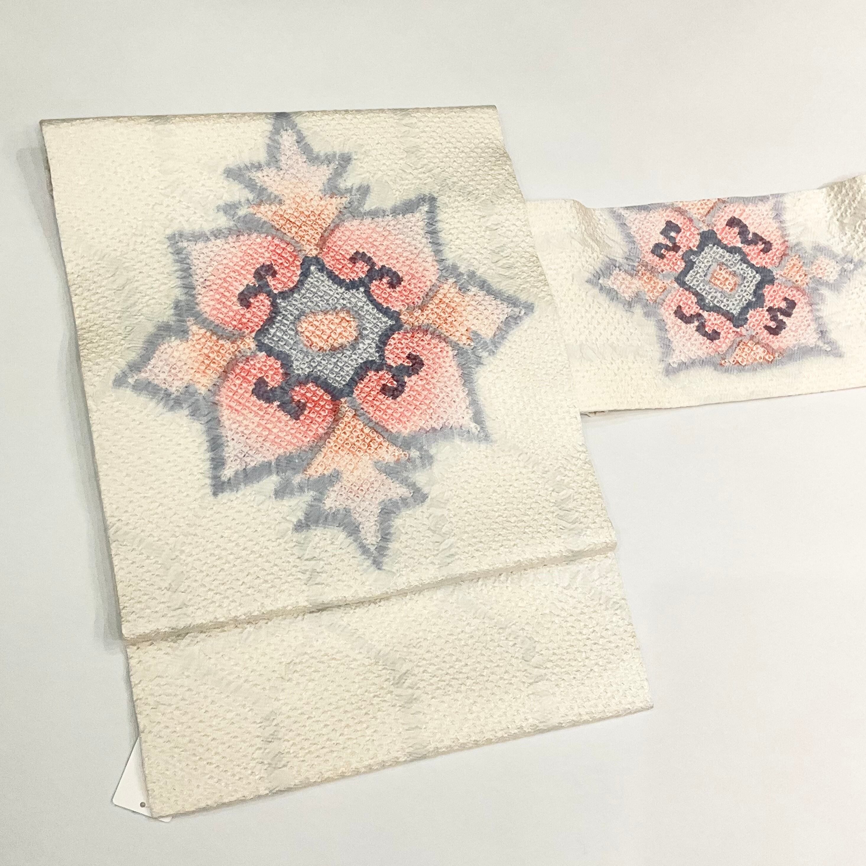 ホワイト 絞り花模様*リサイクル名古屋帯 0665