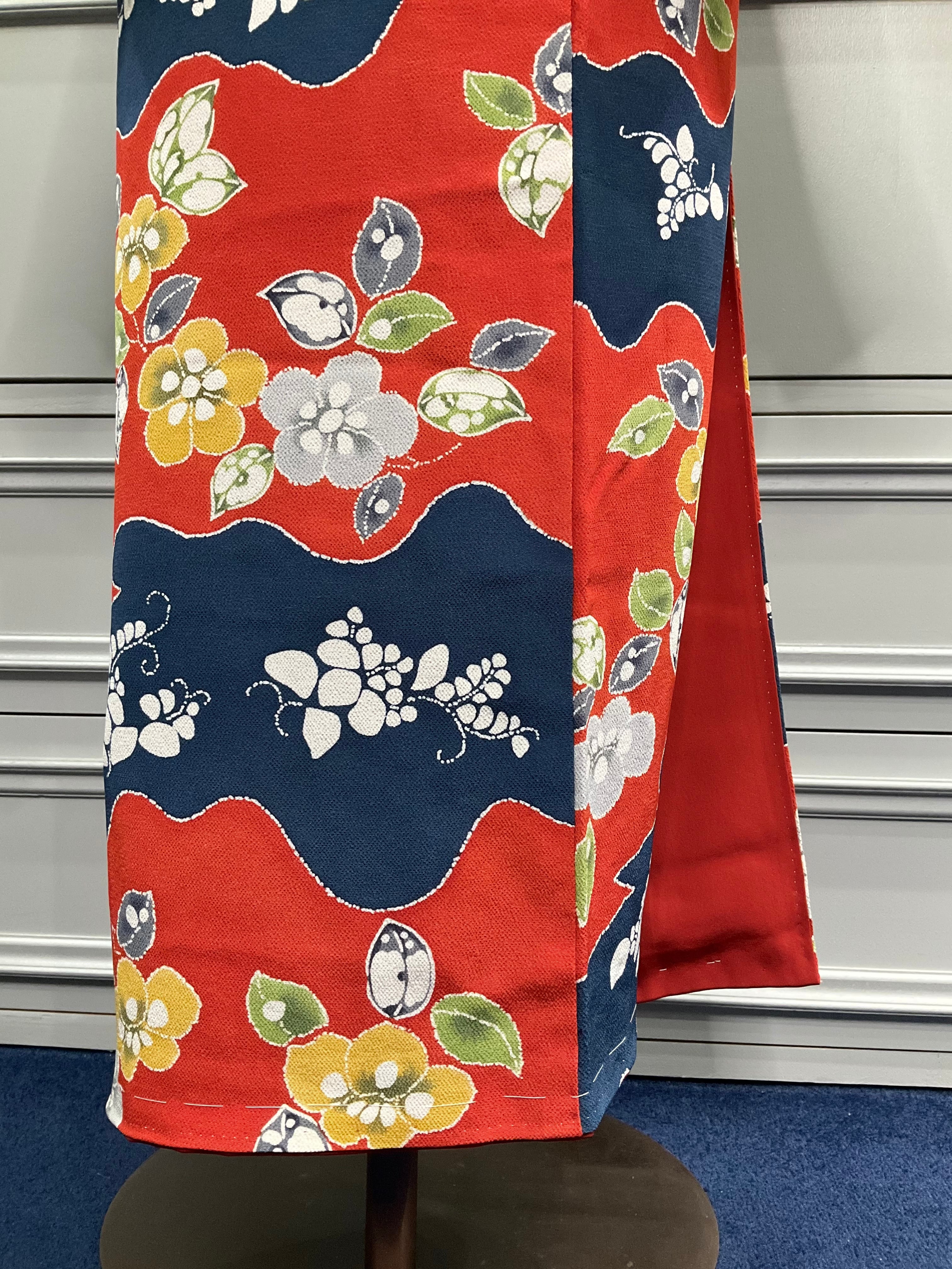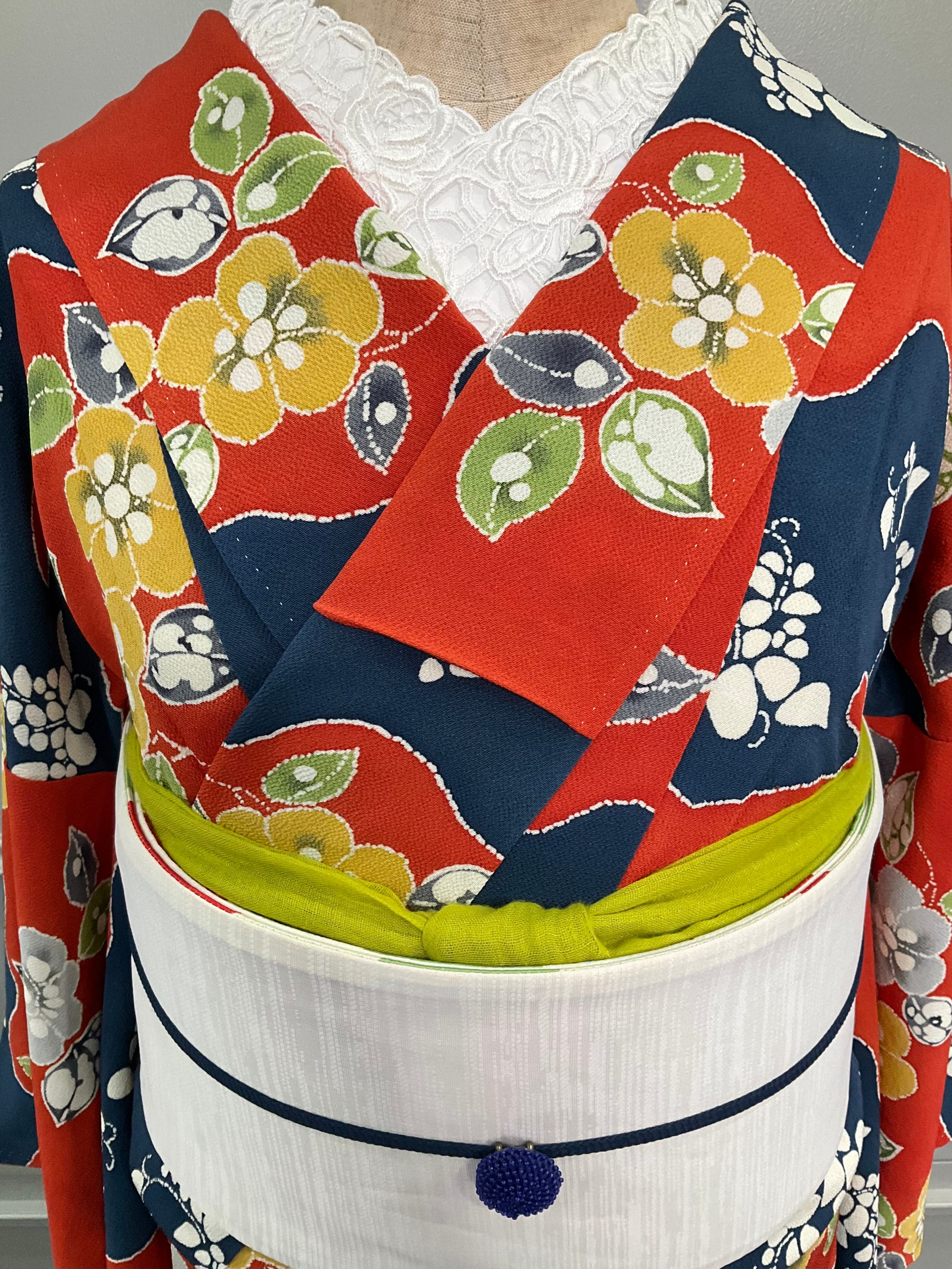 やわらかく、ざらっとした手触りの生地感に、レッド×ブルーの明るい地色と花模様が華やかなこちらのお着物。