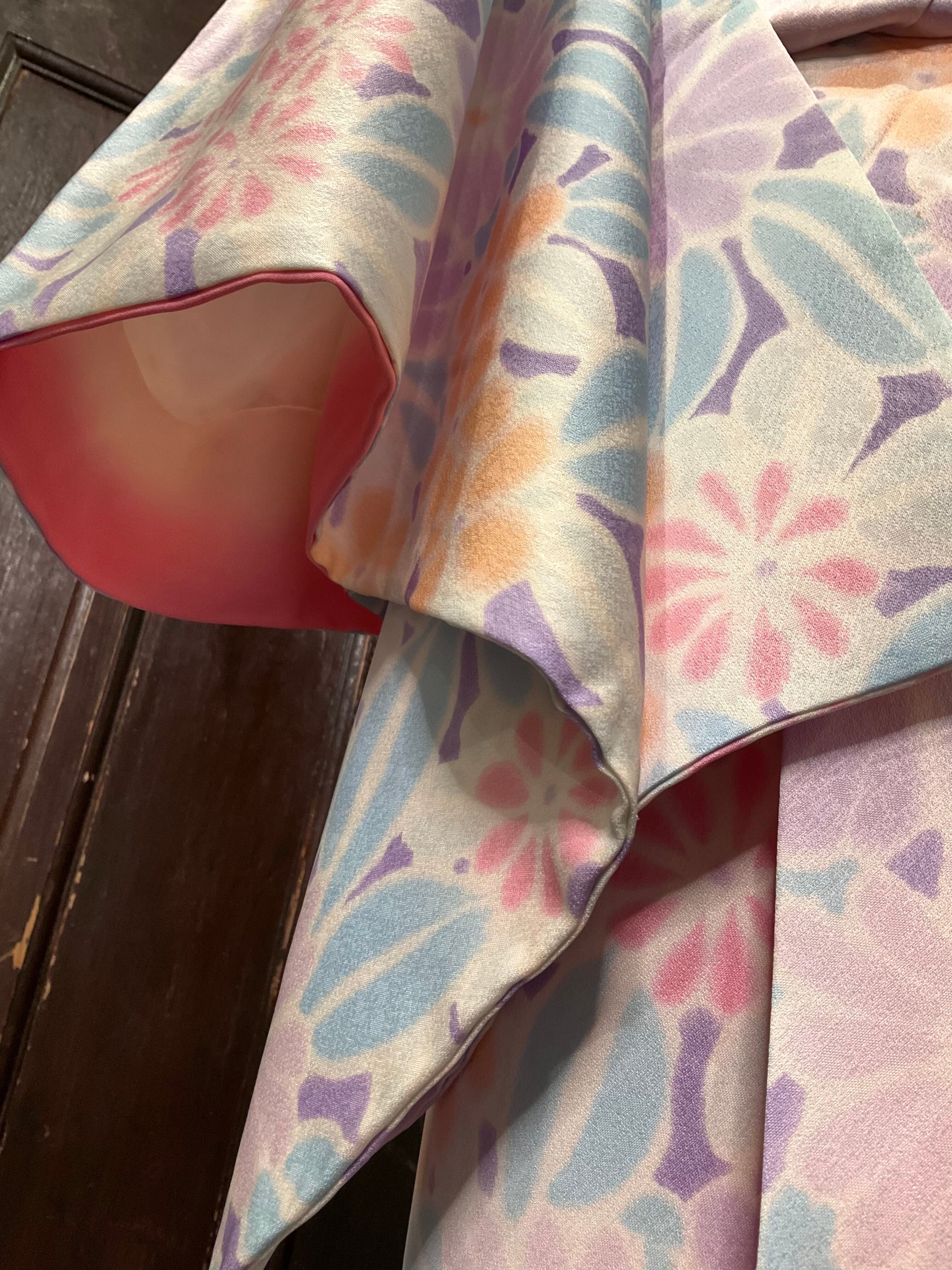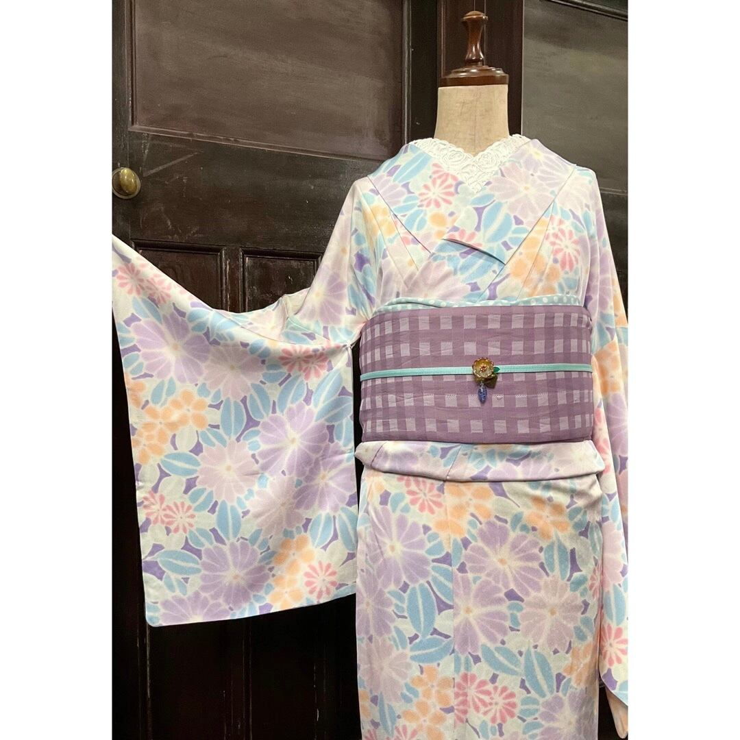 やわらかく、なめらかな手触りの生地感に、パープルの地色と、地色が隠れる程のたくさんの花模様が華やかな、こちらのお着物。