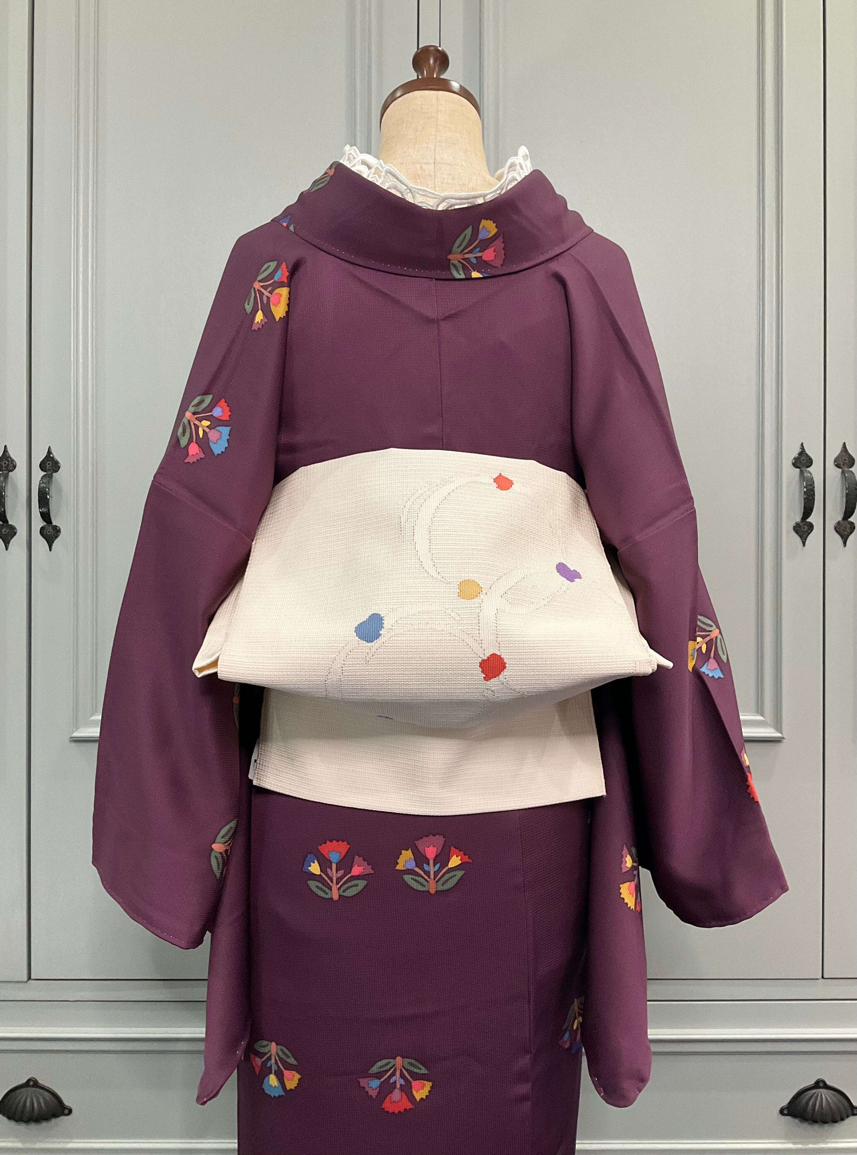 少し光沢のある、やわらかな生地感に、深みのある赤紫系の地色と、色とりどりの花模様がオシャレなこちらのお着物。