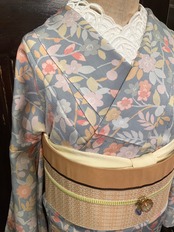 やわらかく、さらっとした生地感に、やさしいグレー系の地色とダスティーパステル調のカラーで描かれた花模様が素敵な、こちらのお着物。