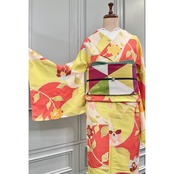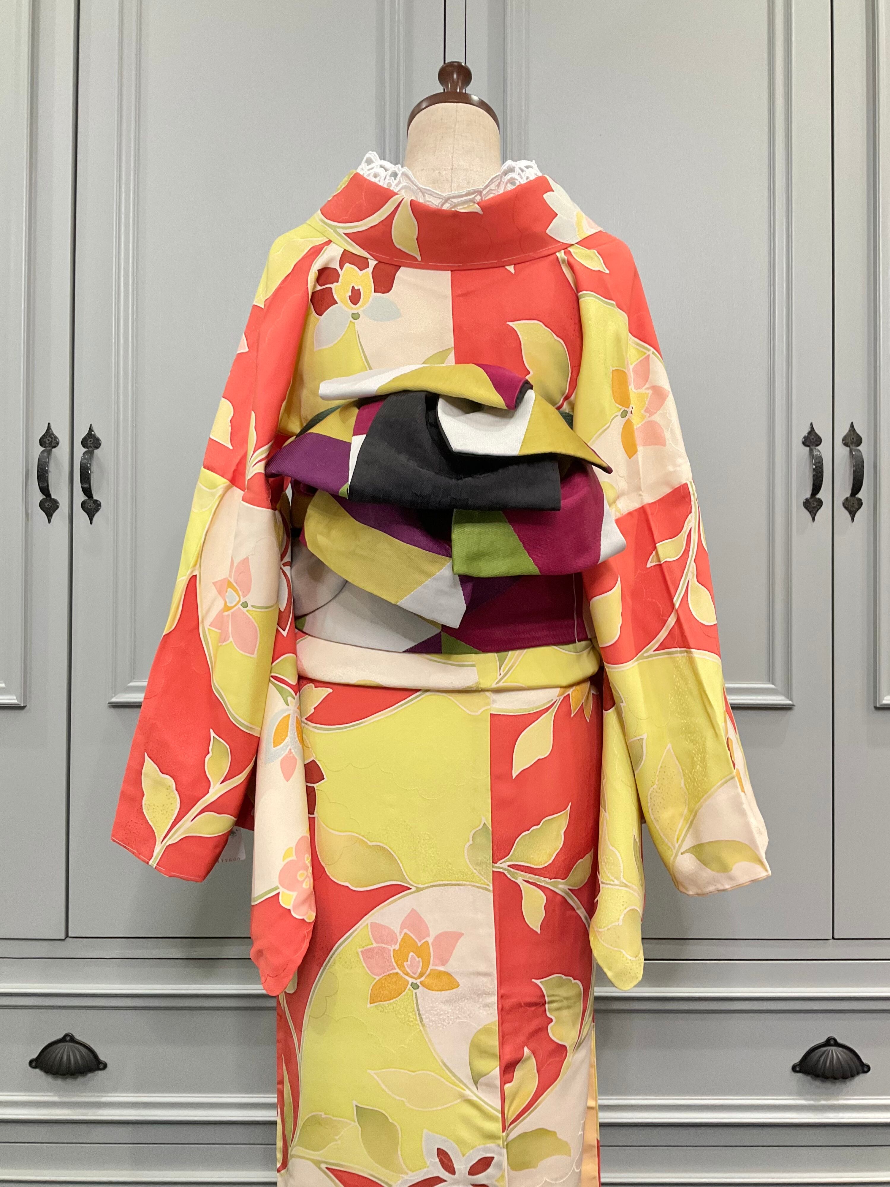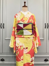 レッド系、イエロー系、ホワイト系の地色に、花模様がデザインされた、小紋着物です♪