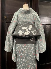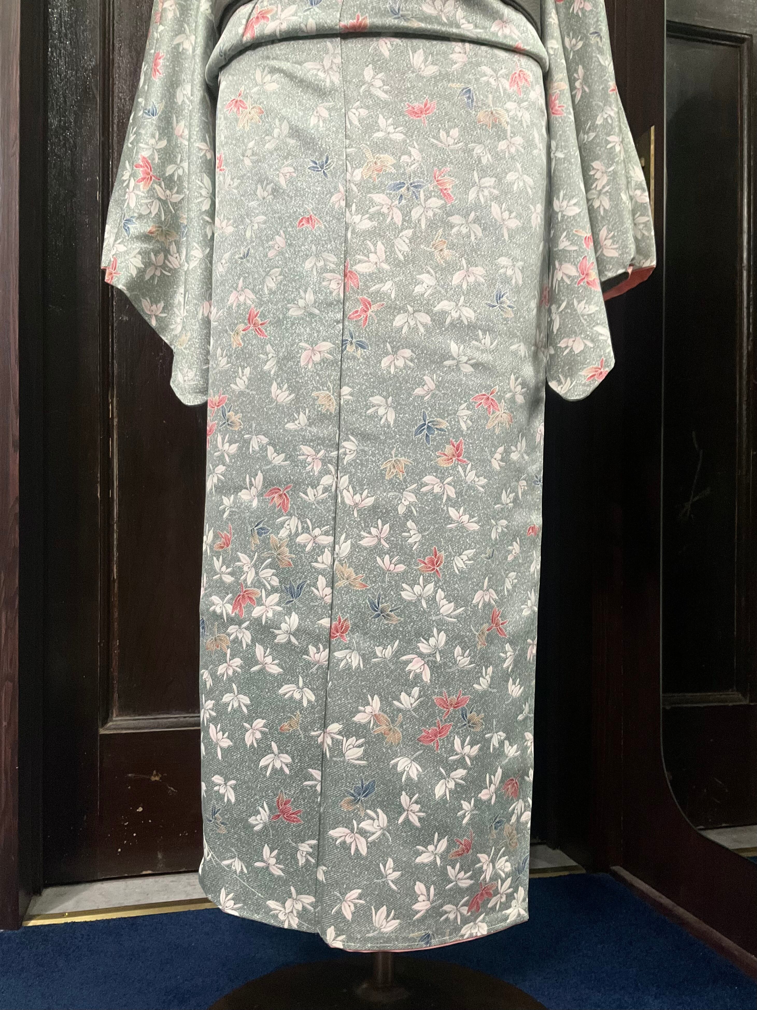 ロング*スモーキー・パール・グリーン ひらひら花浮かぶ*リサイクル小紋キモノ 0685