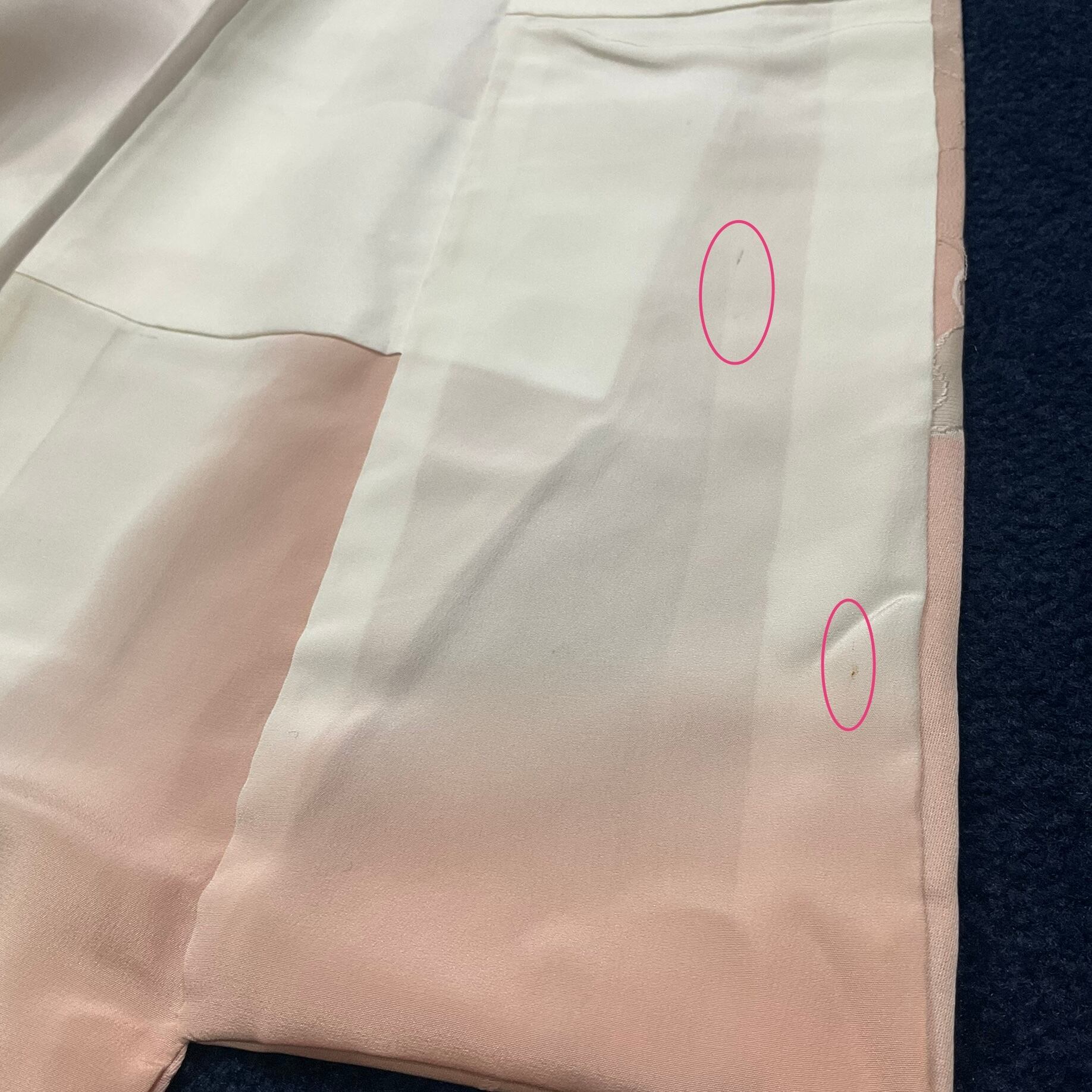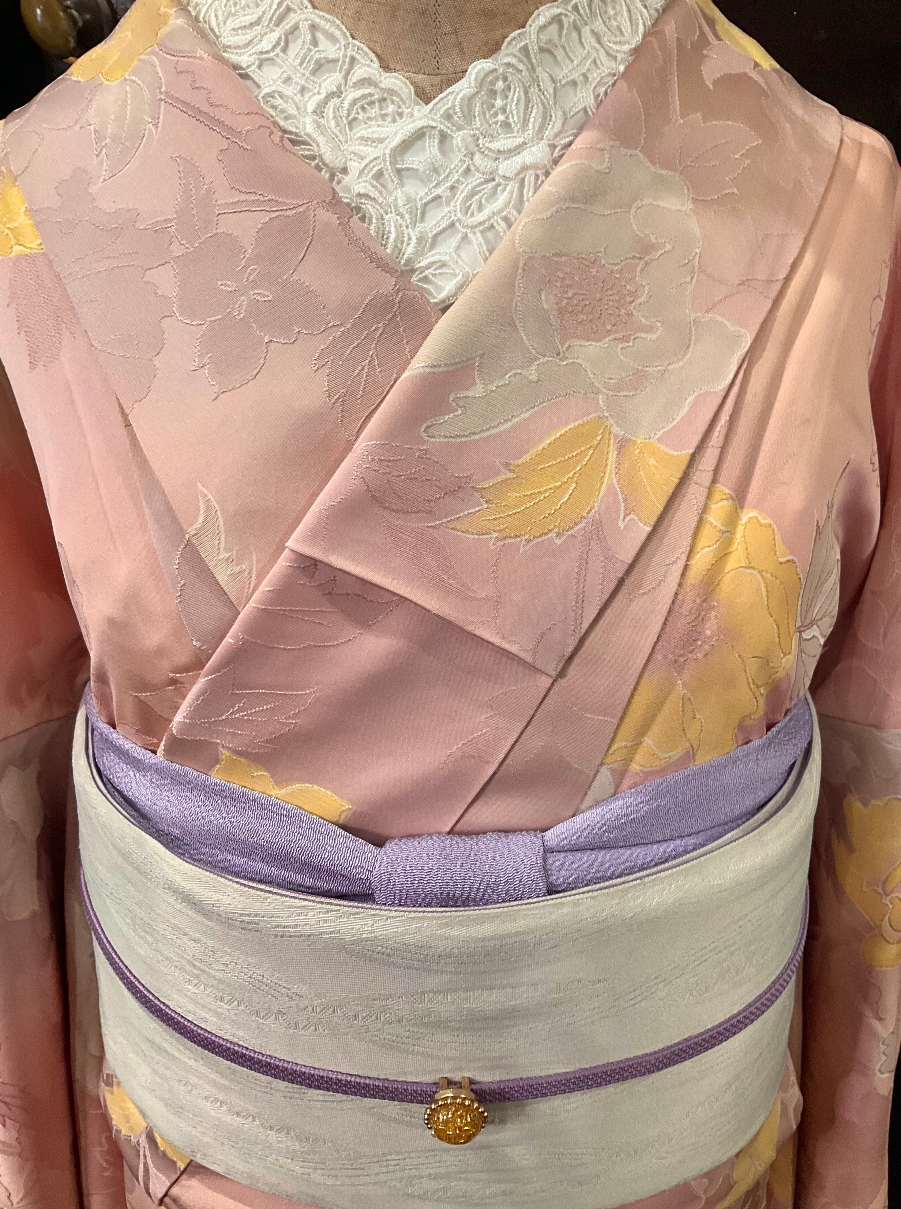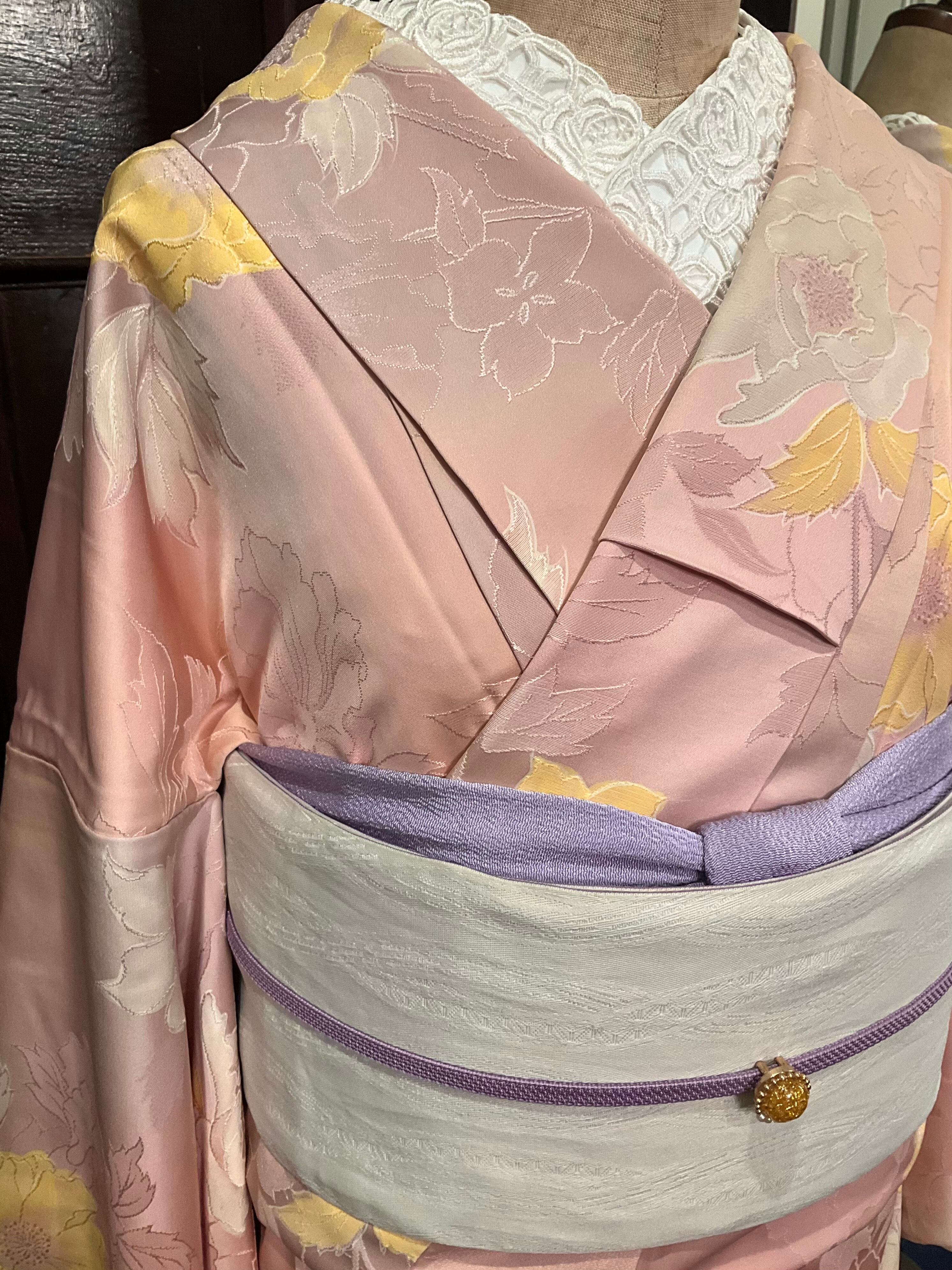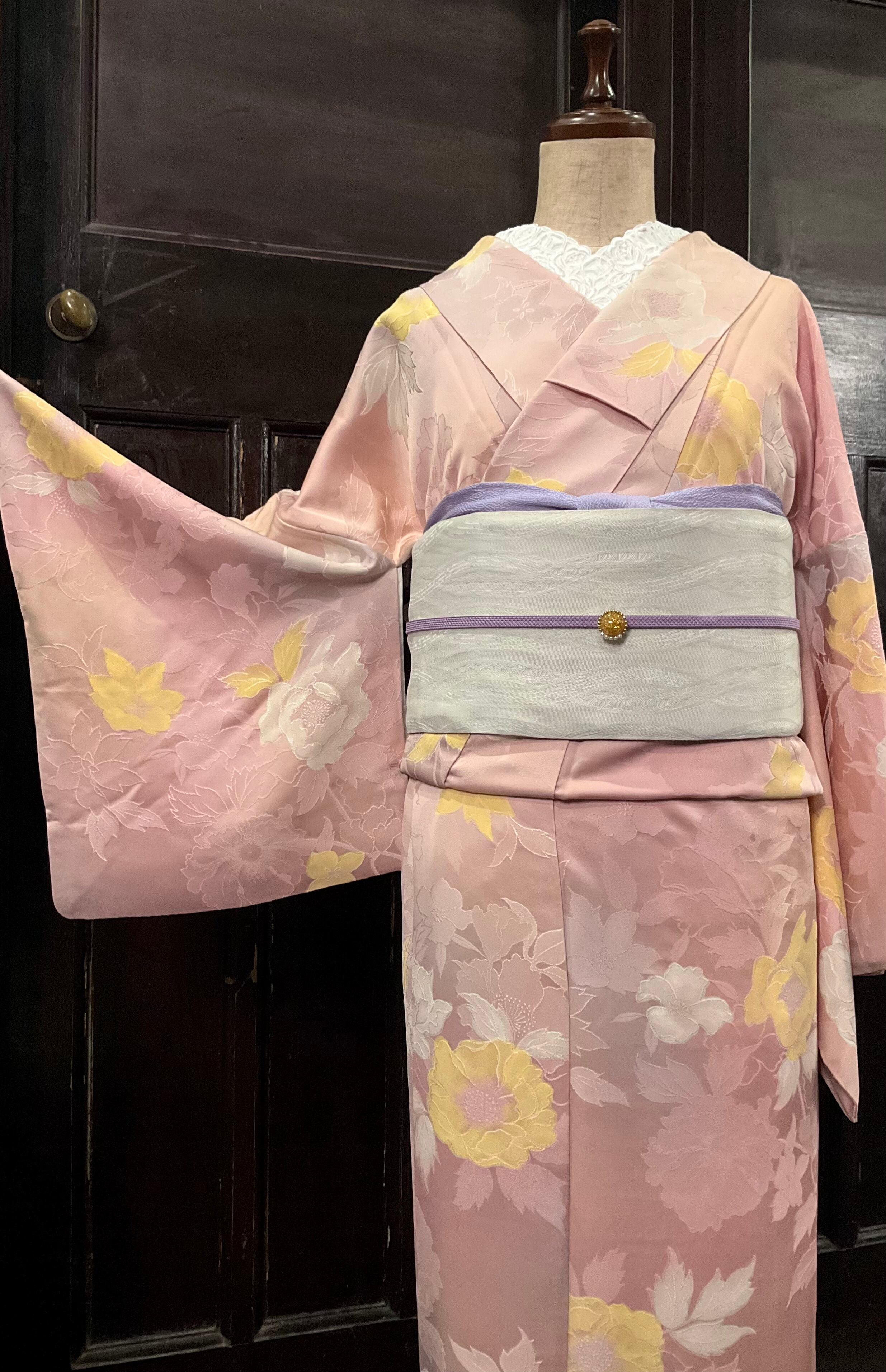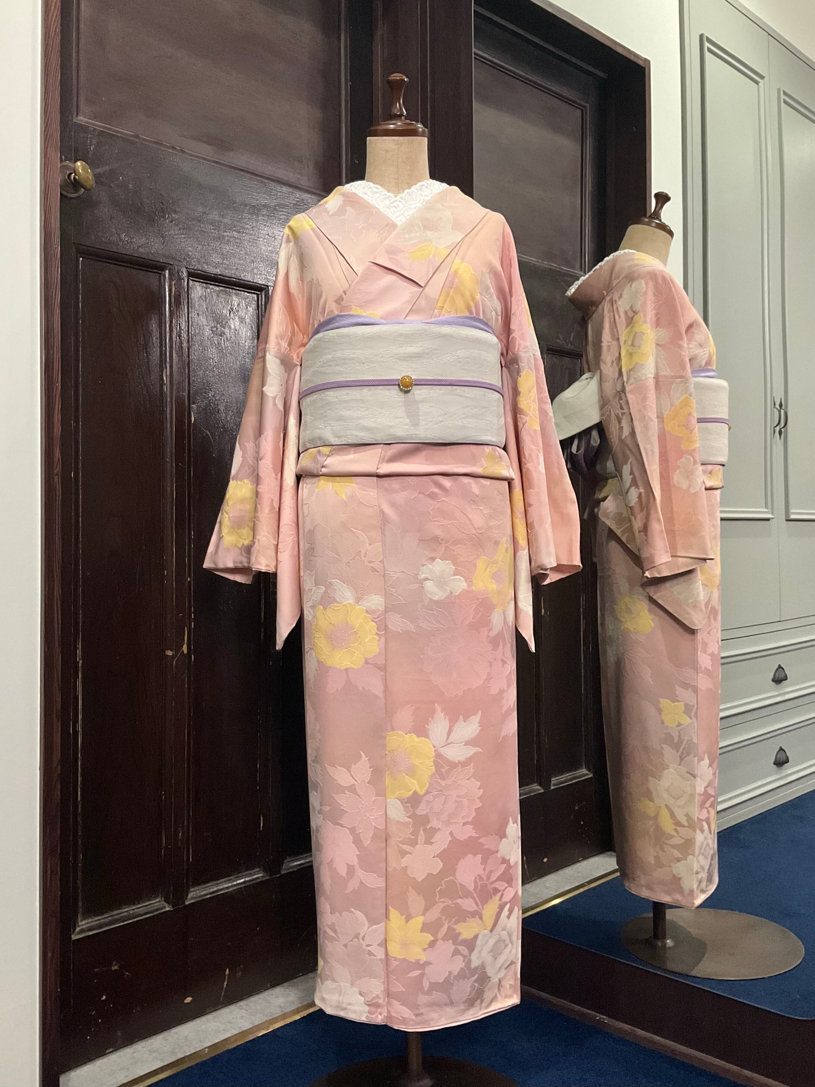 やわらかなピンクの地色が、とても綺麗なこちらのお着物。