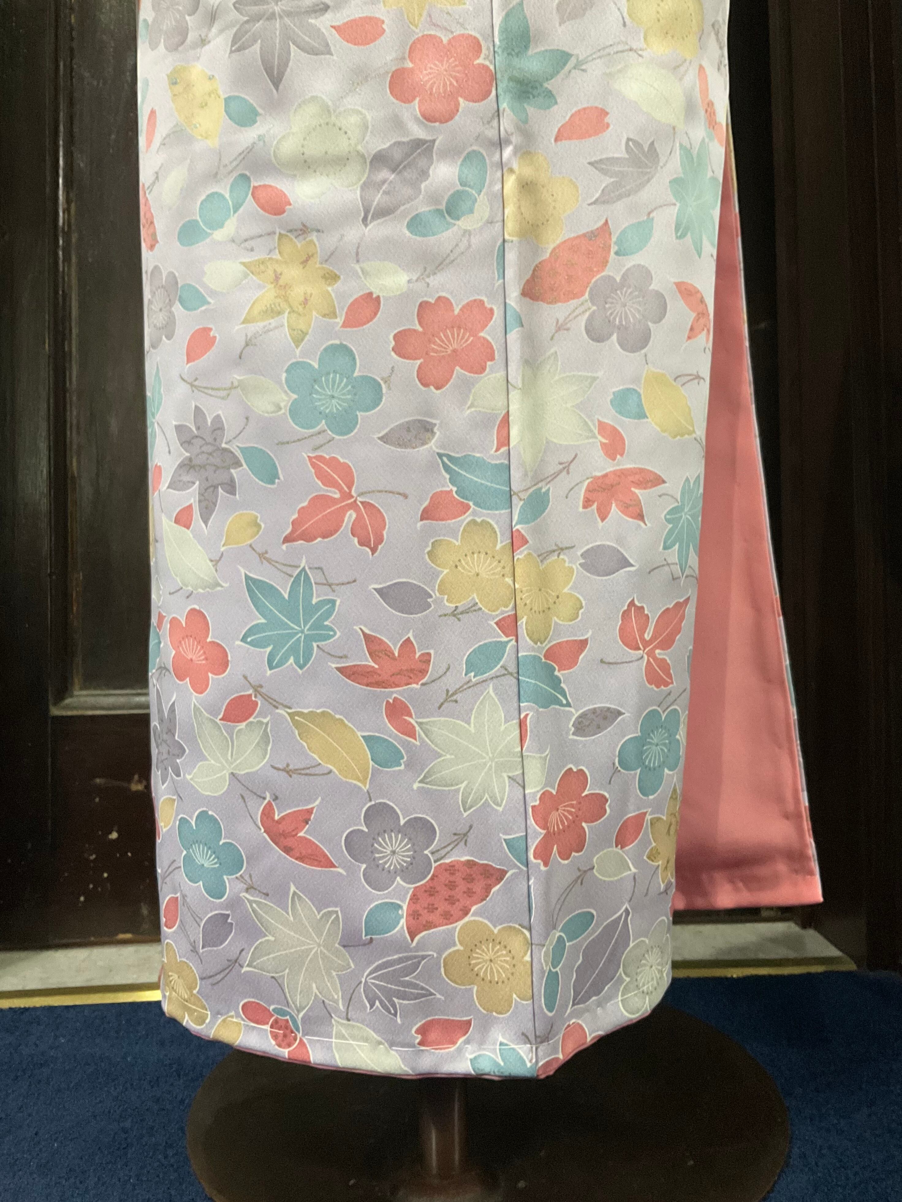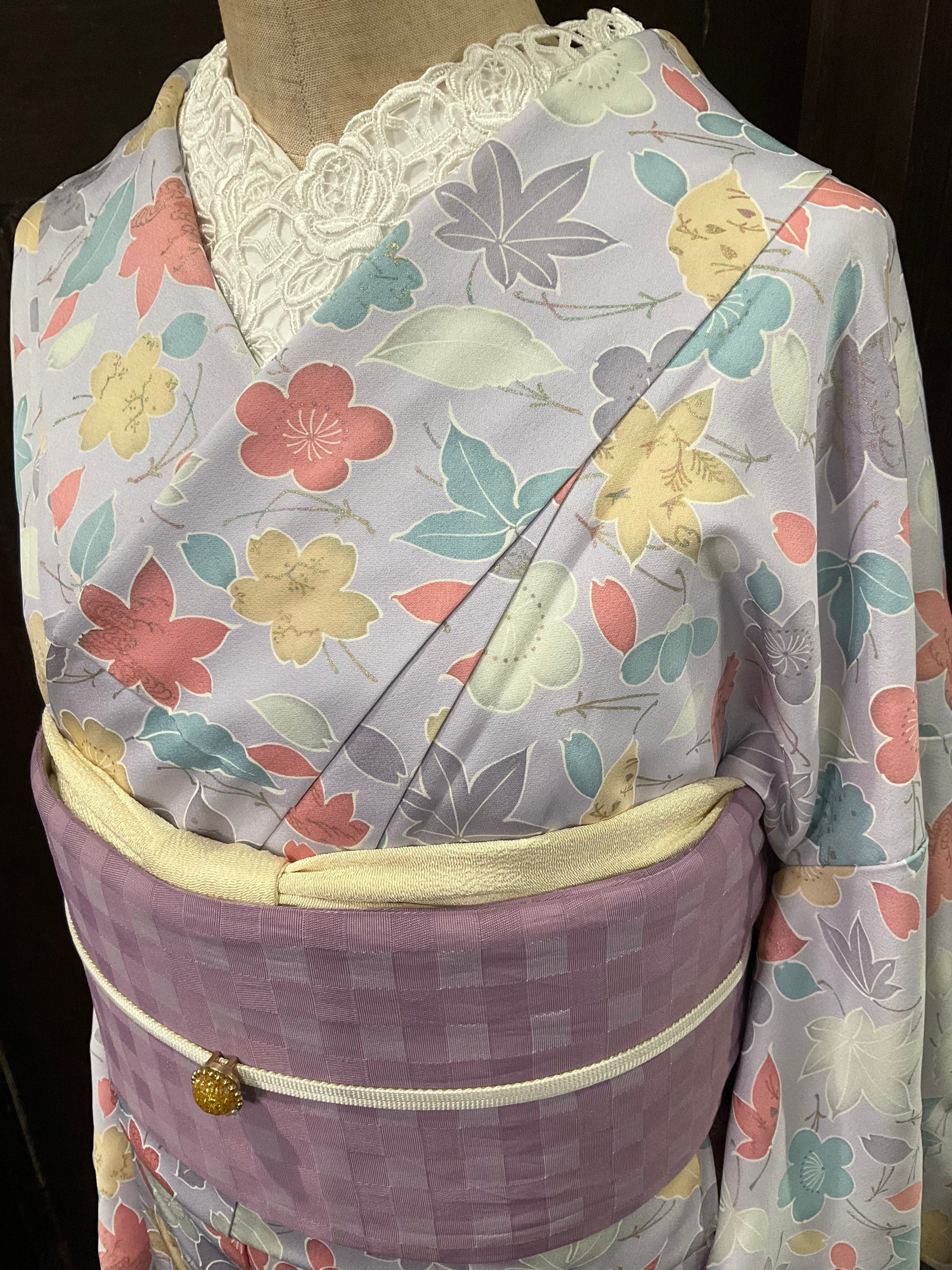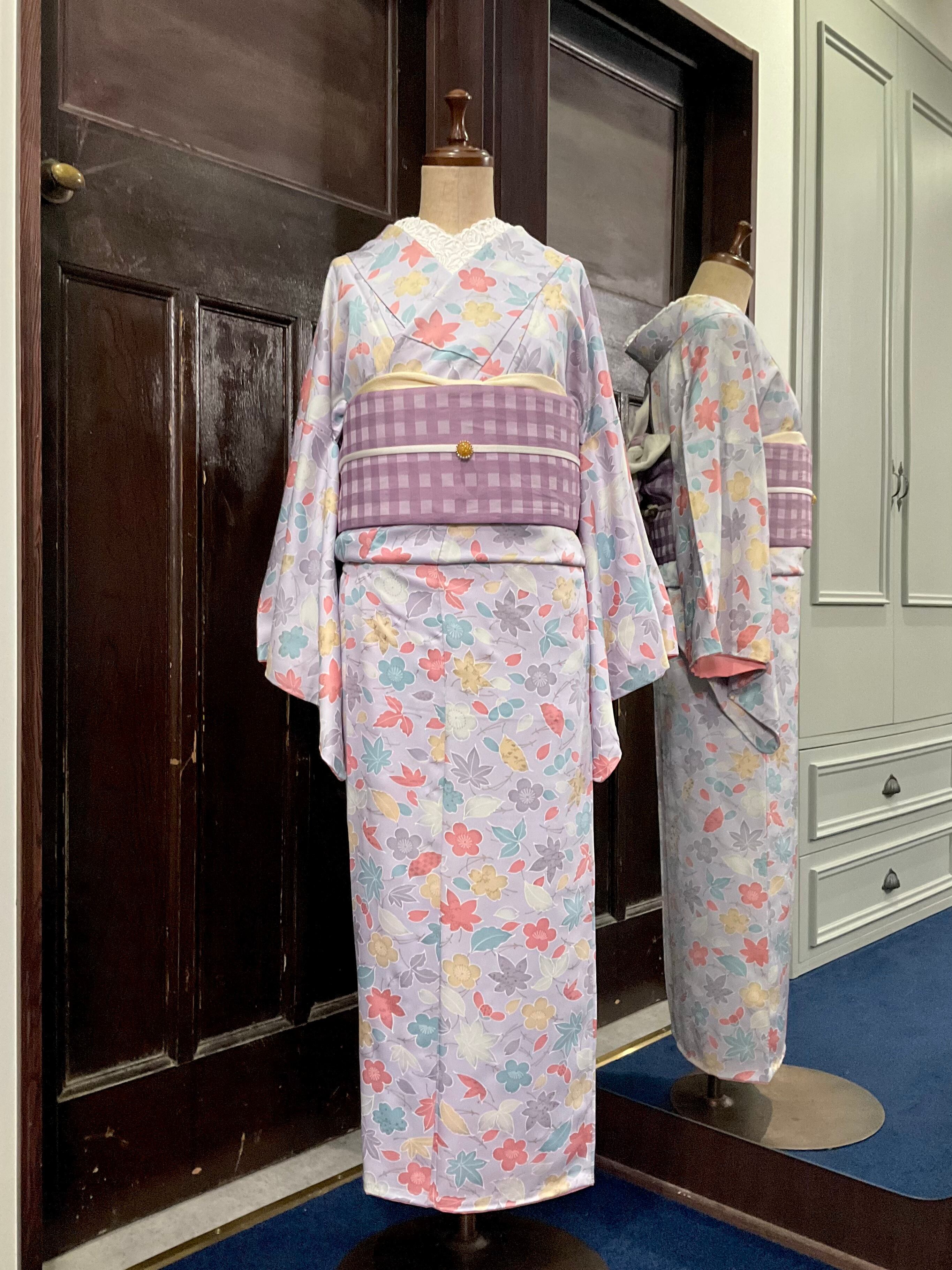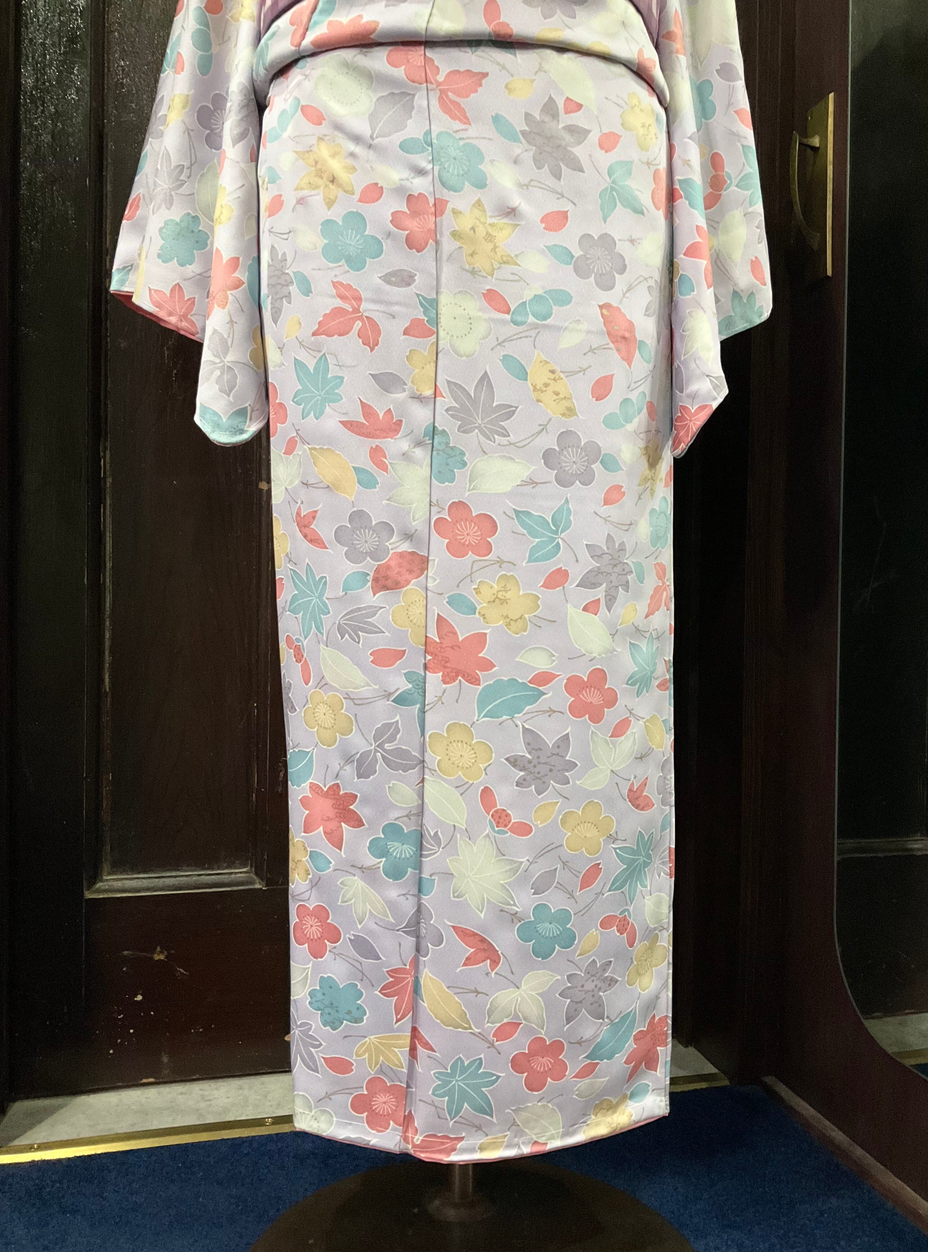 淡いパープルの地色に、花や葉模様がデザインされた、小紋着物です♪