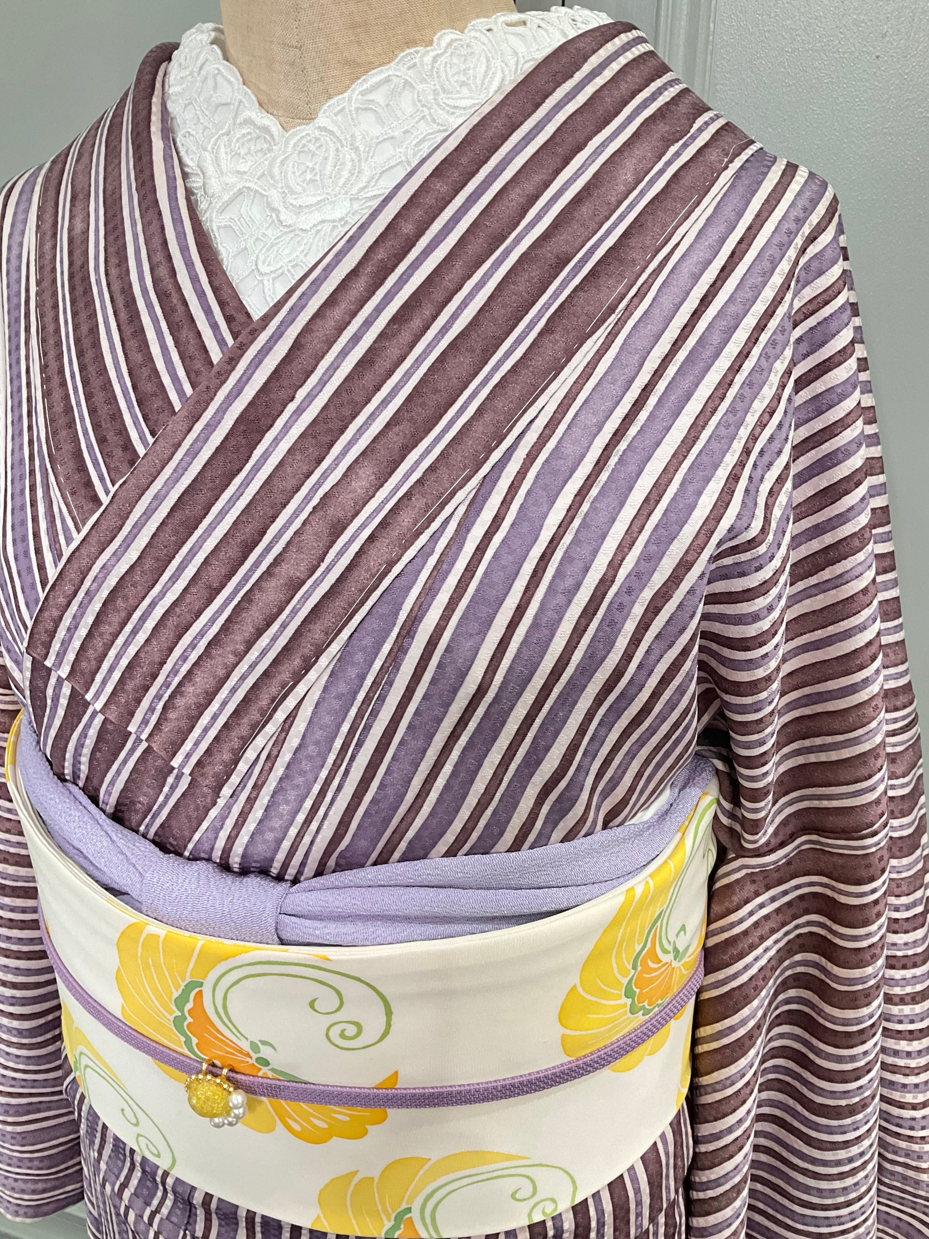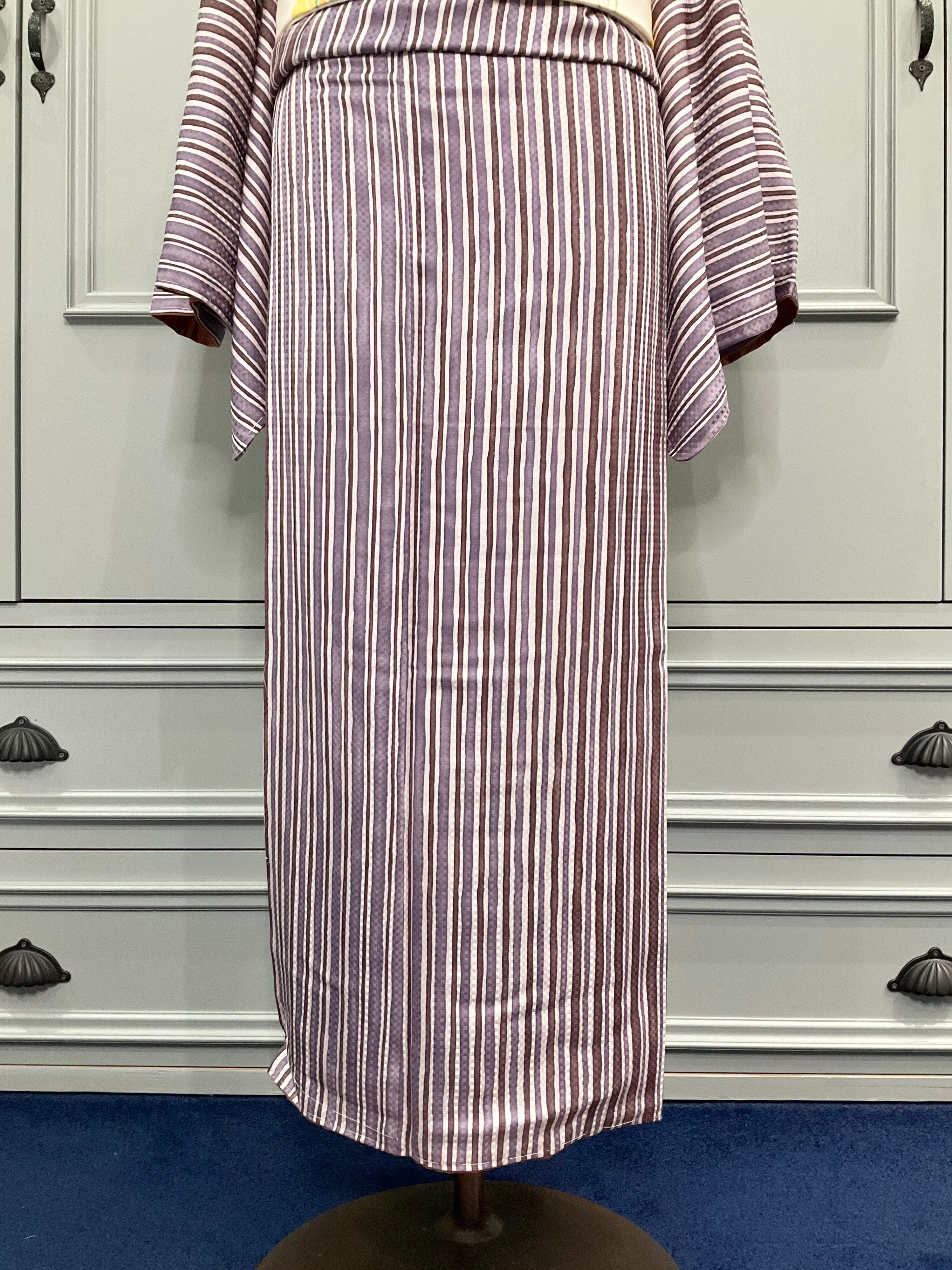 パープル×あずき系カラーのストライプ模様が素敵な、小紋着物です♪