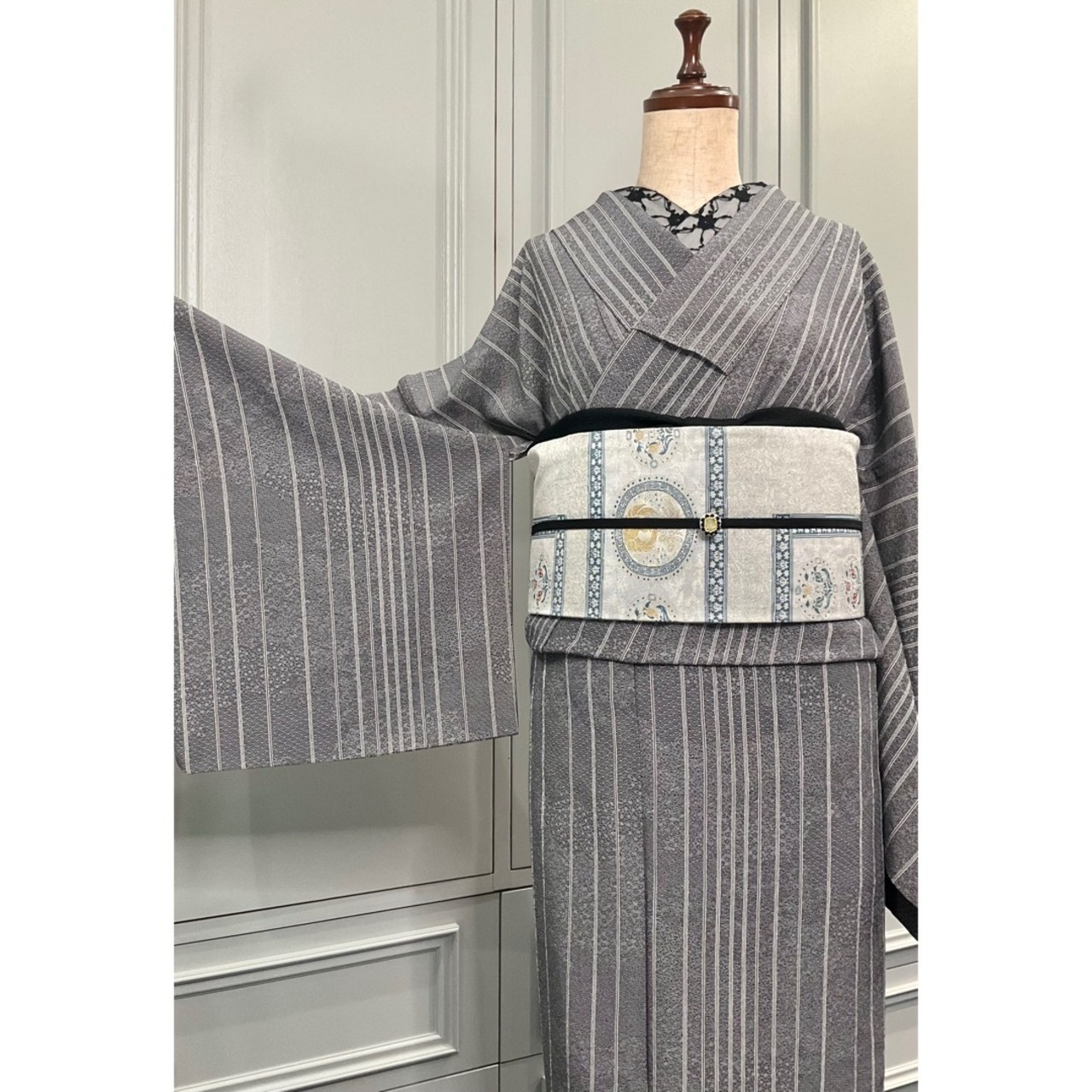 モノトーンカラーに、ストライプ×細かなデザインが素敵な、小紋着物です♪