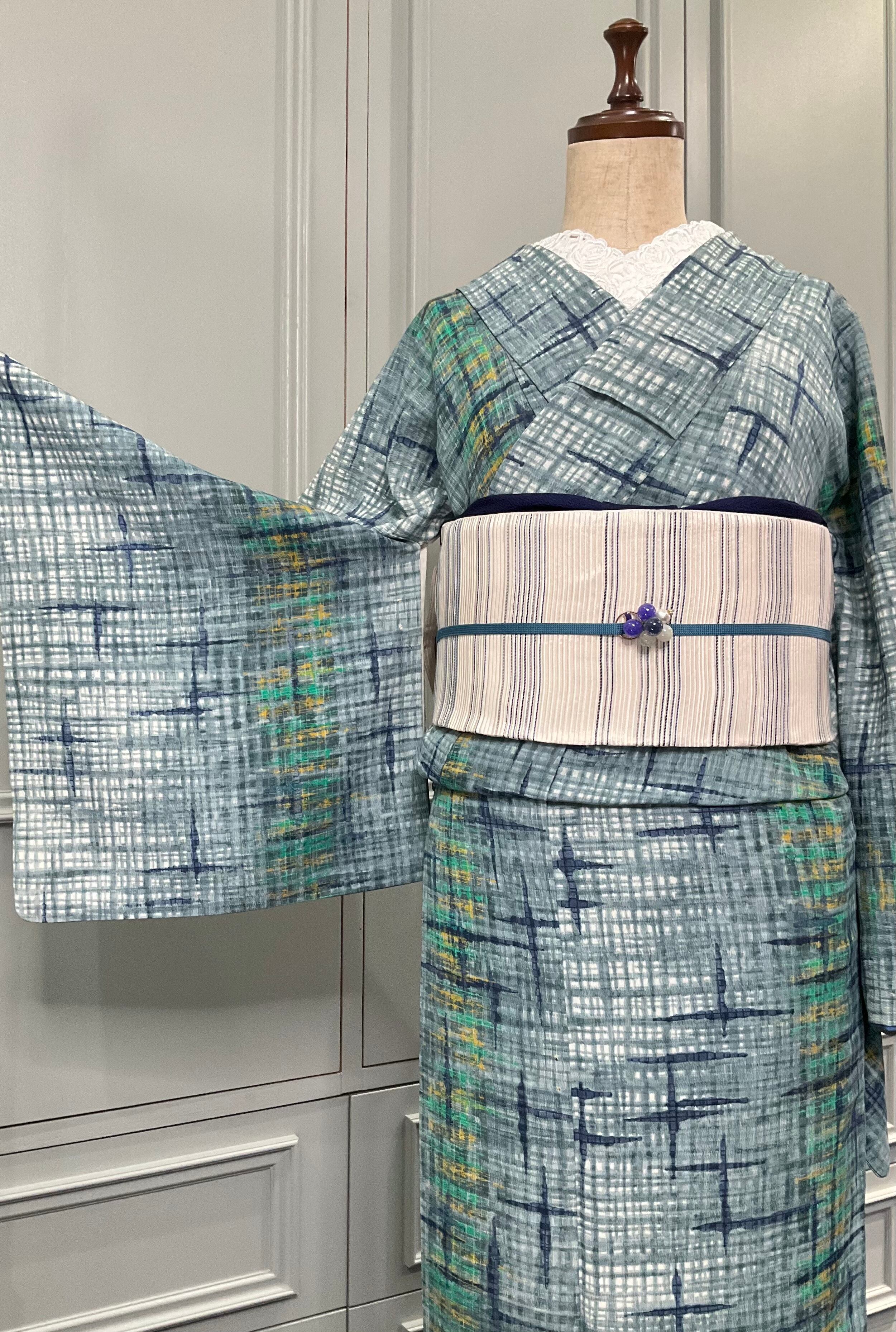 水彩絵の具を使って、手描きで描かれたようなタッチが、やわらかで優しい印象のこちらのお着物、ツイードのようにも見えてお洒落✨