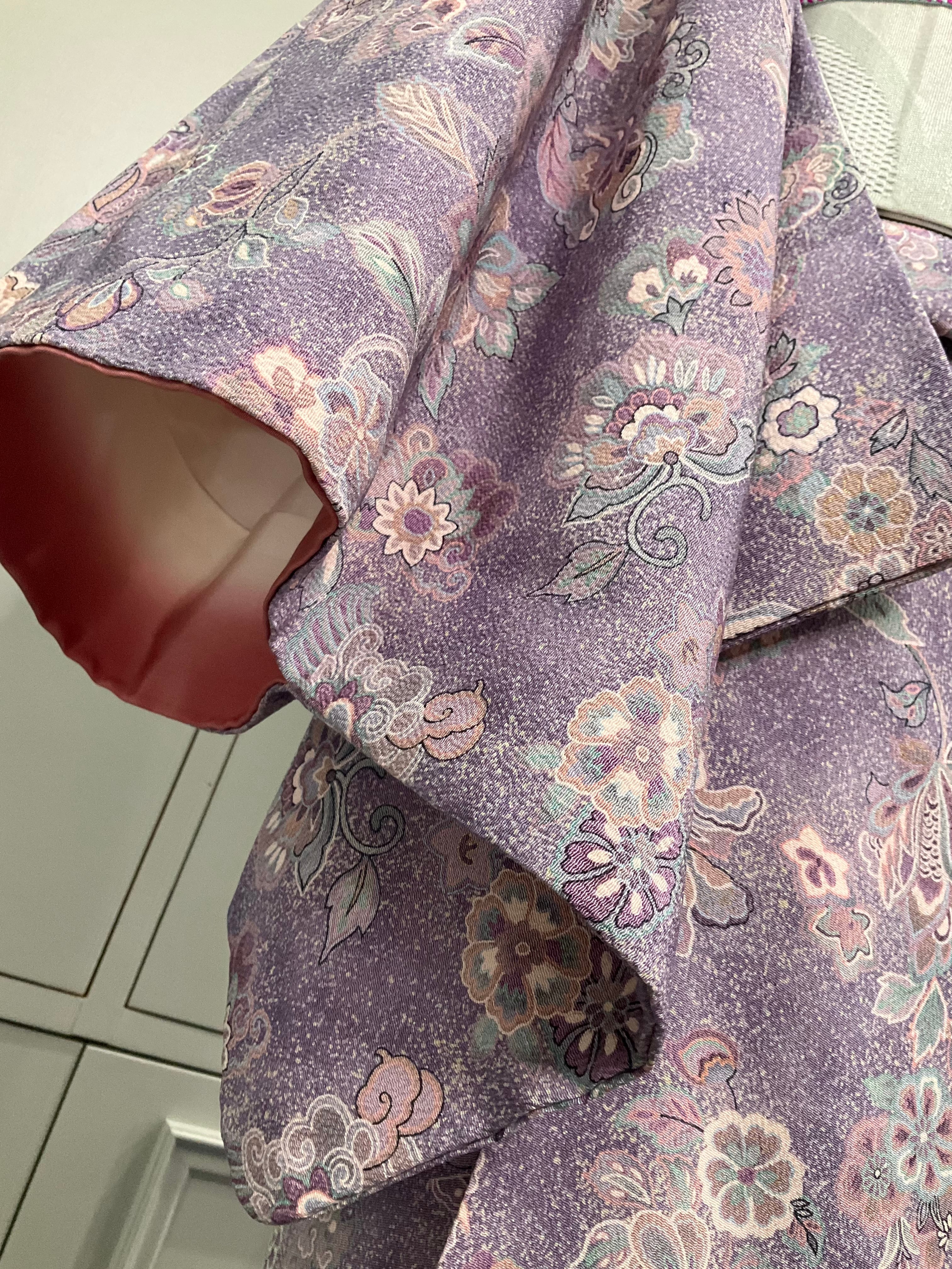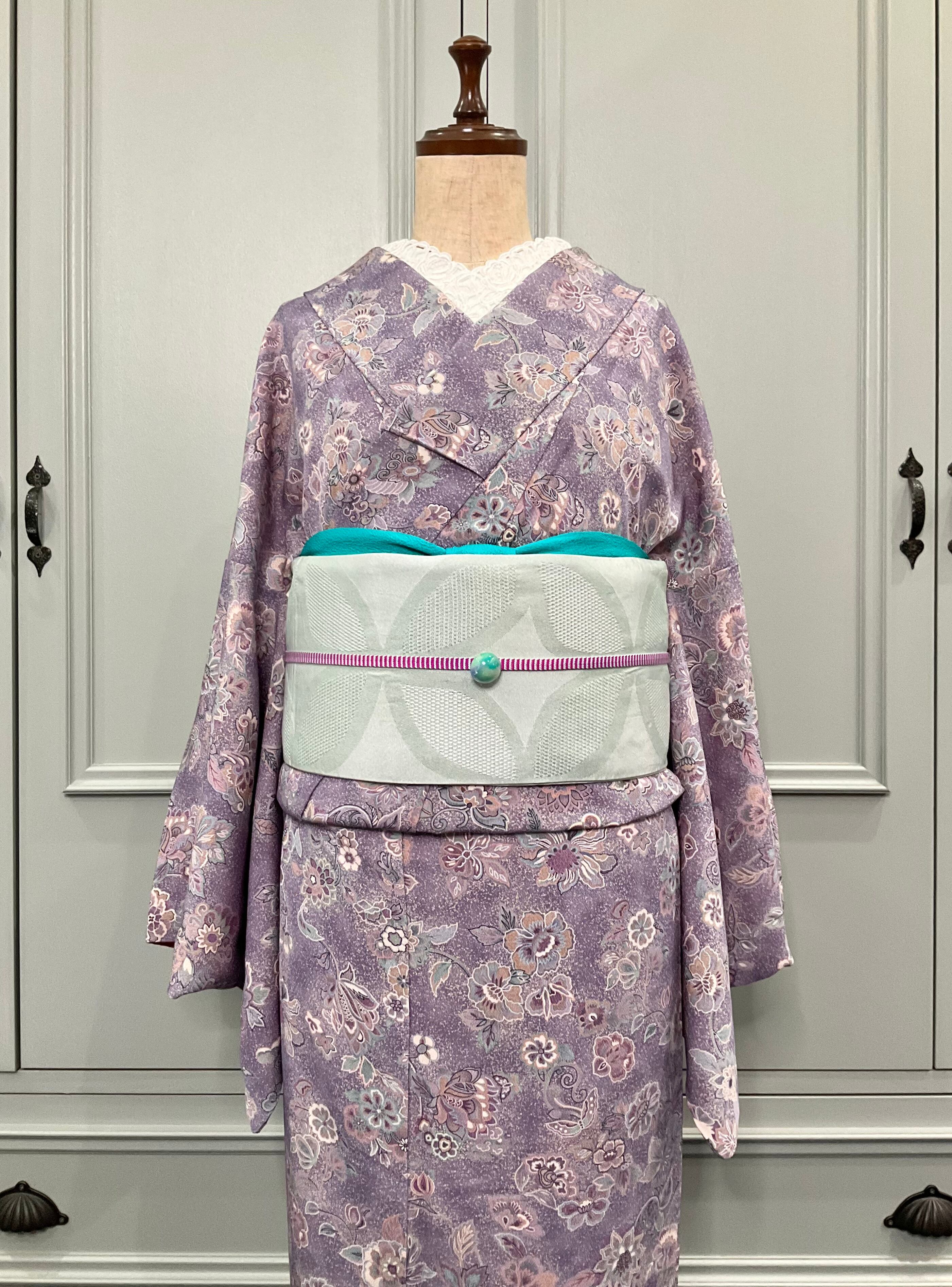 落ち着いたパープル系の地色に、花模様がデザインされた、小紋着物です♪