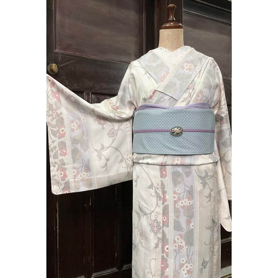 オフホワイト系の地色に、縦ラインと花模様がデザインされた、単衣の小紋着物です♪