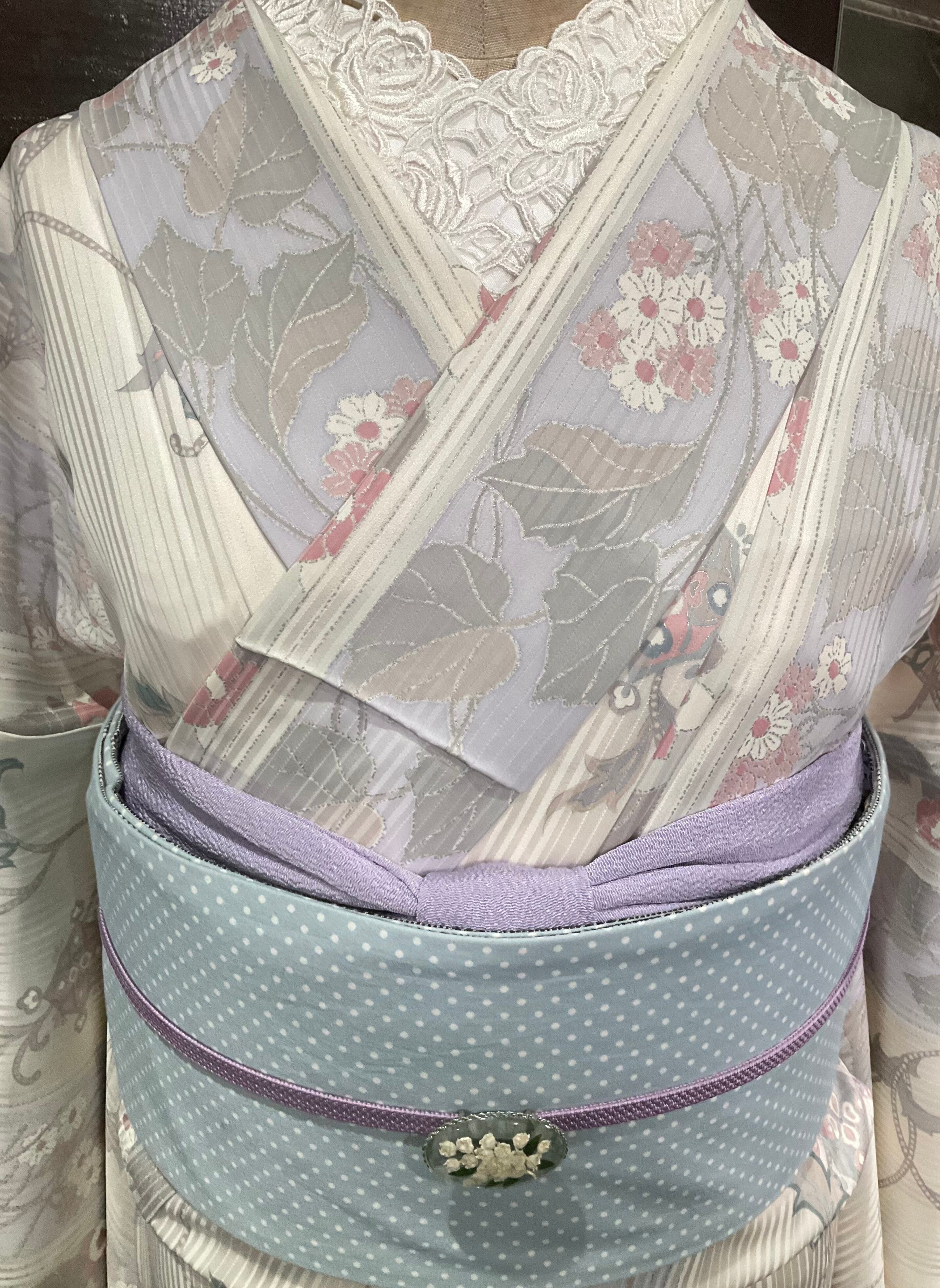 やわらかく、ほんのり光沢感のある生地感に、ストライプの織地が、どこかヨーロッパの雰囲気を漂わせている、こちらのお着物。