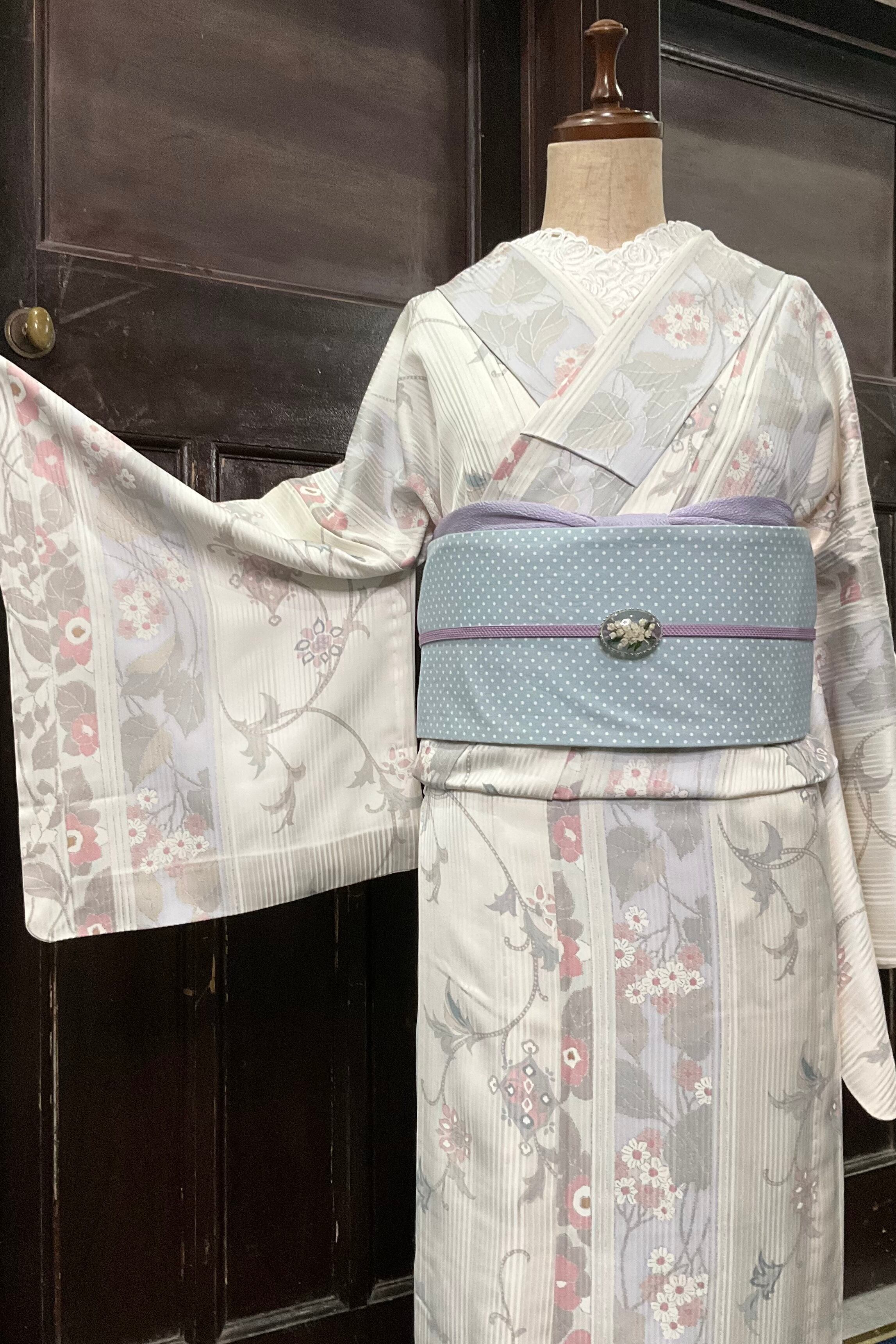 ロング*単衣*オフホワイト ヨーロピアン・テイスト・ストライプ×フラワー*リサイクル小紋キモノ 0709