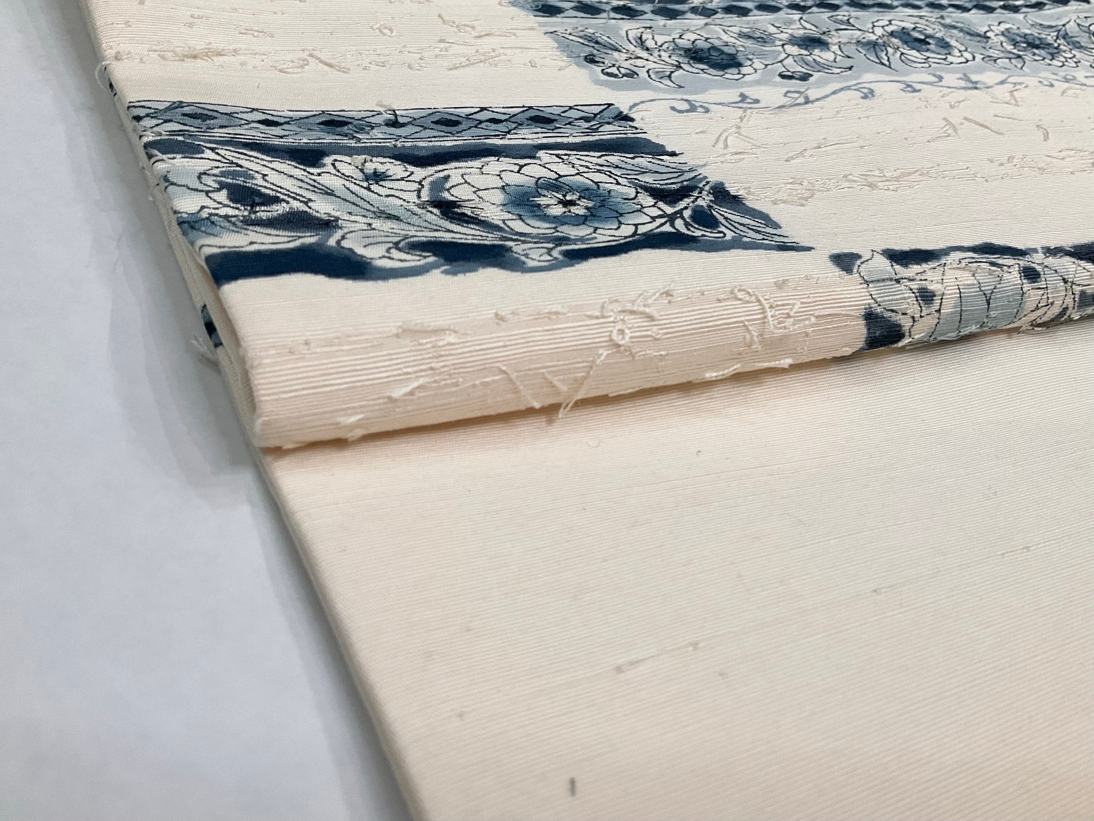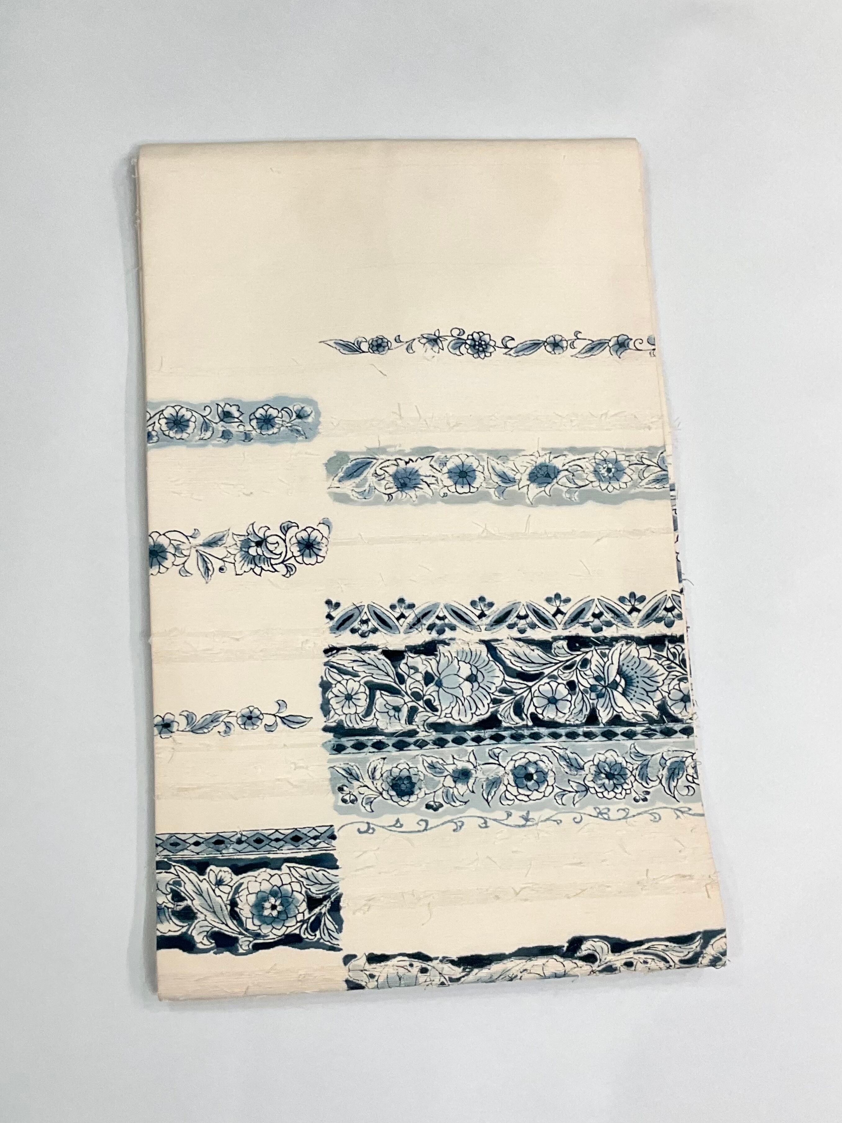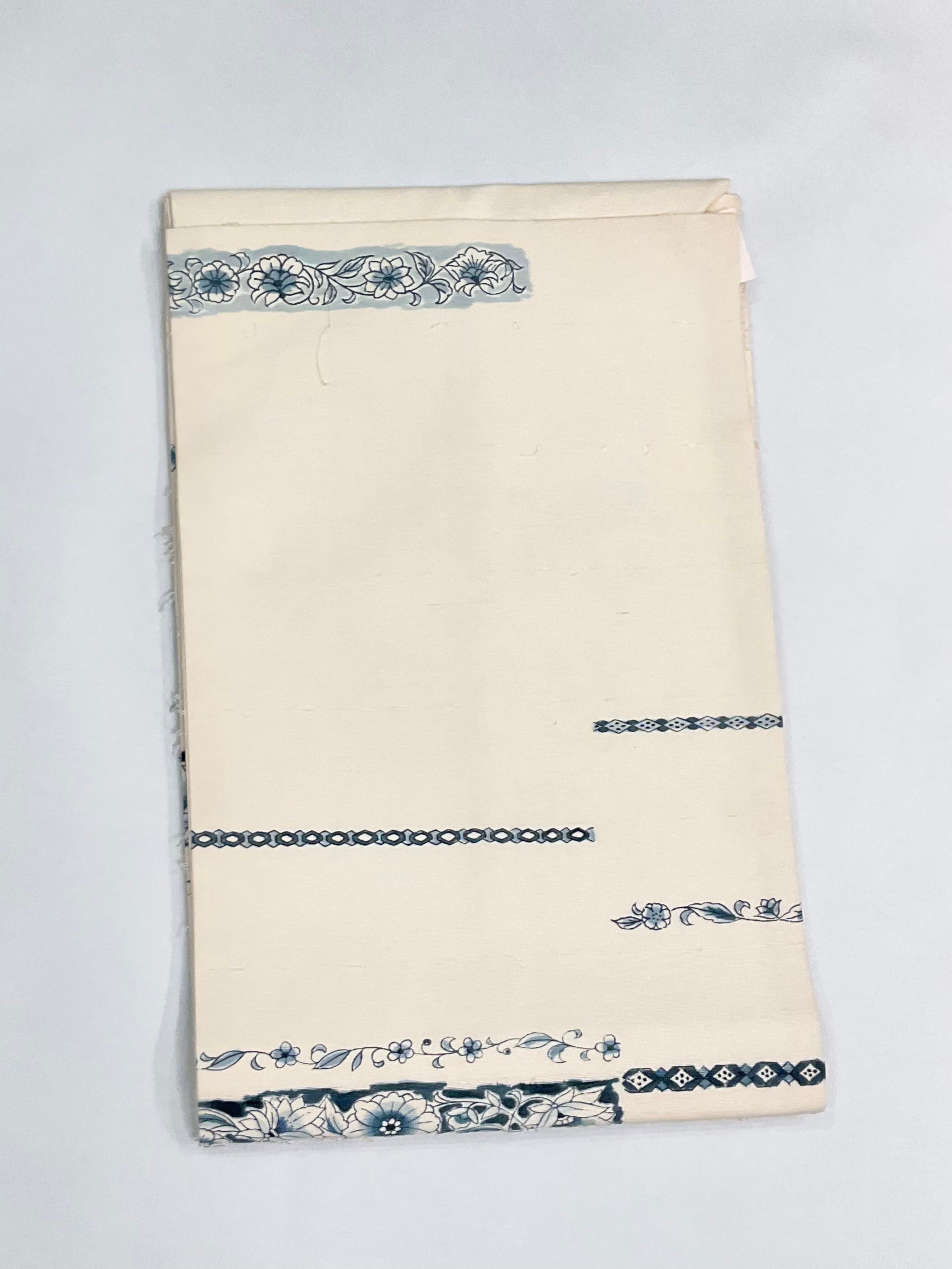 アイボリーの地色に、ブルー系で描かれた花模様が素敵な、未使用の名古屋帯です♪