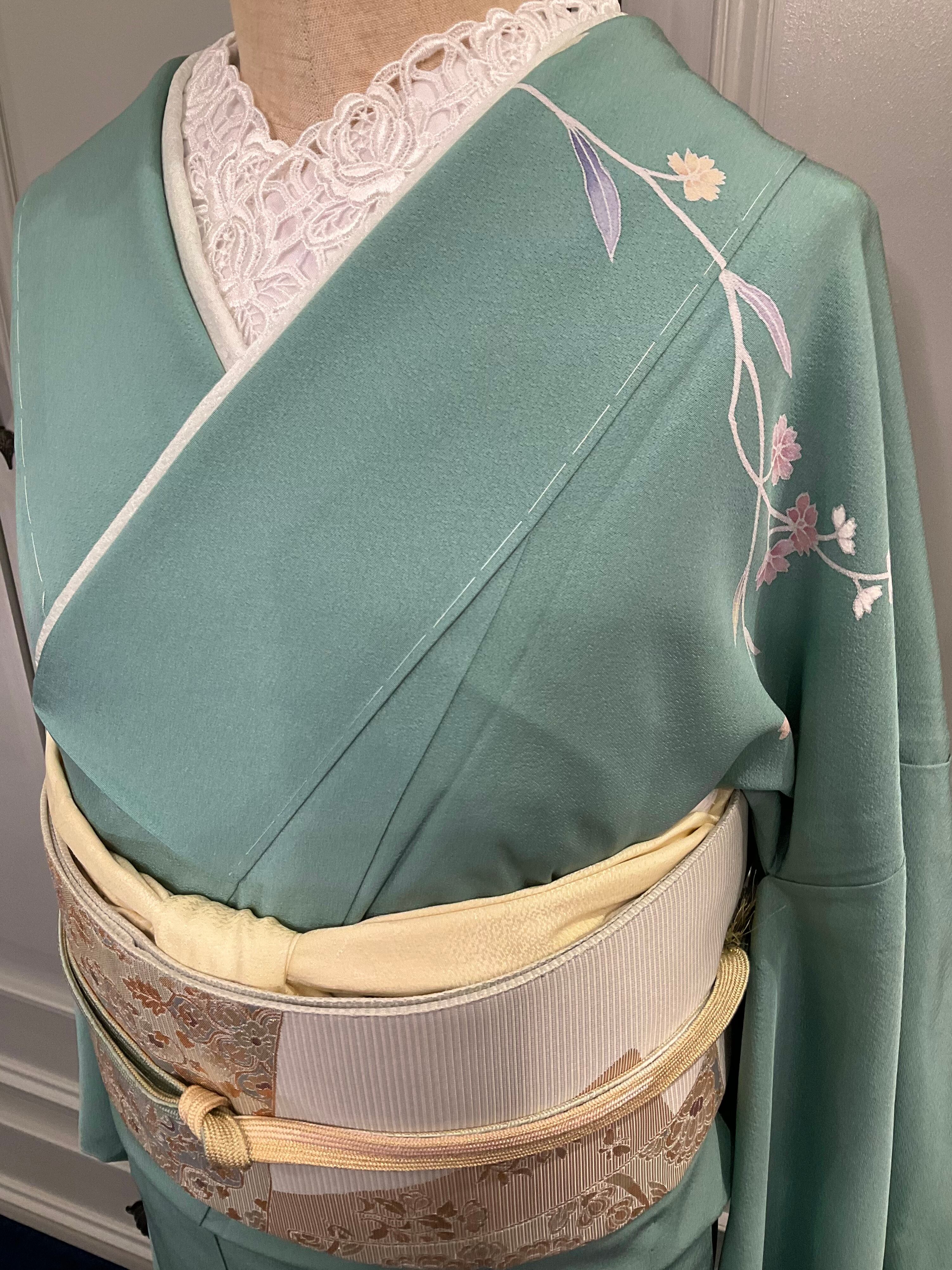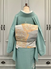 少しくすみの入った、落ち着いたグリーン系のお色が素敵なこちらのお着物。