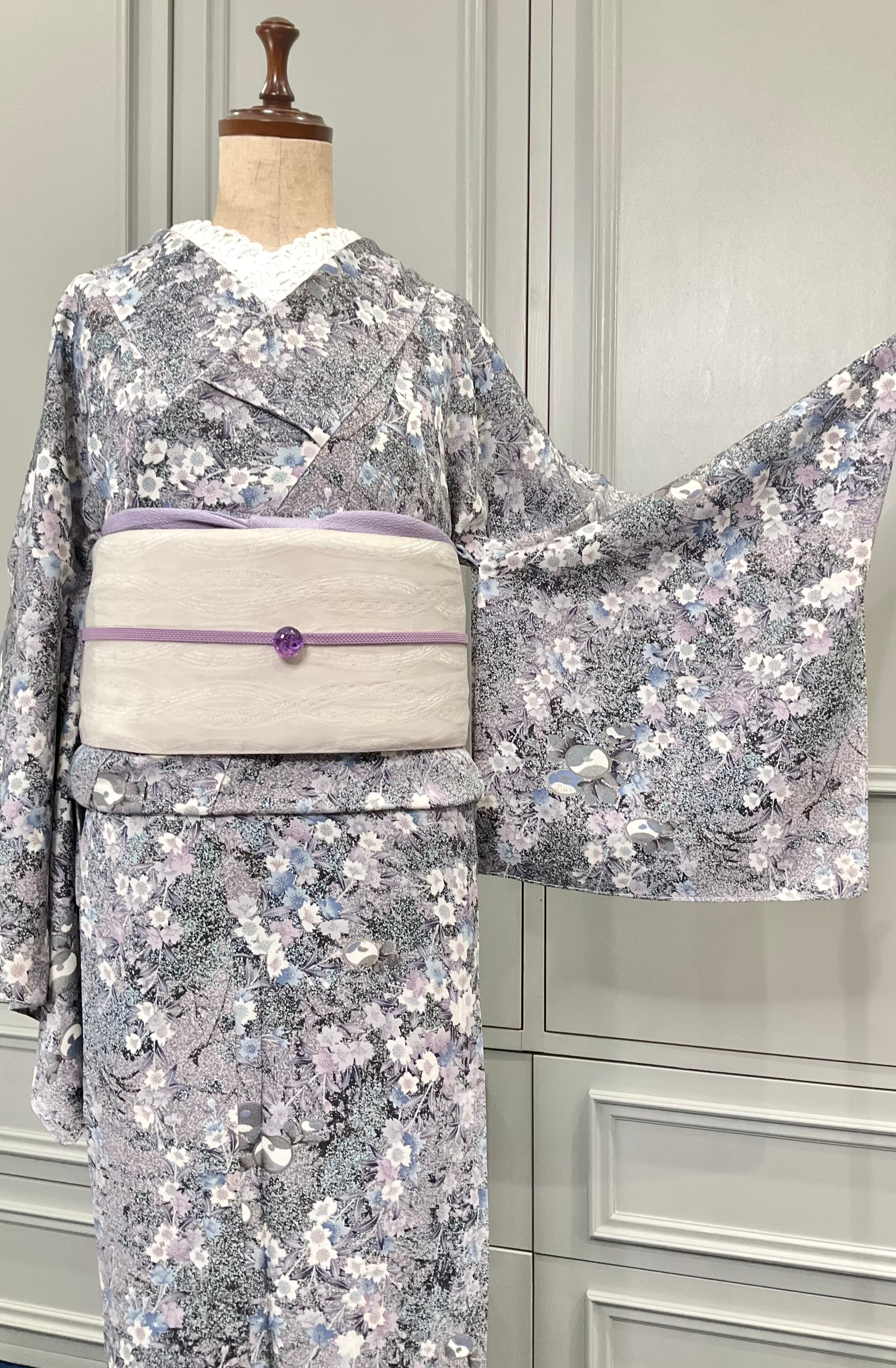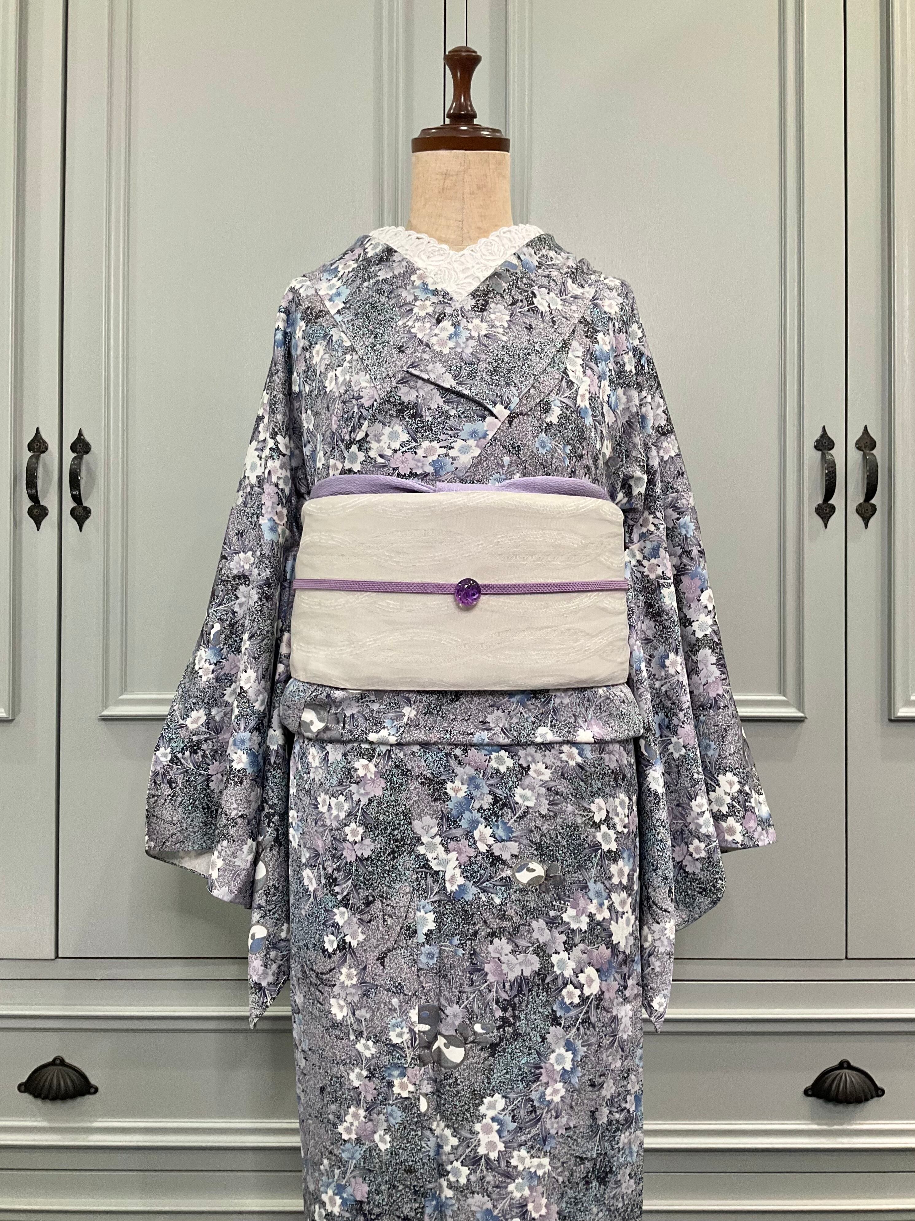 ブルー系やパープル、寒色系を中心にデザインされたこちらのお着物。