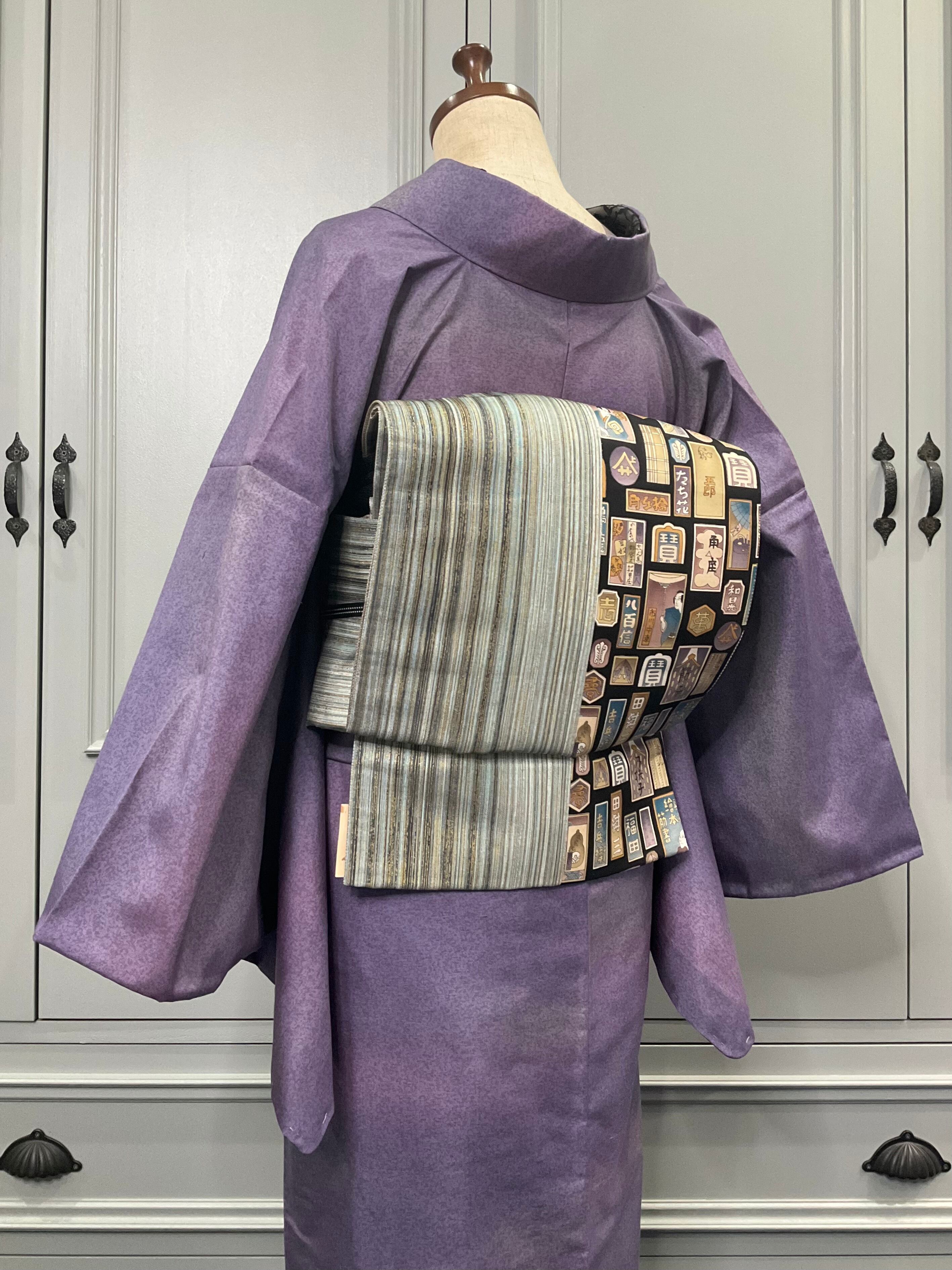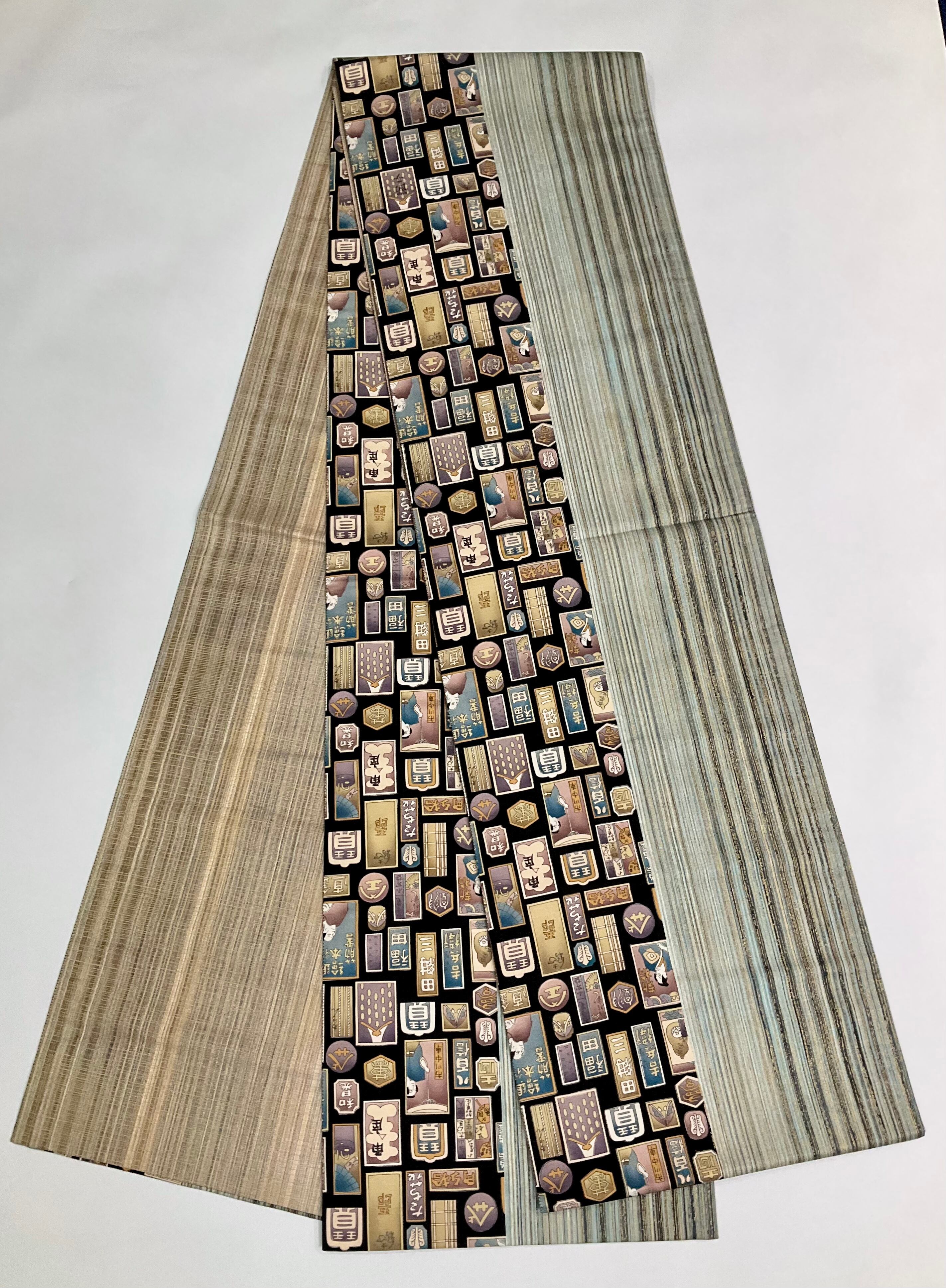 またこちらの名古屋帯、お太鼓部分を見ていただくとわかりやすいのですが、右側が歌舞伎の柄、左側がストライプになっているんですね。