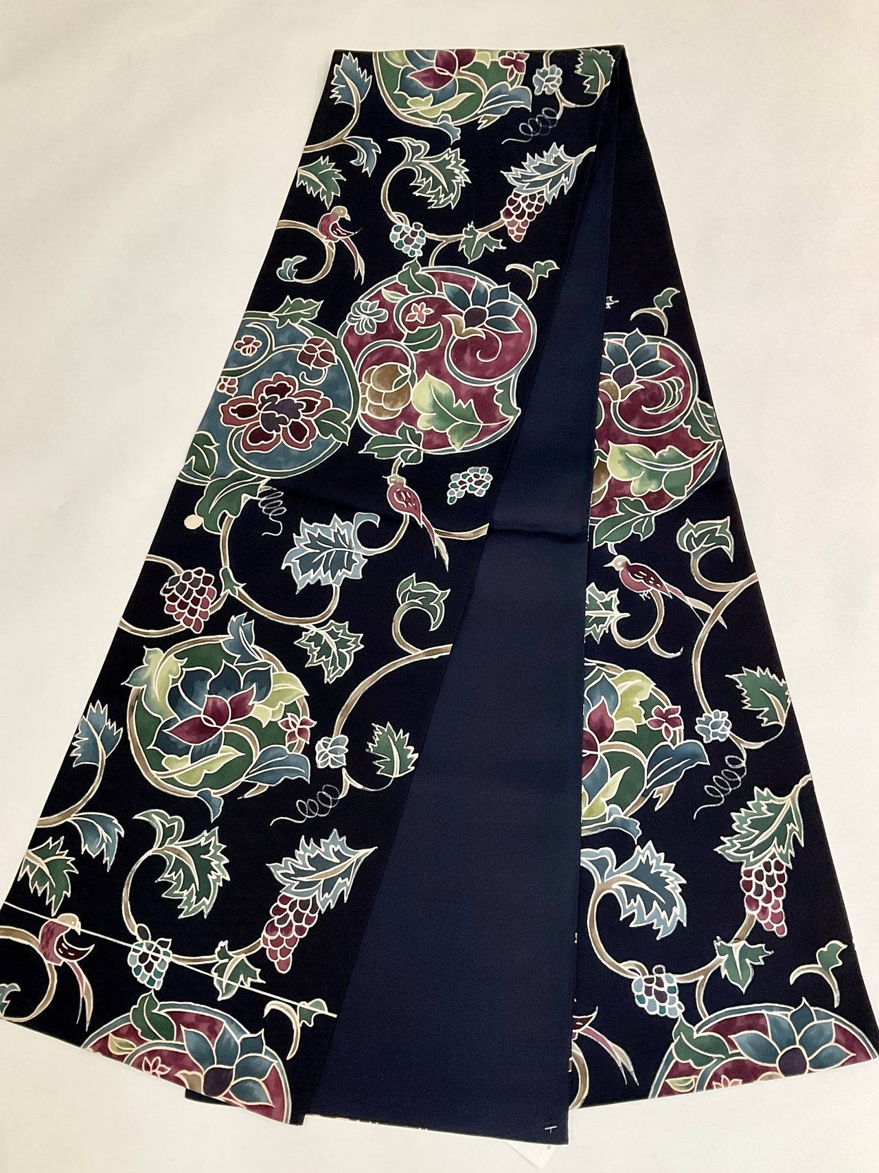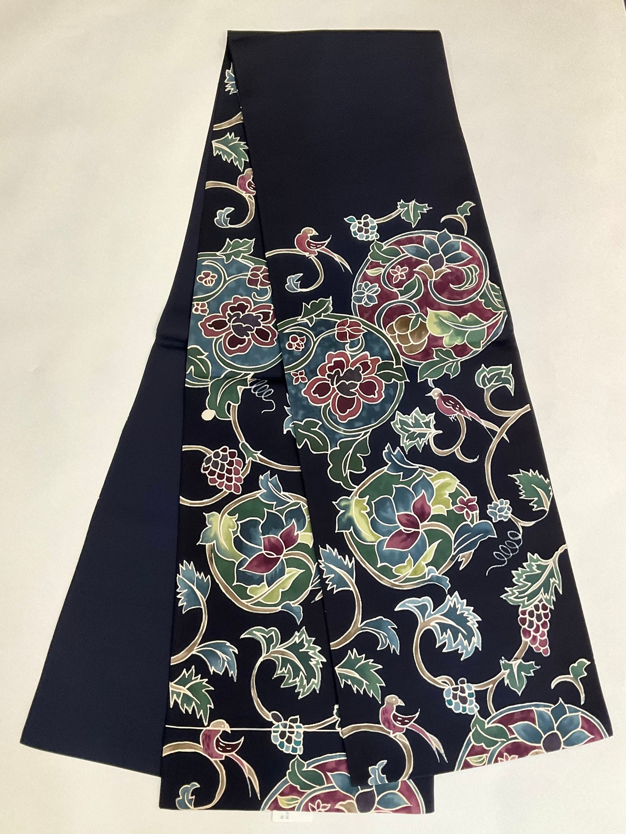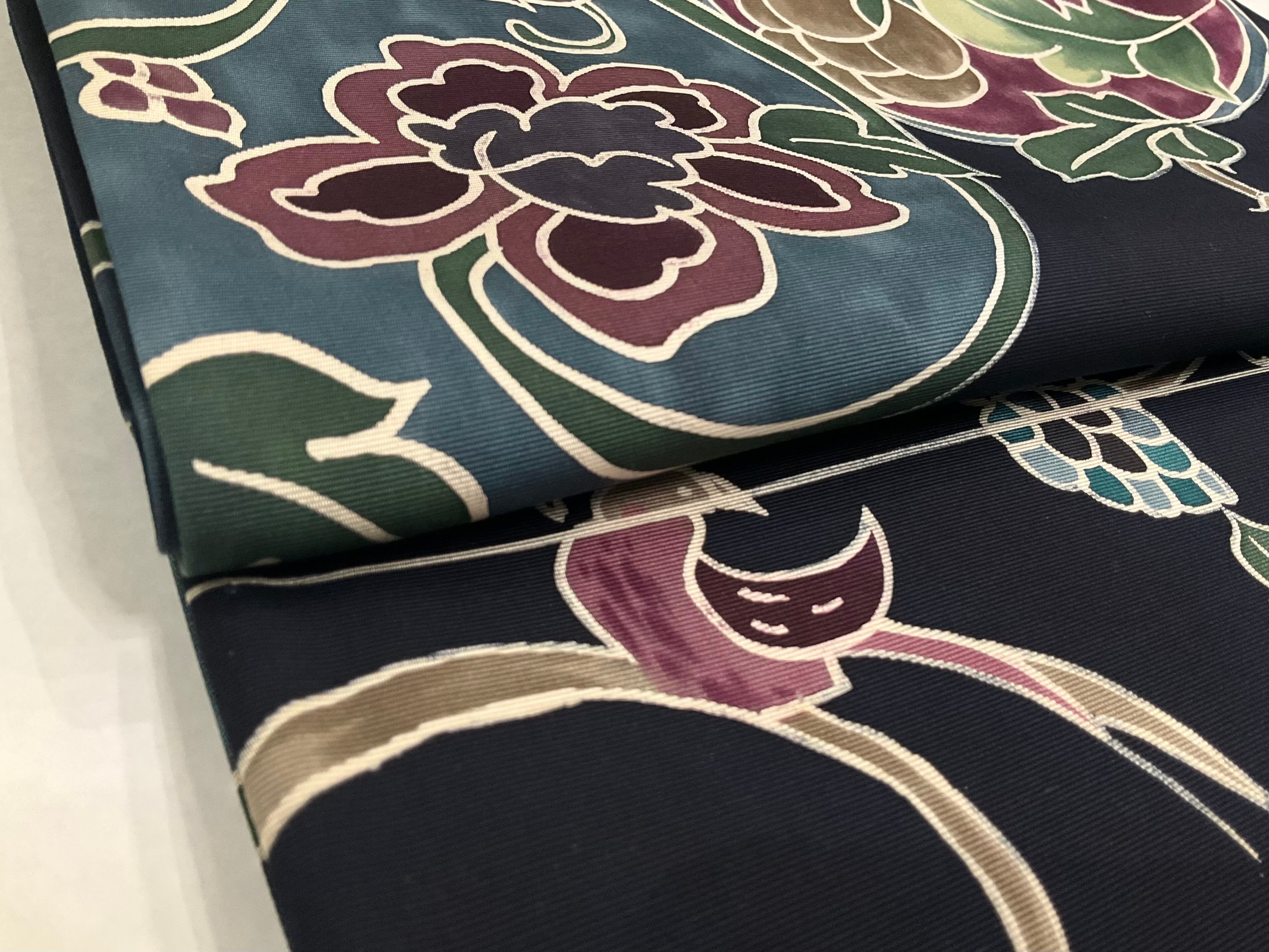 ブラック系の地色に、花模様と鳥がデザインされた、洒落袋帯です♪