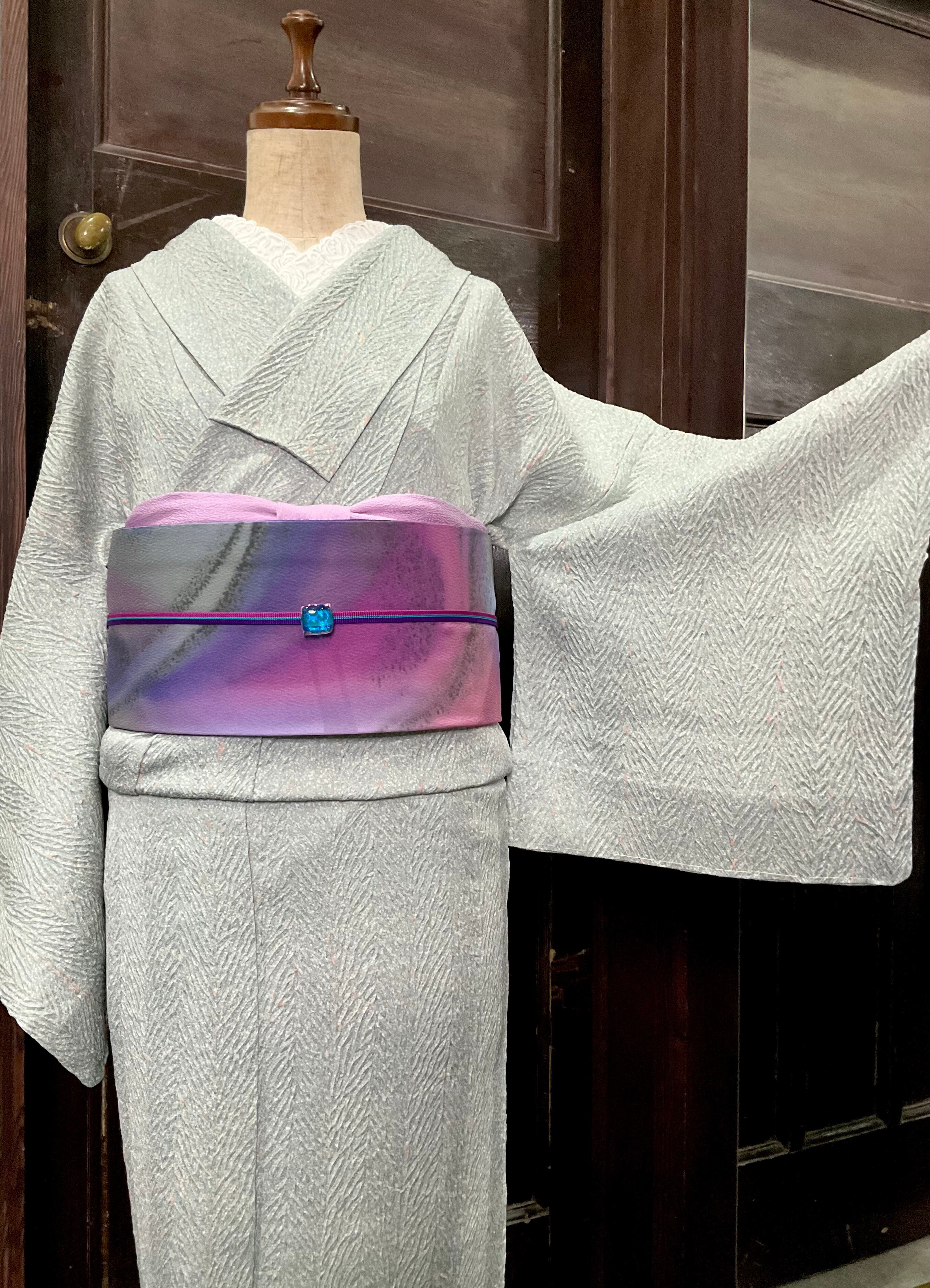 やわらかなブルーに、よく見ると淡いピンクやホワイト、そしてほんのりイエローと、綺麗なお色味が揃った、こちらのお着物。