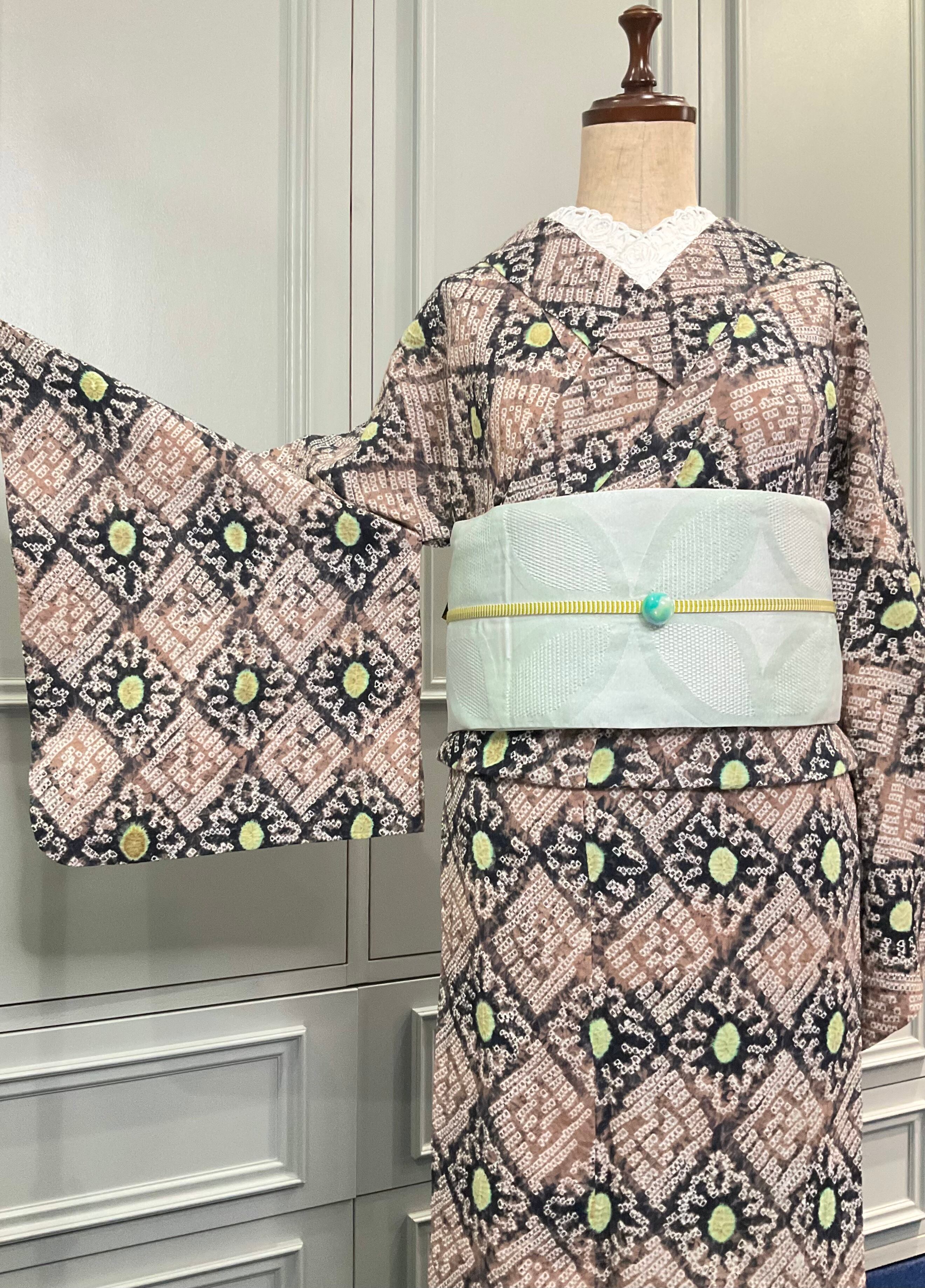 ブラウン系の地色に、ダイヤモンド・チェック柄にデザインされた、有松鳴海絞り浴衣です♪