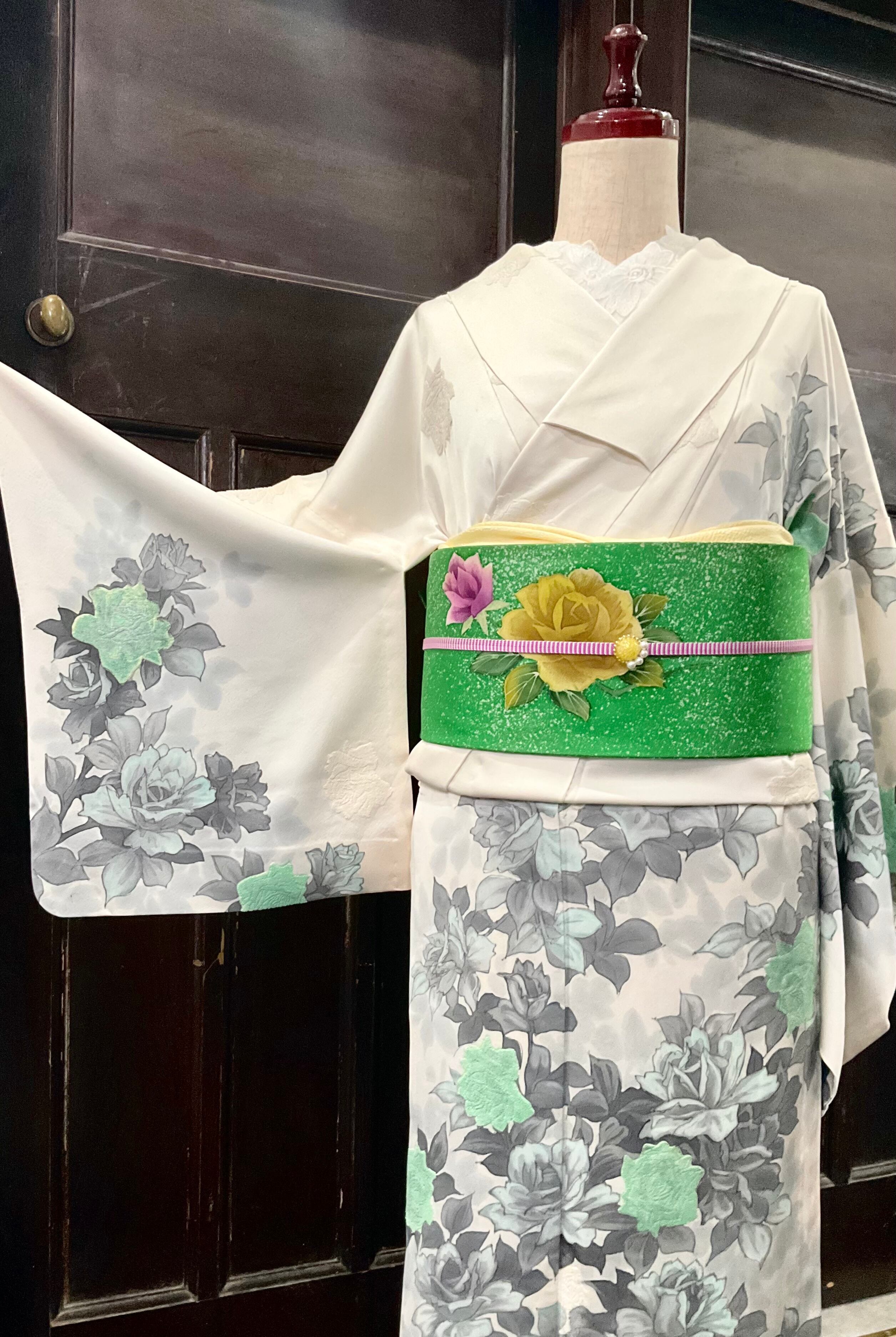 やさしい地色に、クラシックな雰囲気漂う薔薇の花たちがエレガントに描かれた、こちらのお着物。