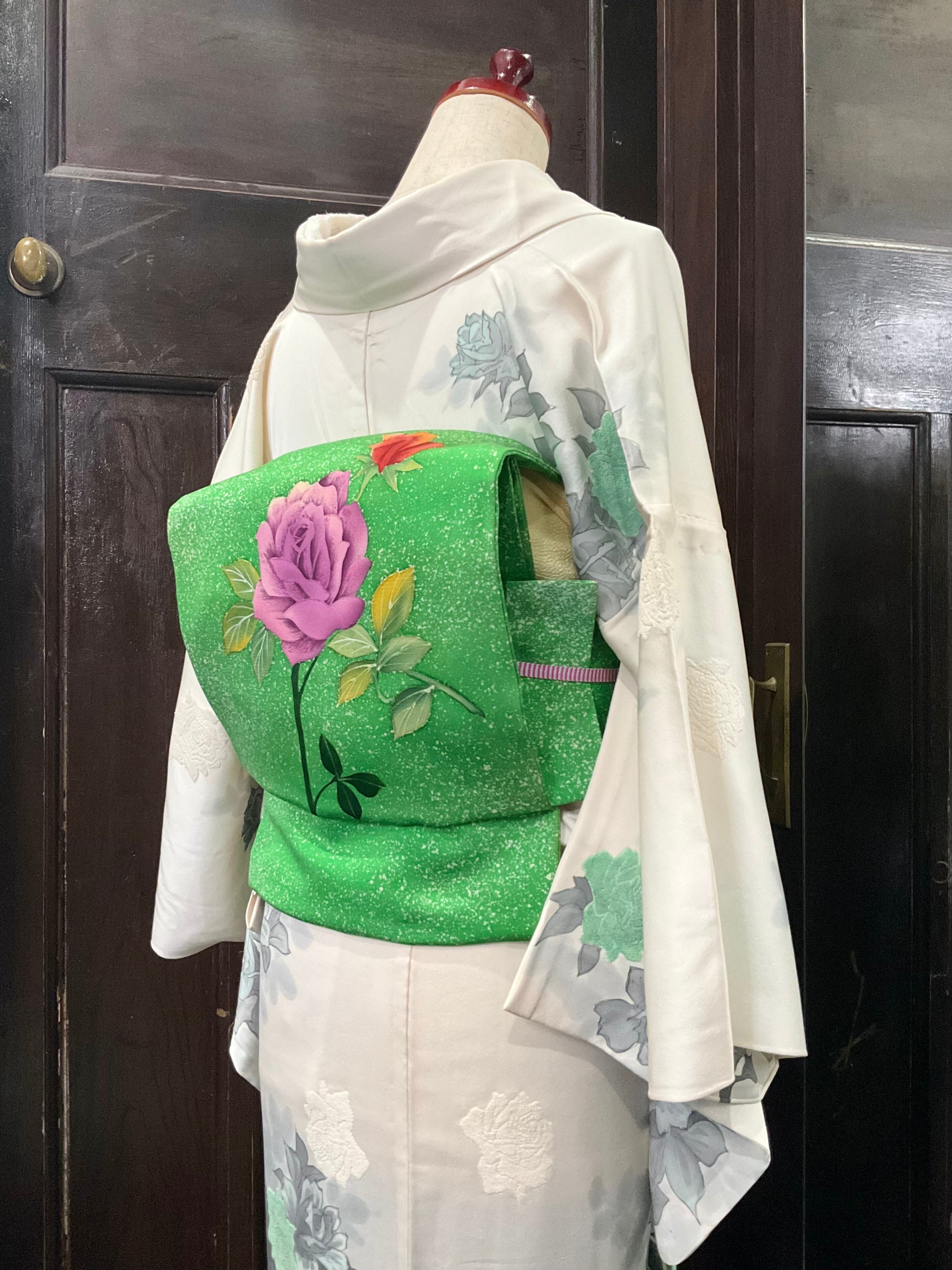 鮮やかなグリーンの地色に、薔薇の花模様がデザインされた、名古屋帯です♪
