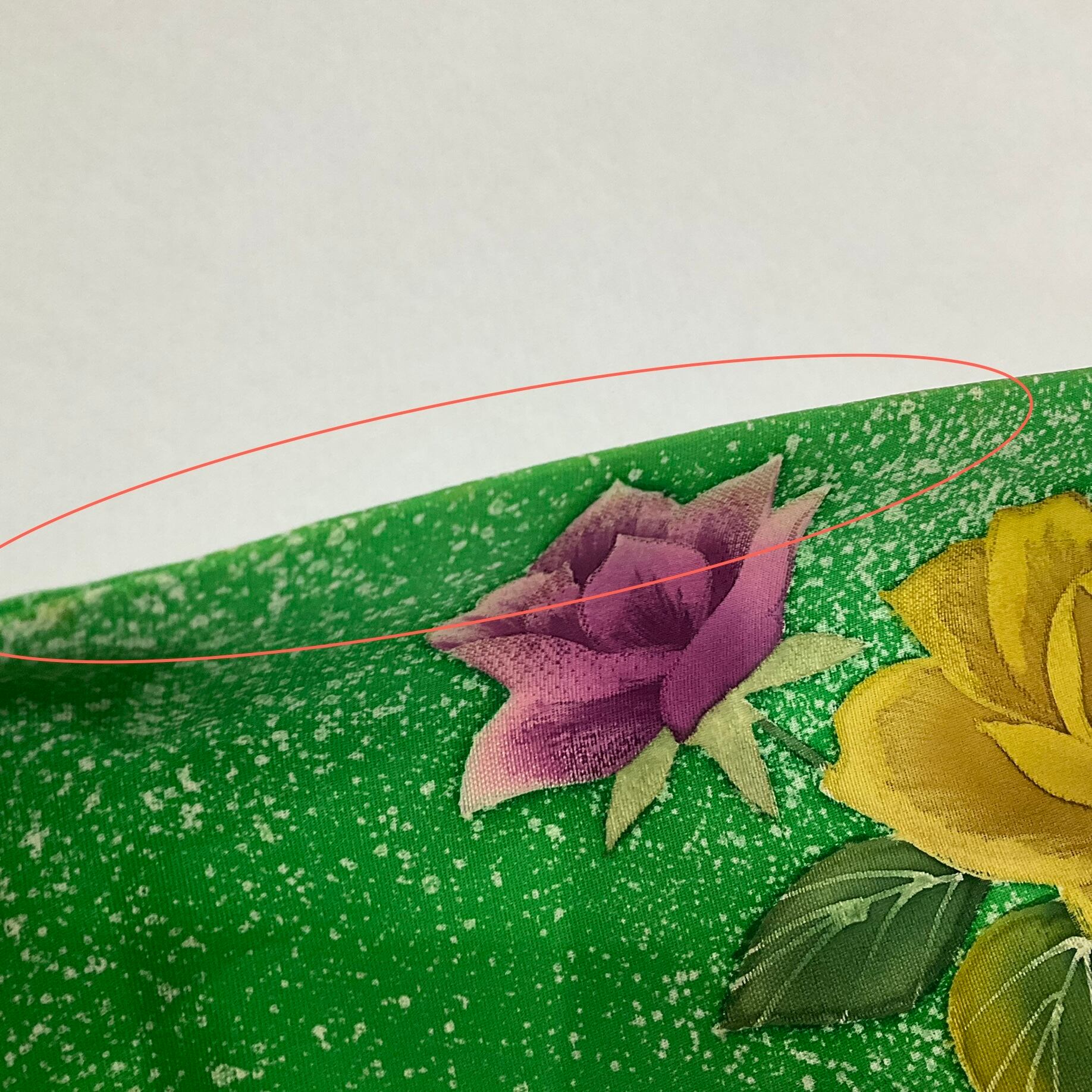 お太鼓上部(締めると見えない部分)、帯の端に、目立ちにくいですが、複数のうっすらヤケ有り。
