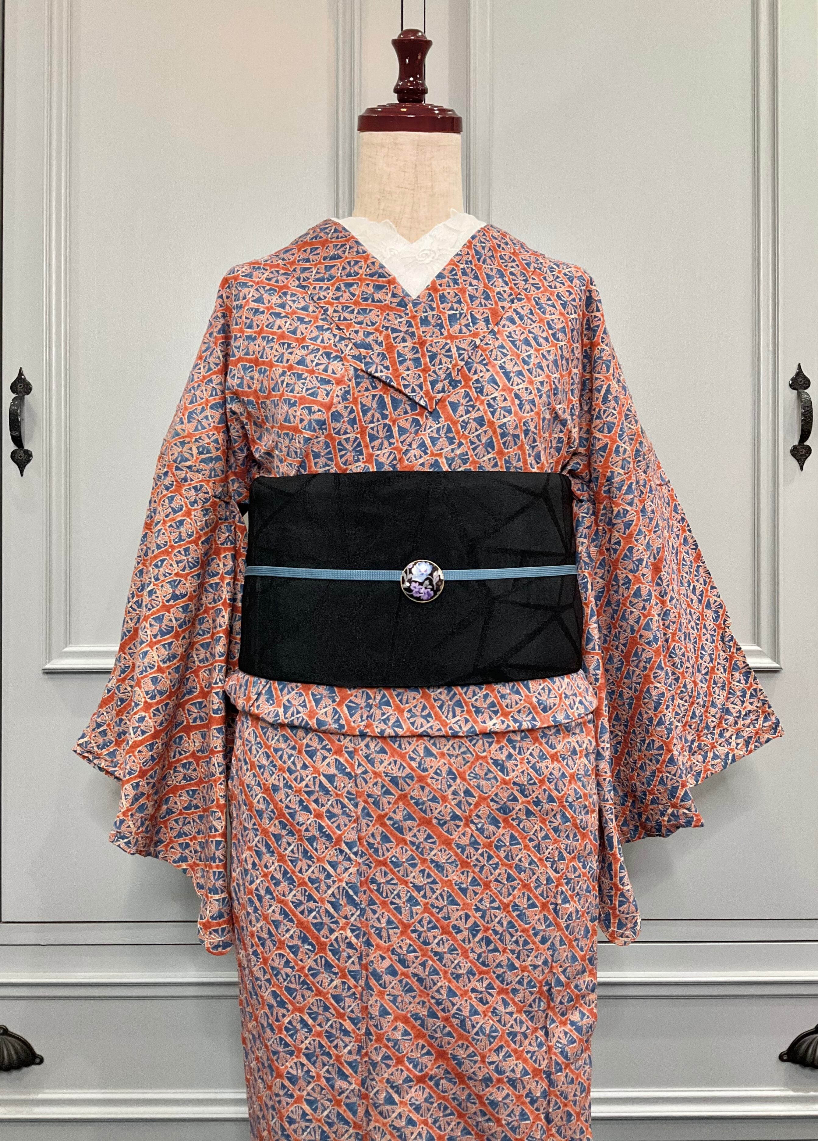 オレンジブラウン系×ブルー系の組み合わせがオシャレな、有松鳴海絞り浴衣です♪