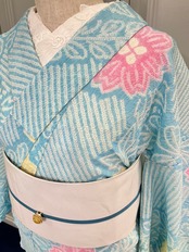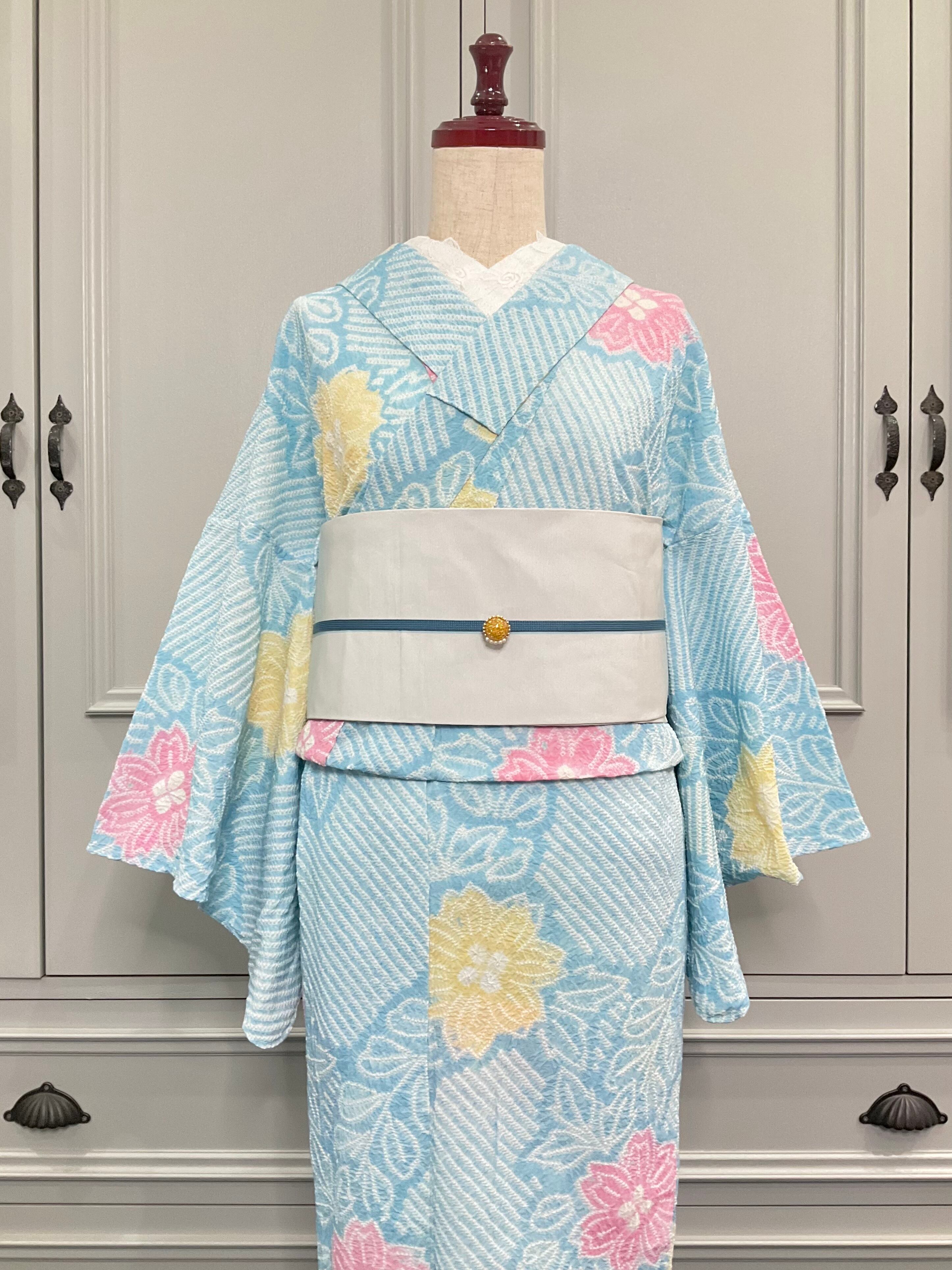 ライトブルーの地色に、花模様がデザインされた、有松鳴海絞り浴衣です♪