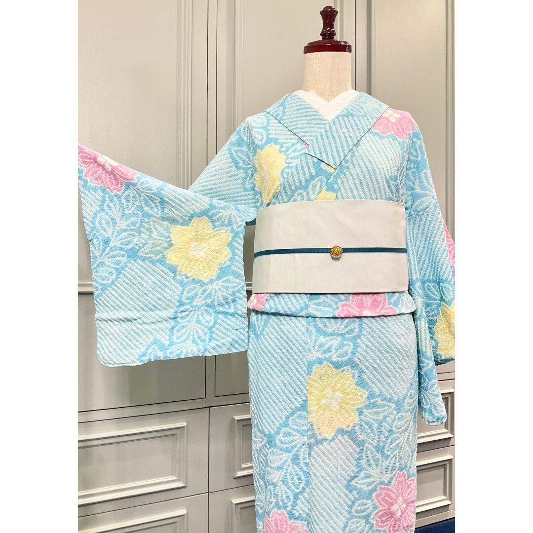 涼し気なライトブルーの地色に、やわらかなピンクとイエローの花模様が、やさしい雰囲気で素敵ですよね♡