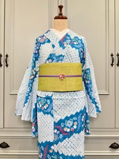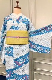 明るいブルーの地色に、抽象的なデザインが描かれた、有松鳴海絞り浴衣です♪