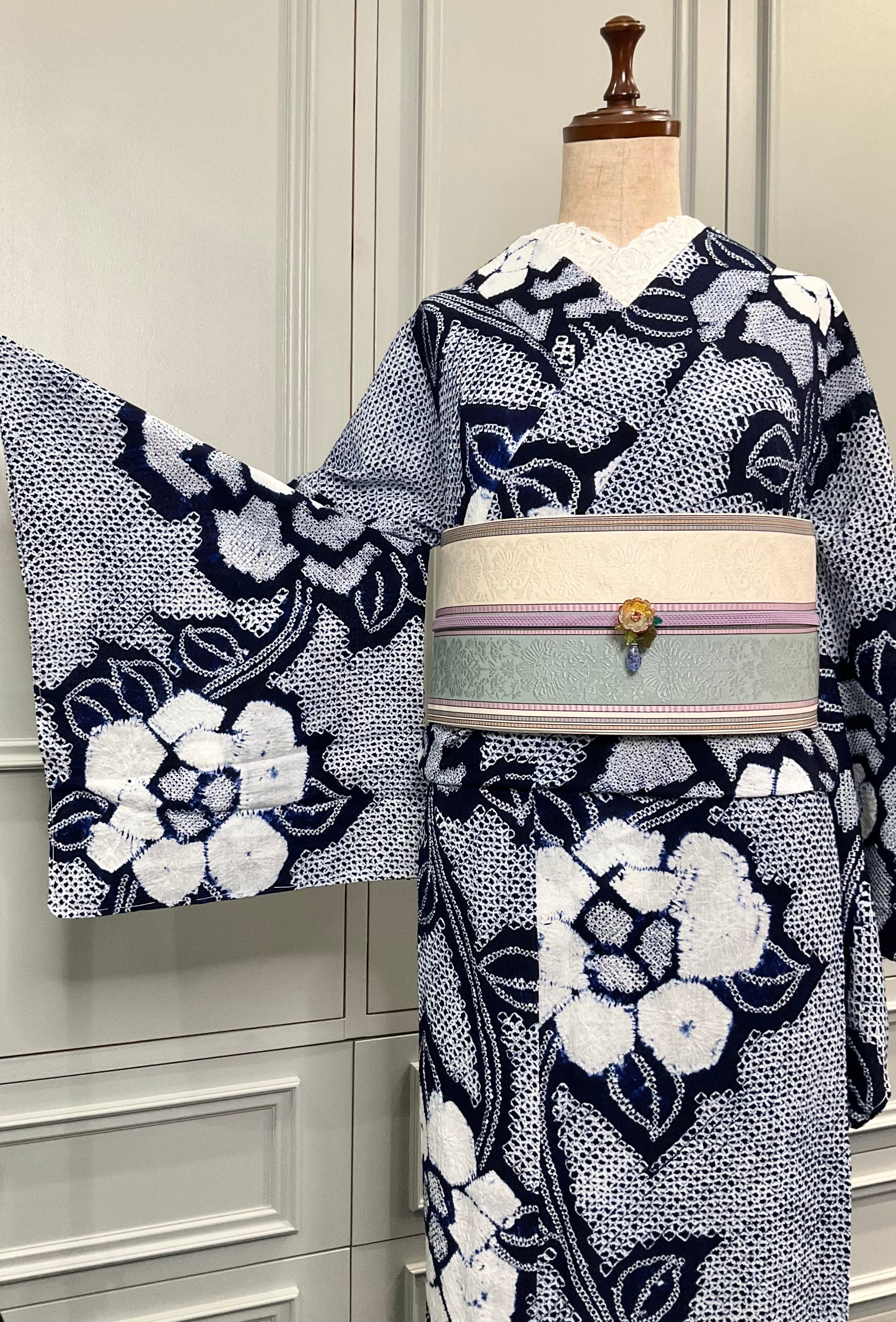 深い藍色×白色の地色に、花模様がデザインされた、未使用の有松鳴海絞り浴衣です♪