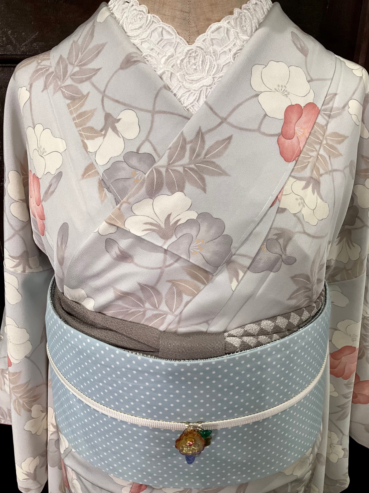 淡いグレー系の地色に、花模様がデザインされた小紋キモノです♪