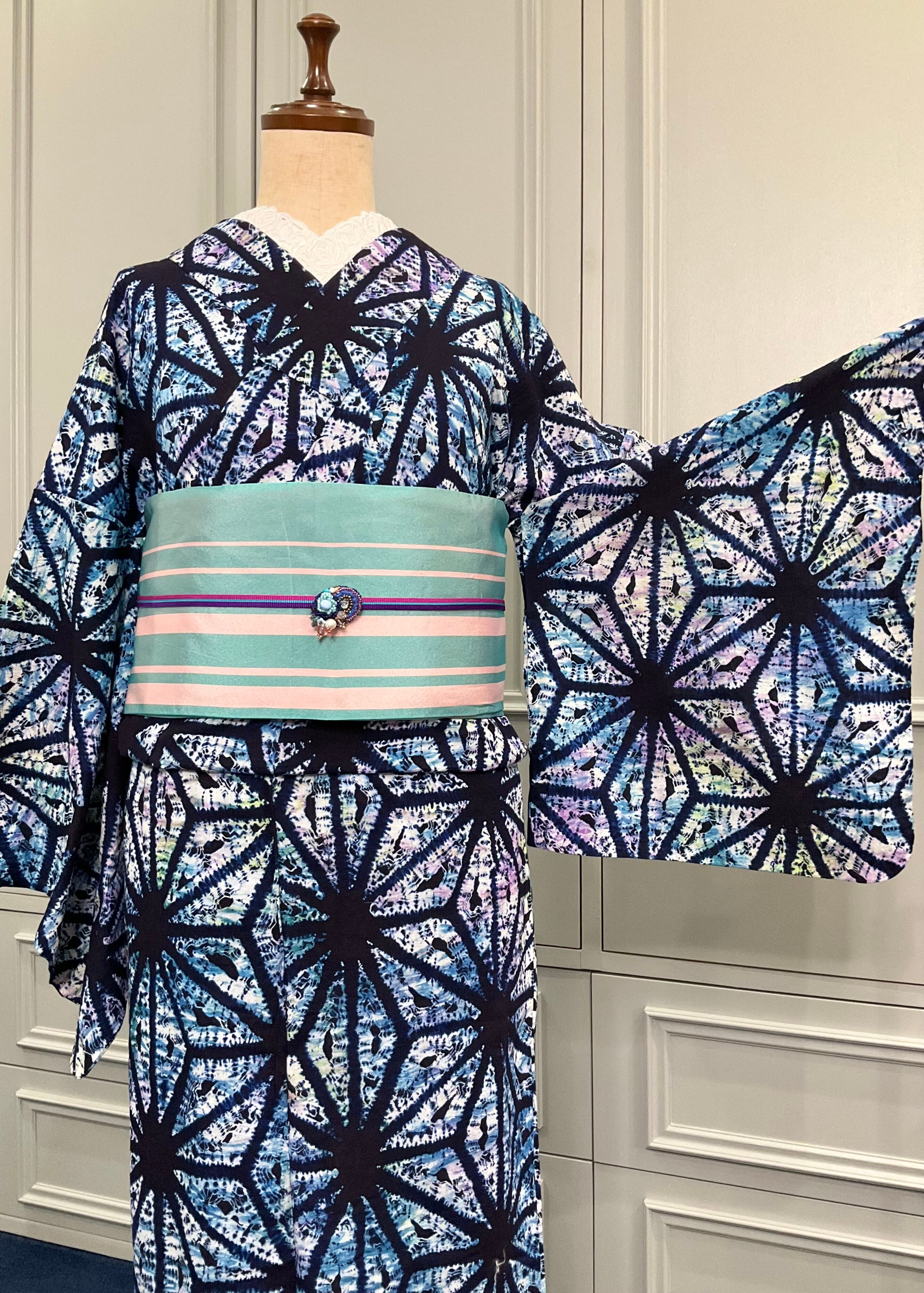 マーブルカラーの上には、濃いネイビーのお色で麻の葉模様がデザインされていますが、着物の定番である麻の葉模様も、マーブルカラーと合わさることによって、モダンな印象に変わるから不思議です^^