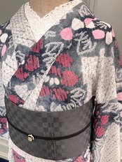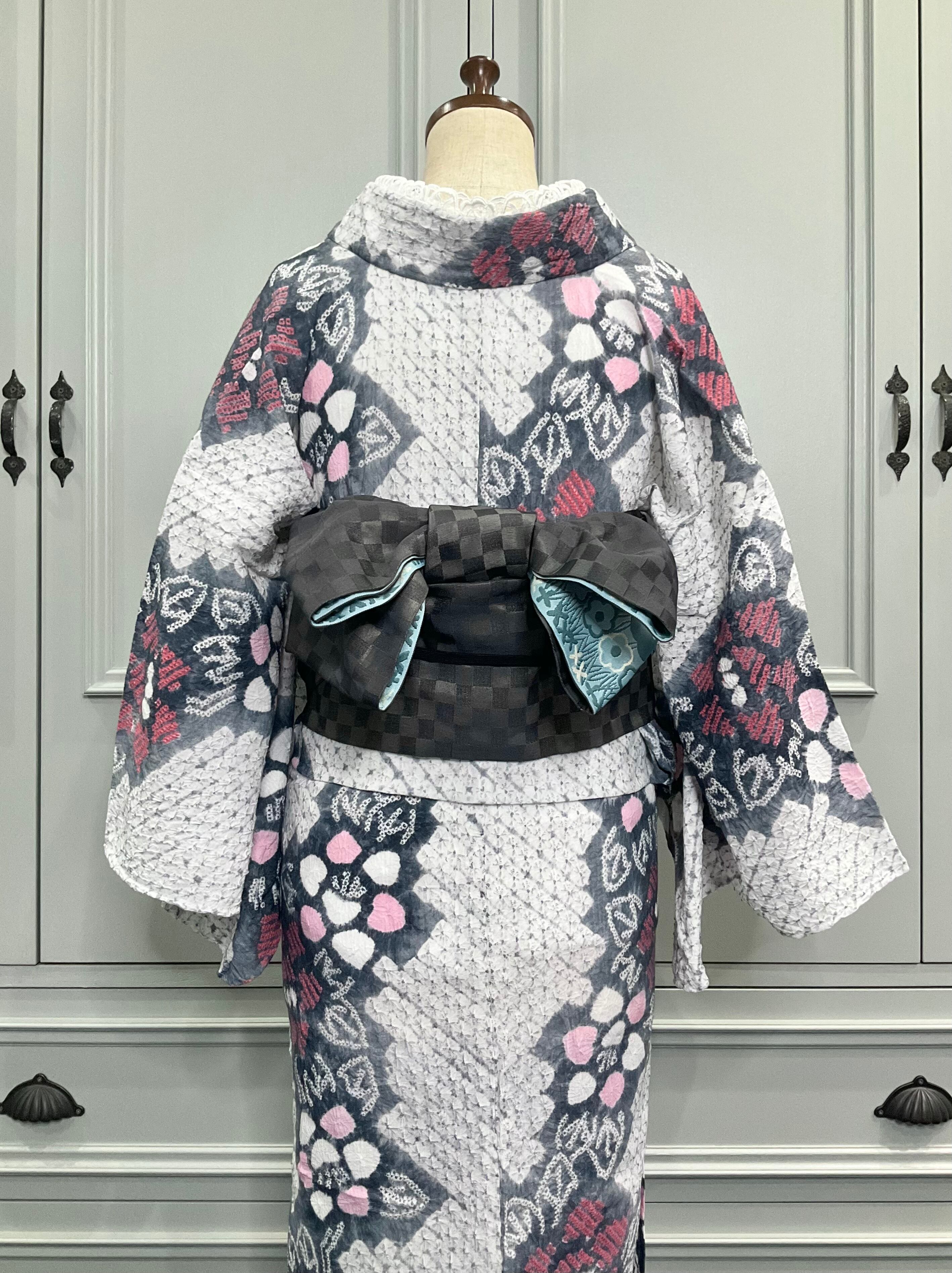 ホワイト×グレーの地色に、花模様がデザインされた、有松鳴海絞り浴衣です♪
