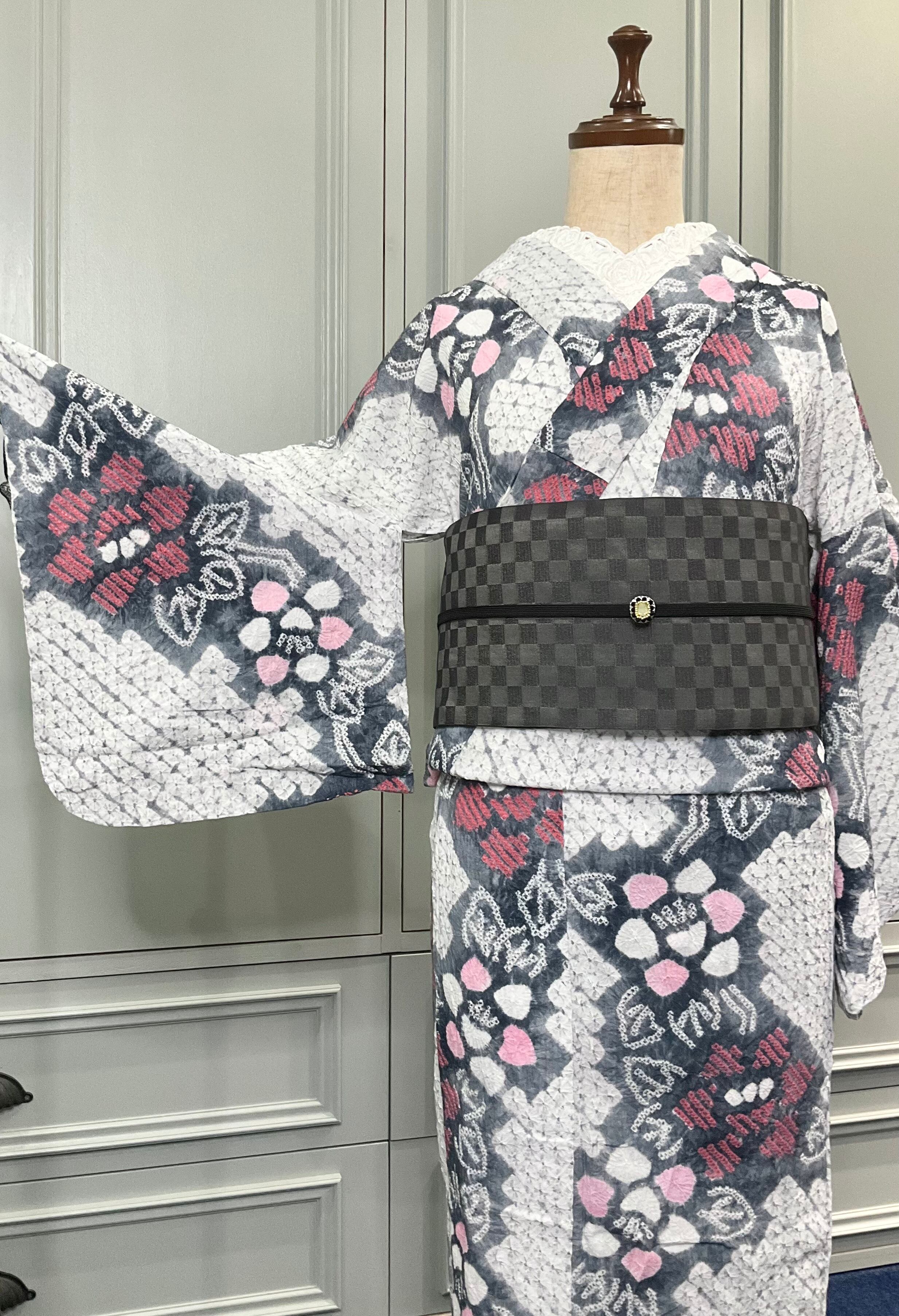 有松鳴海絞り浴衣*ホワイト×グレー フラワー0780