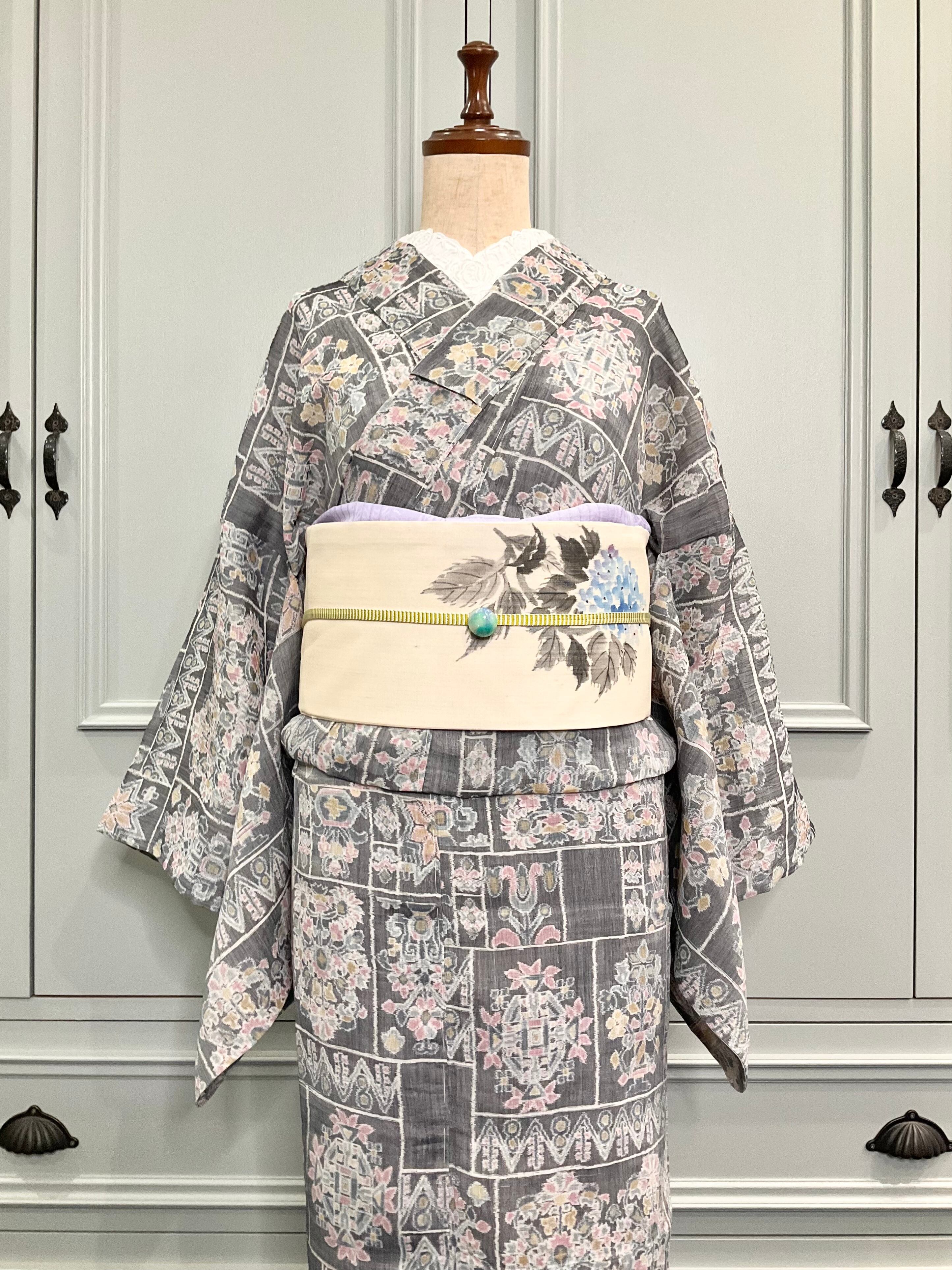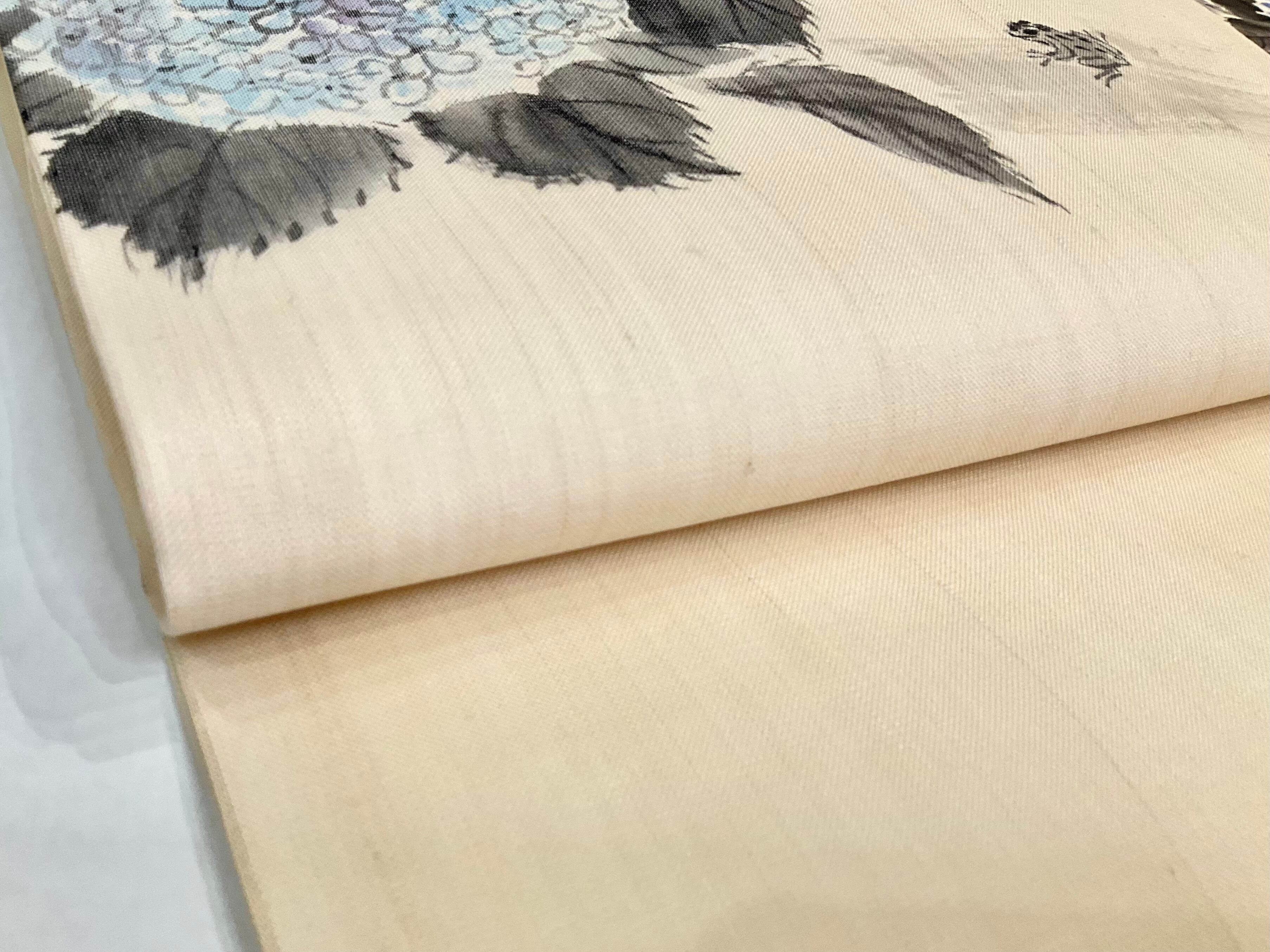 生成系の地色に、紫陽花がデザインされた、夏帯です♪