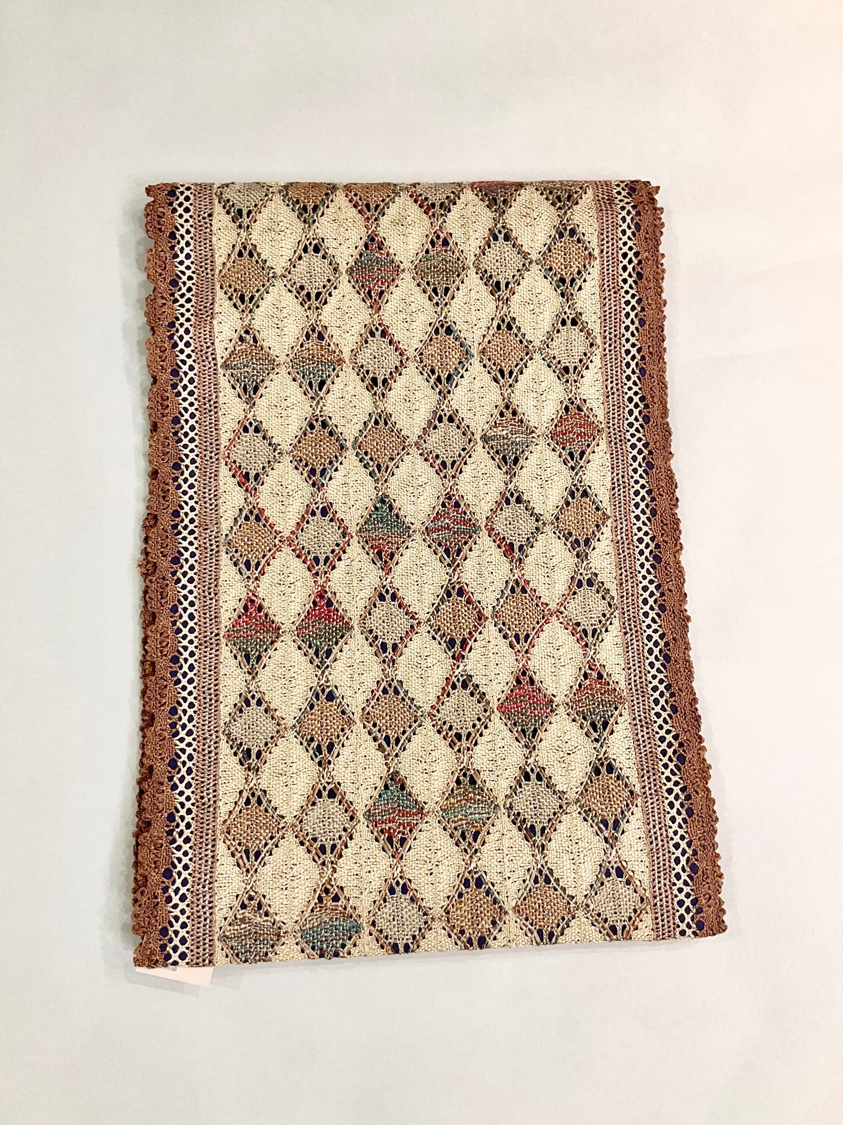ベージュ、ブラウン系を中心に、色々なカラーをミックスして織られ、ダイヤ柄が連なった、こちらのデザイン。