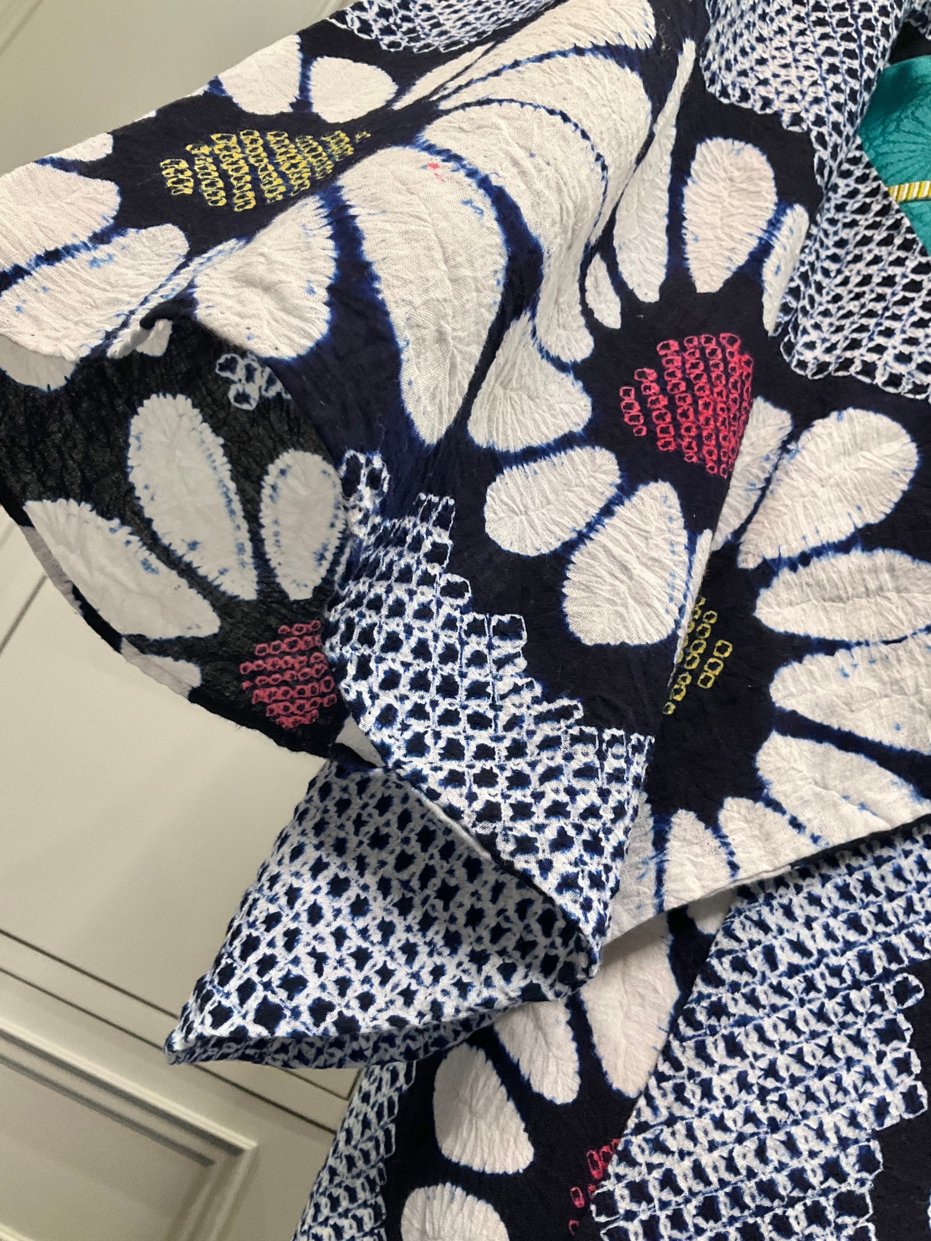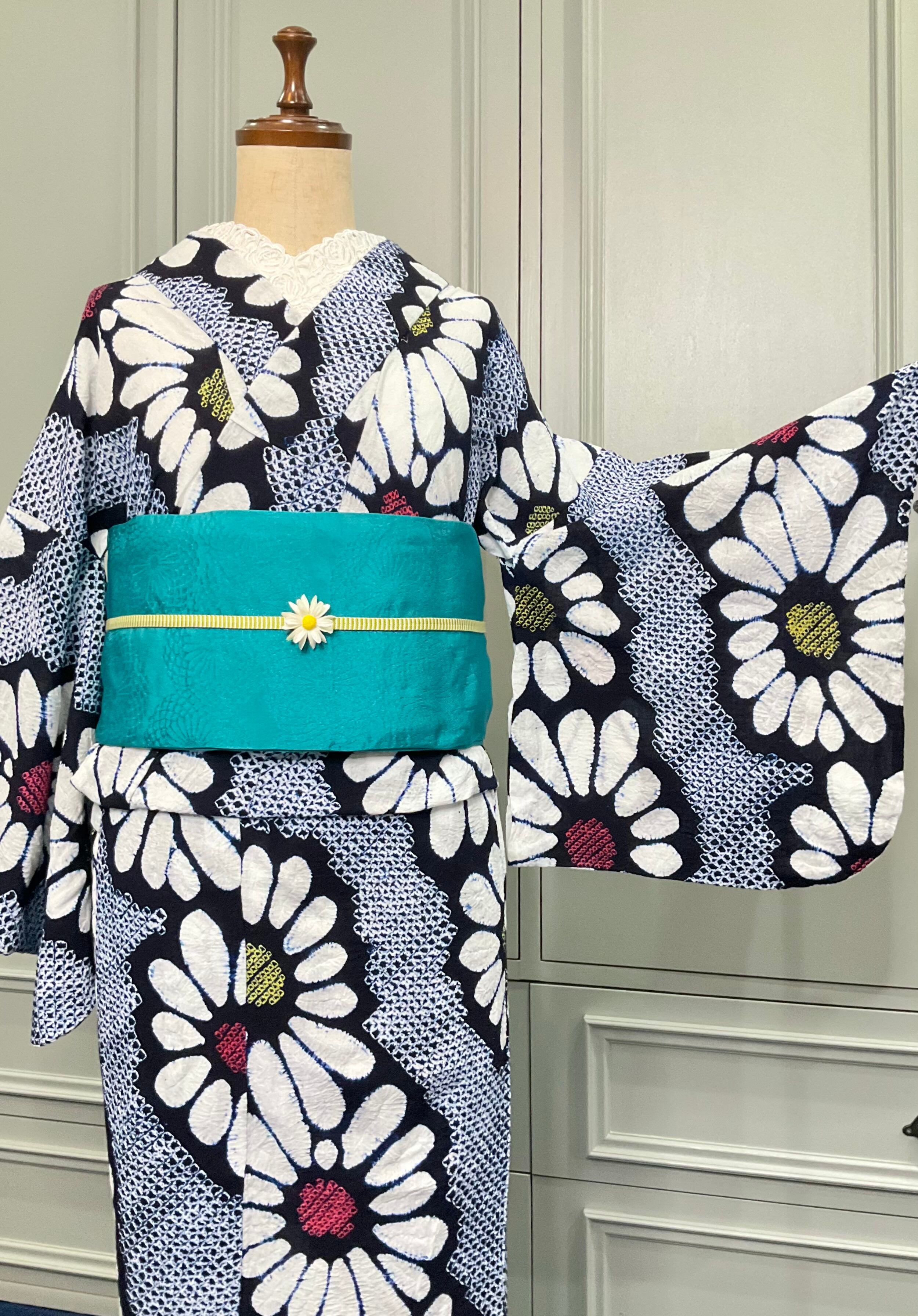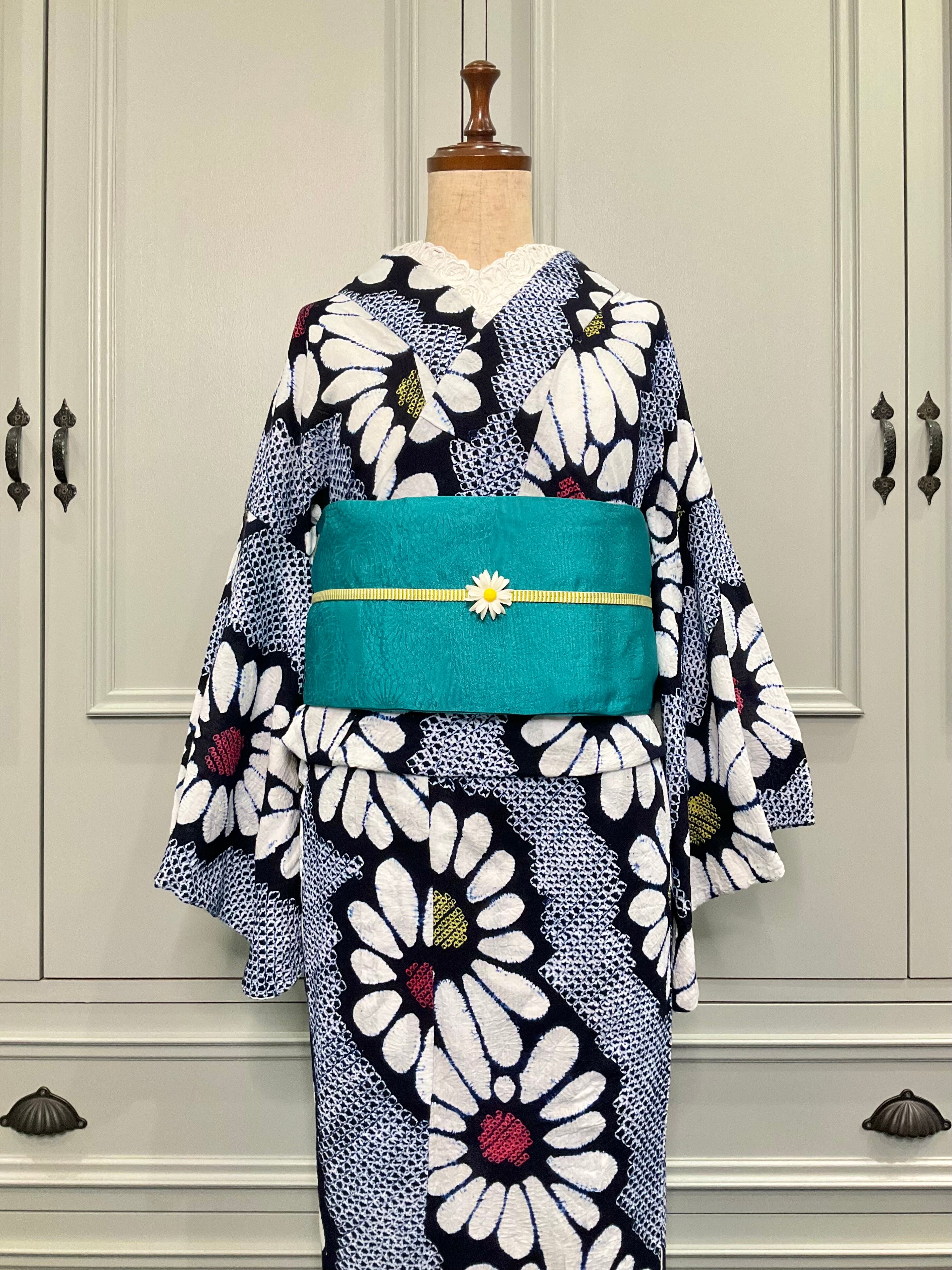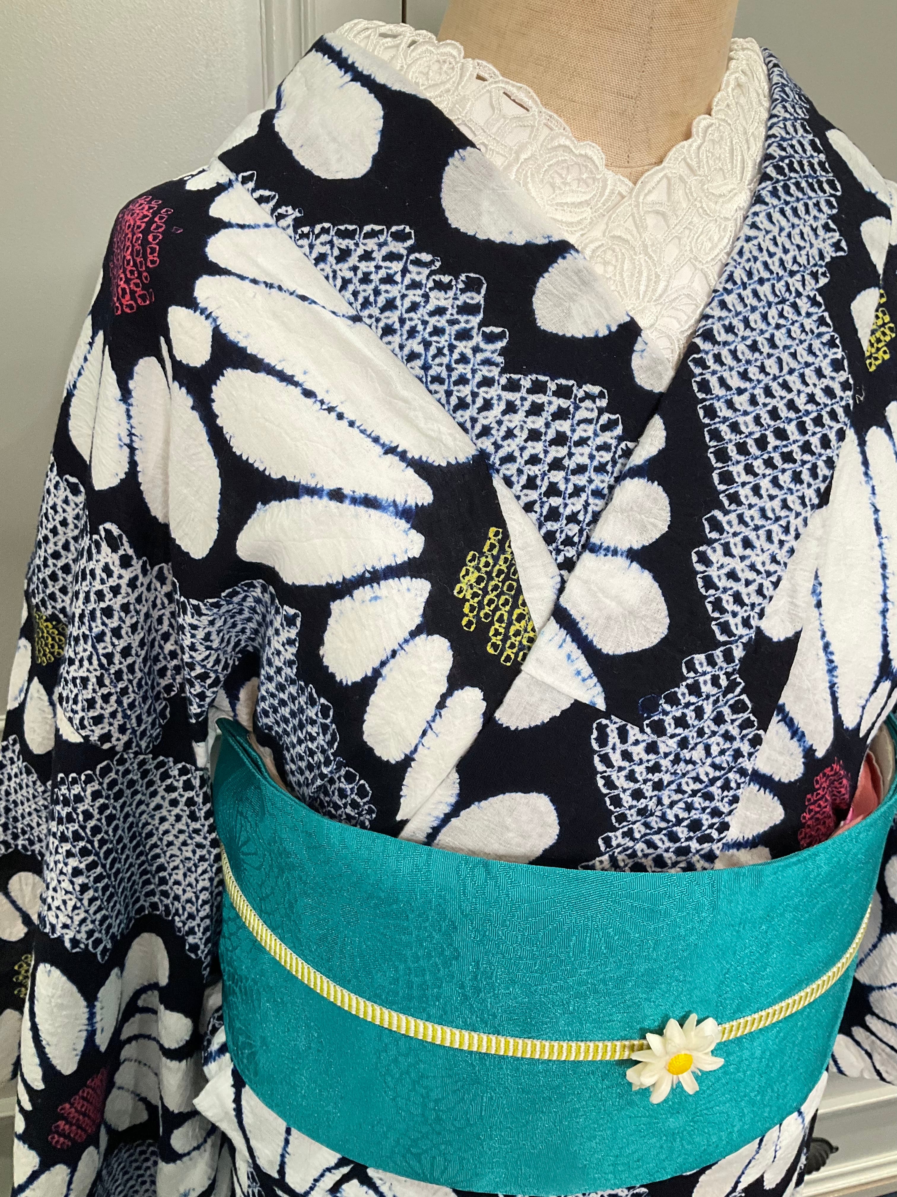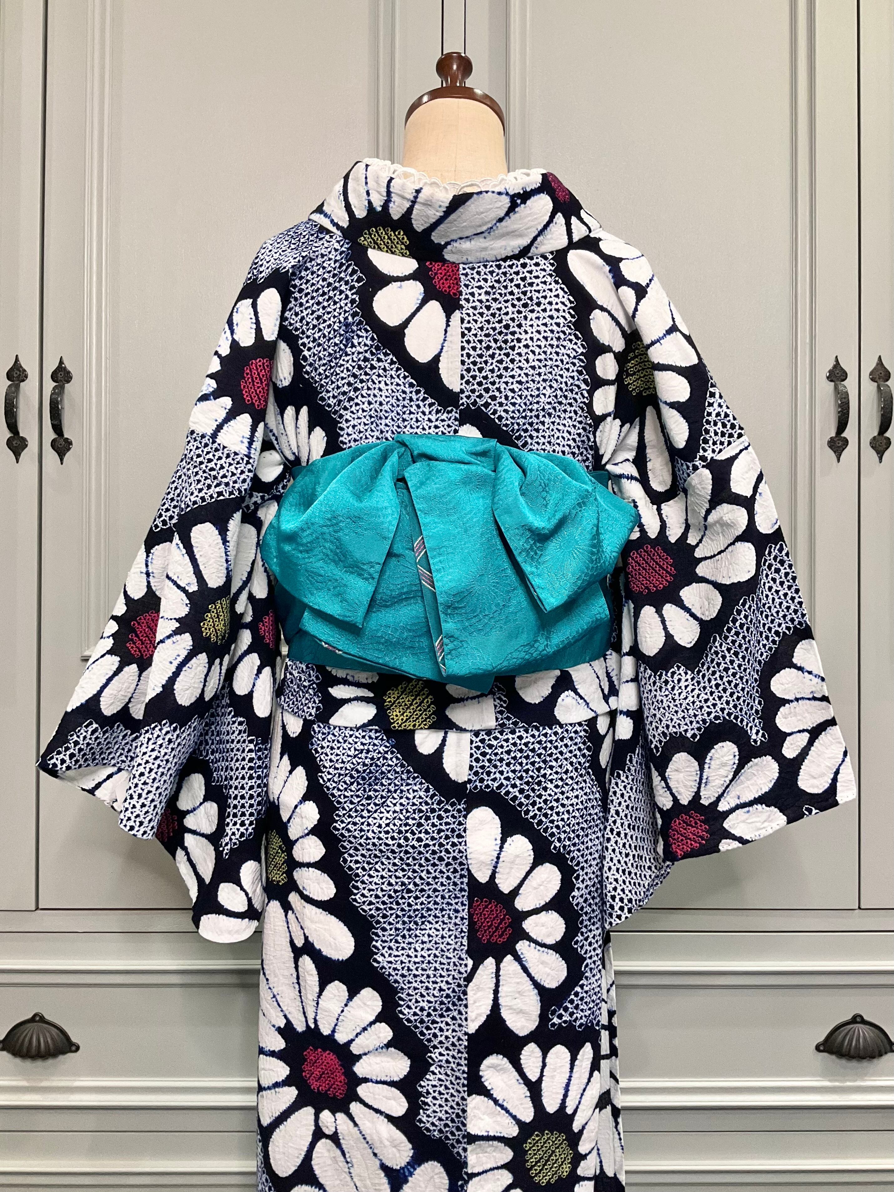 有松鳴海絞り浴衣*藍色×白色 ダイヤ・フラワー 0802