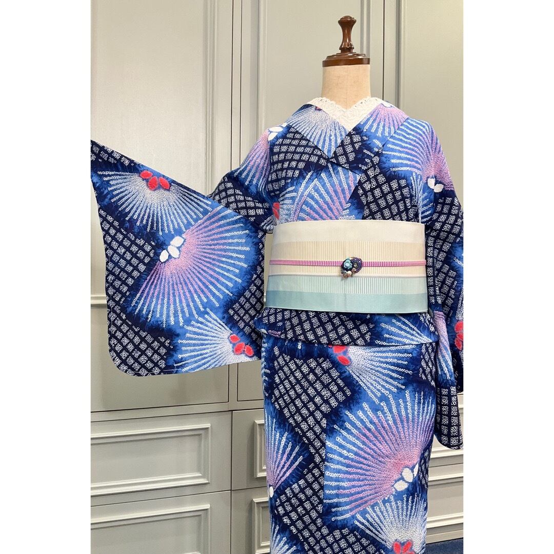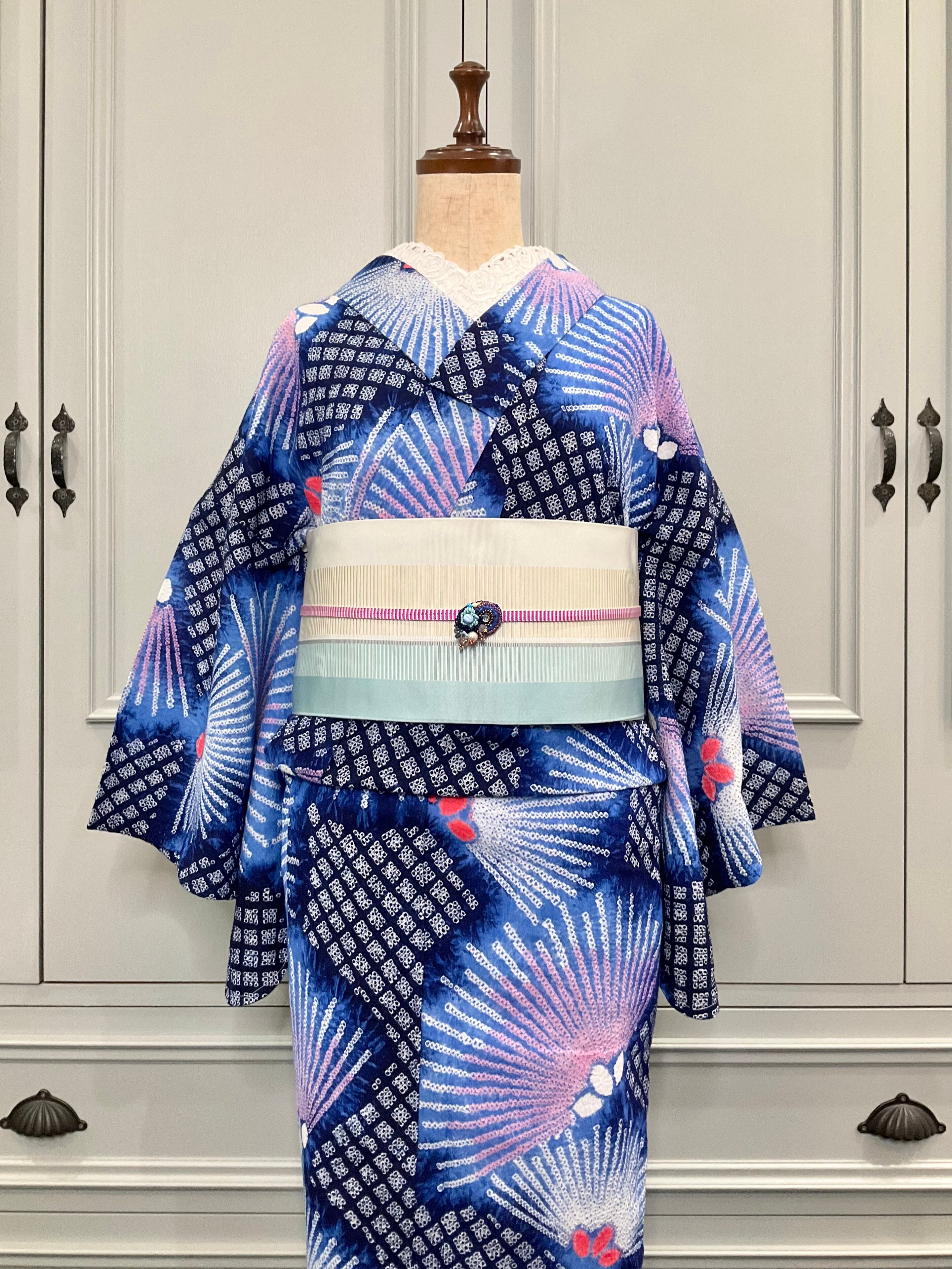 ブルー×ネイビー系の地色に、放射状のデザインが綺麗な、有松鳴海絞り浴衣です♪