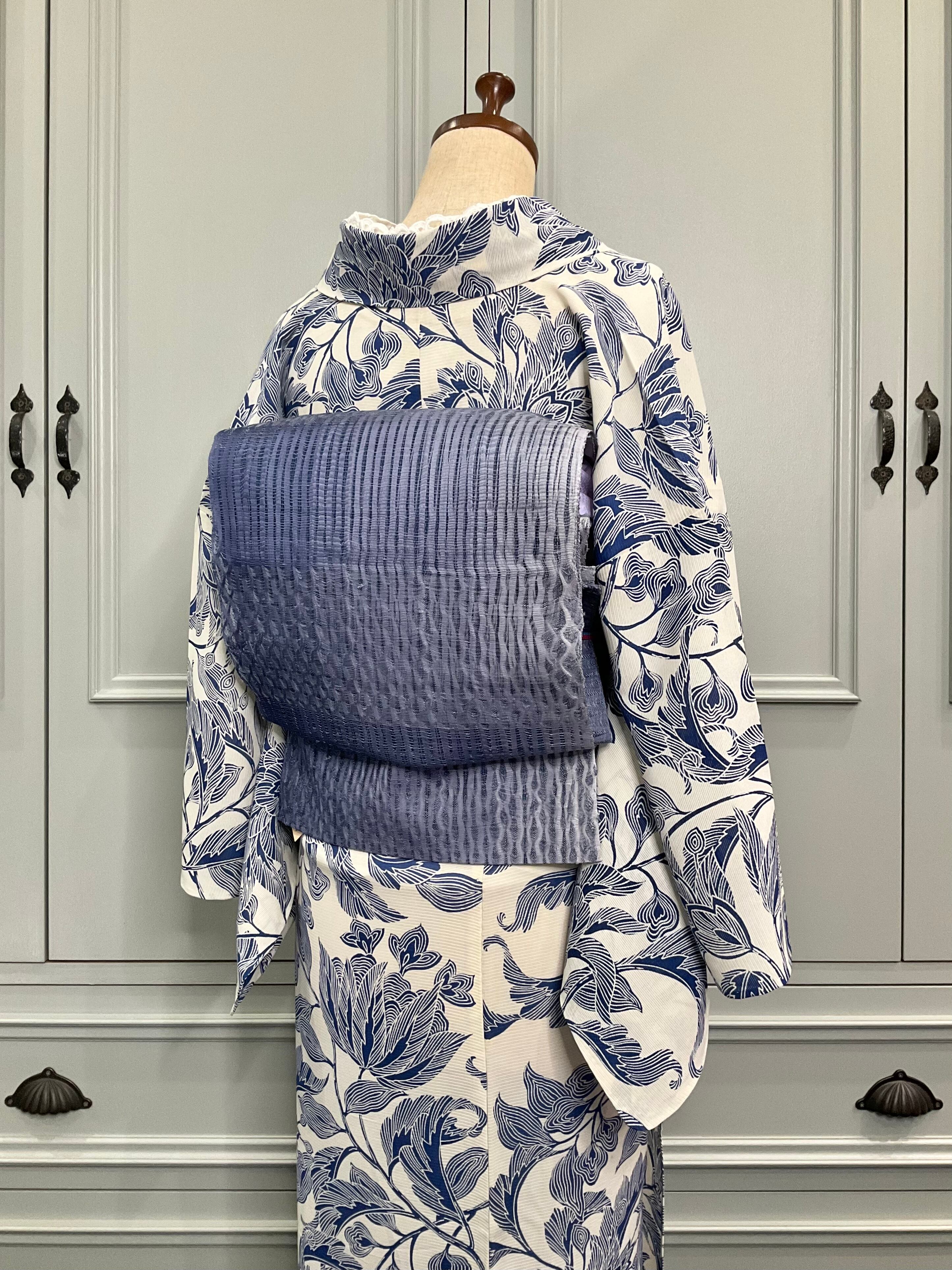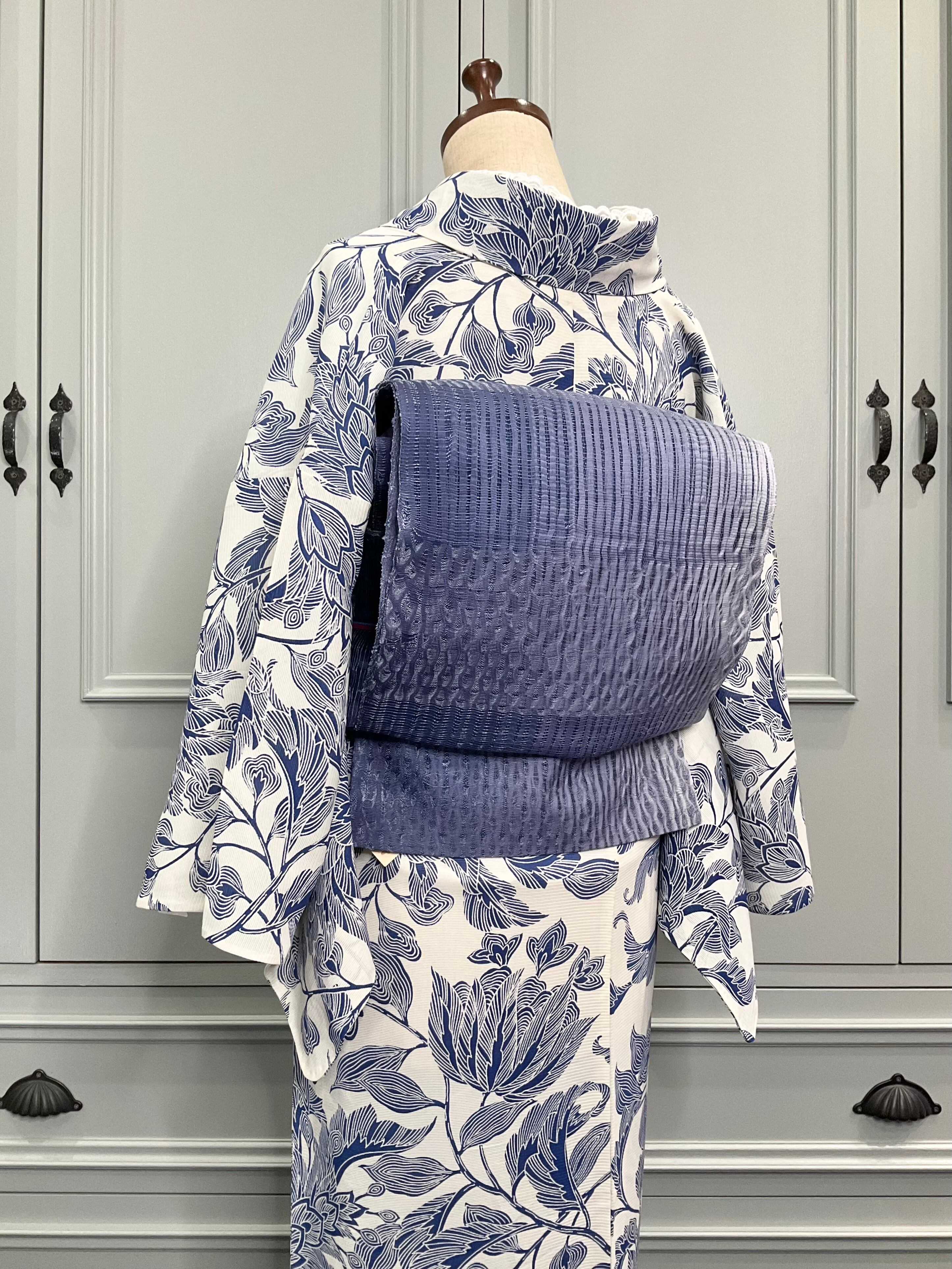 こちらの帯、柄は入っていないのですが、よく見ると織り方がとても凝っていて、不規則に少しゆらゆらと波打つ織り模様がオシャレなんです^^