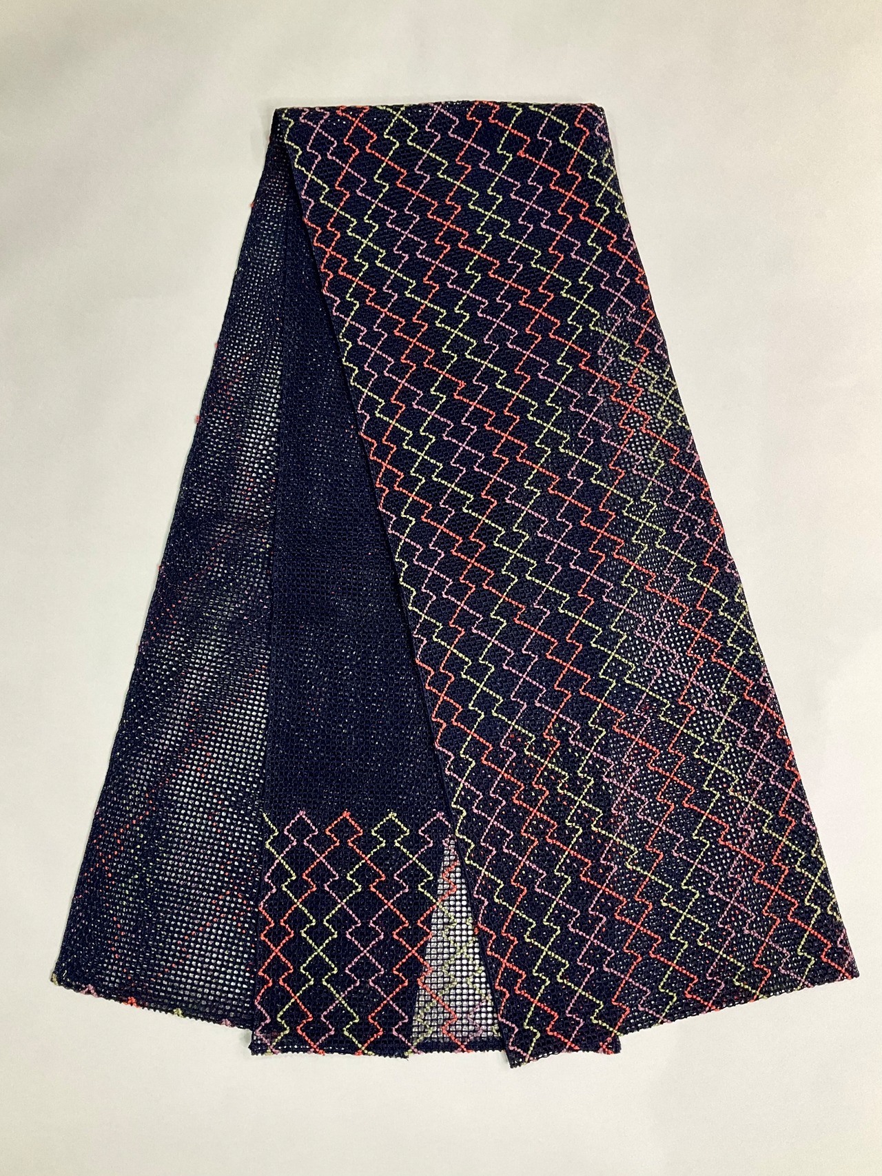 深いネイビー系の地色に三色のギザギザラインが入った夏のリサイクル開き名古屋帯です♪