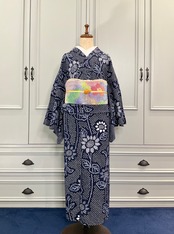 藍色×白色に、花模様がデザインされた、有松鳴海絞り浴衣です♪