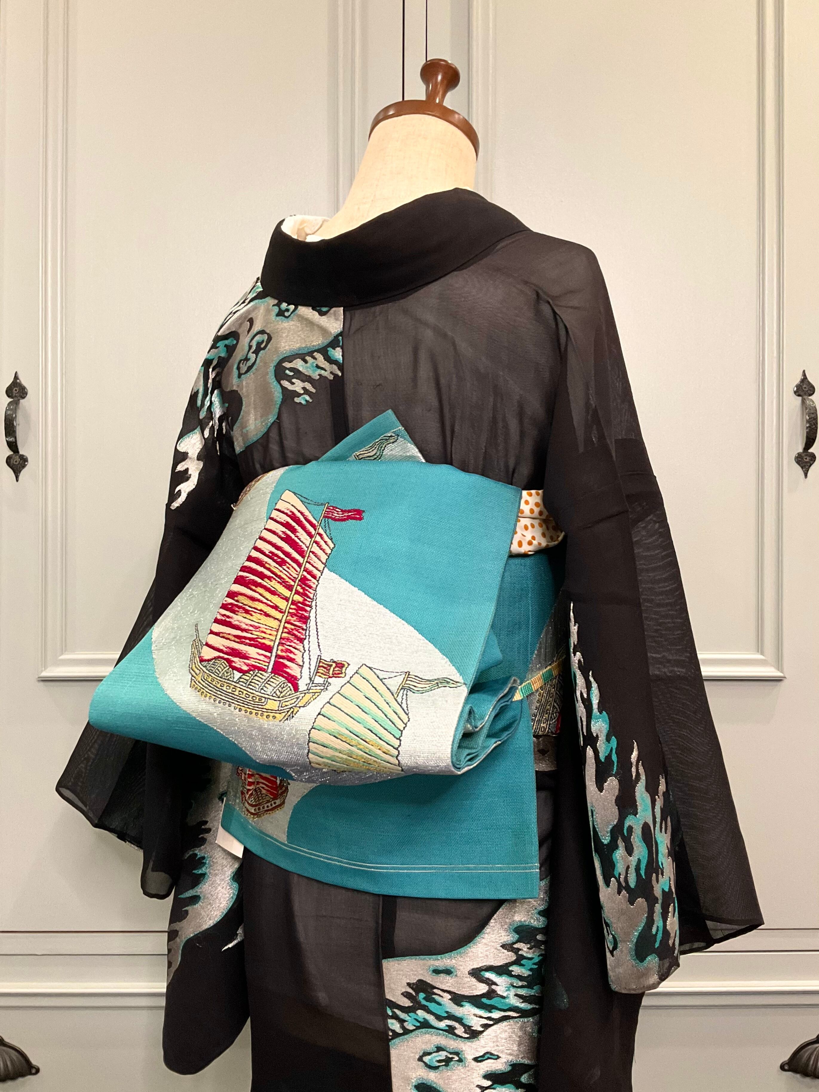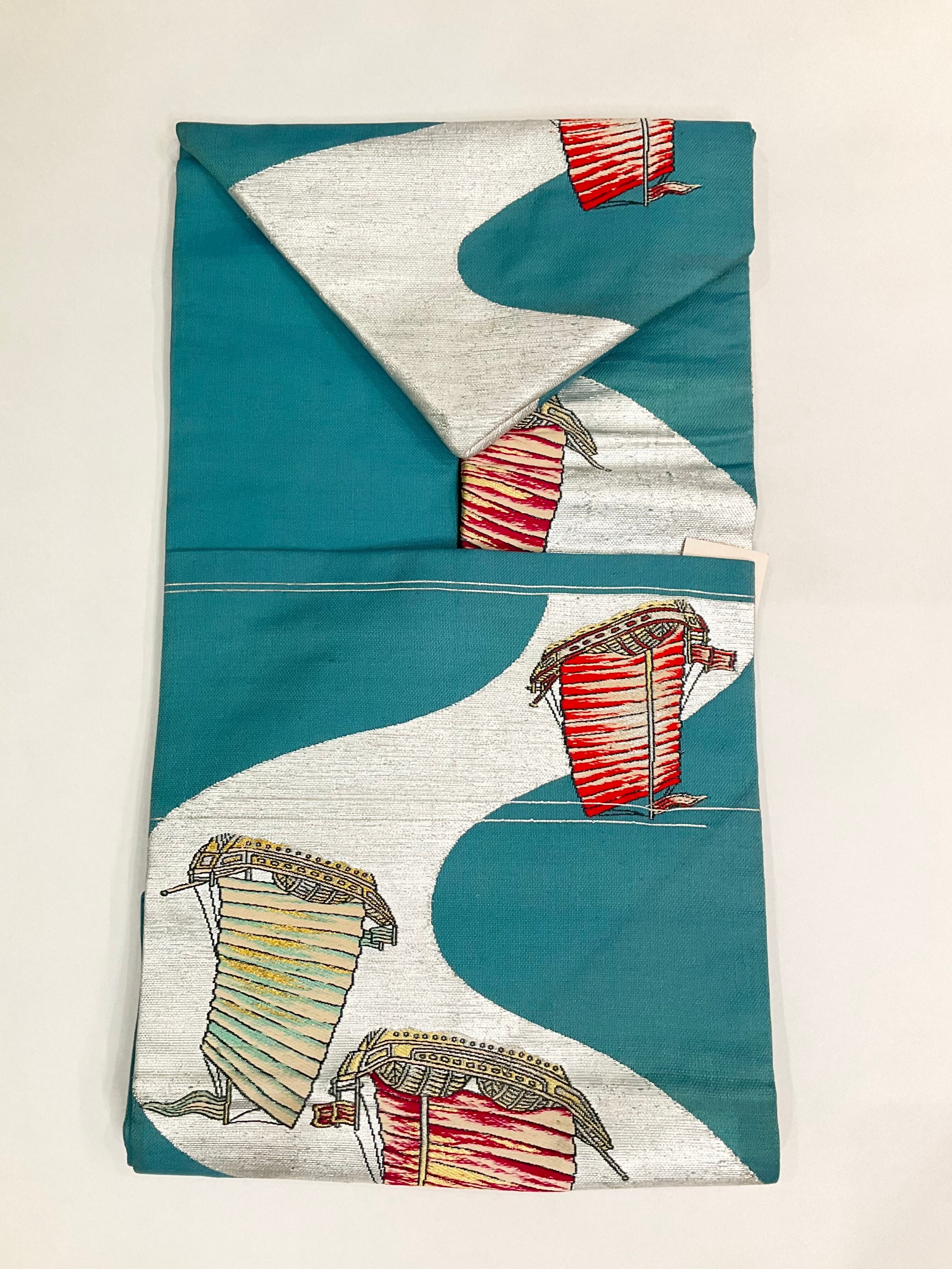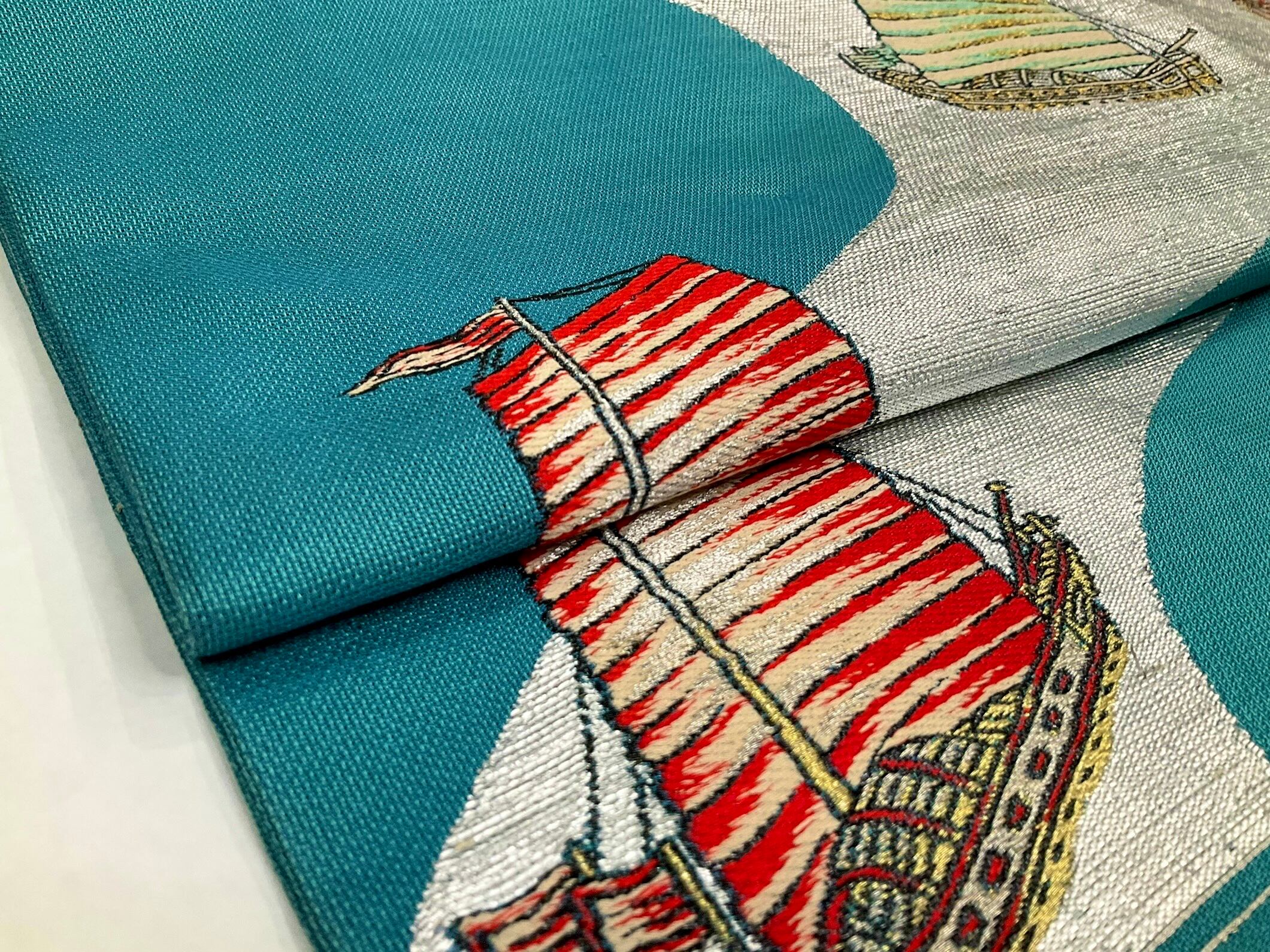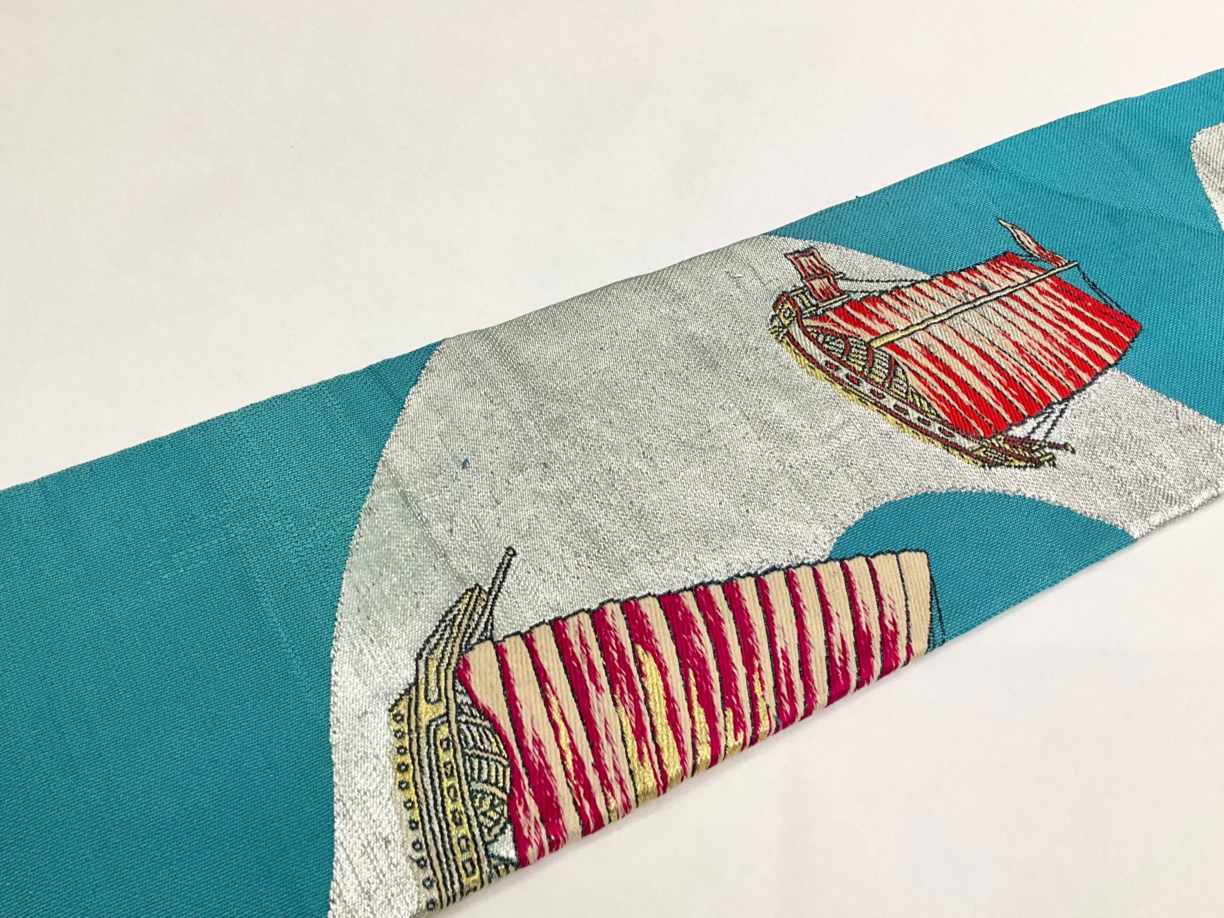 ターコイズ系の地色に、船のデザインがされた、夏のアンティーク名古屋帯です♪
