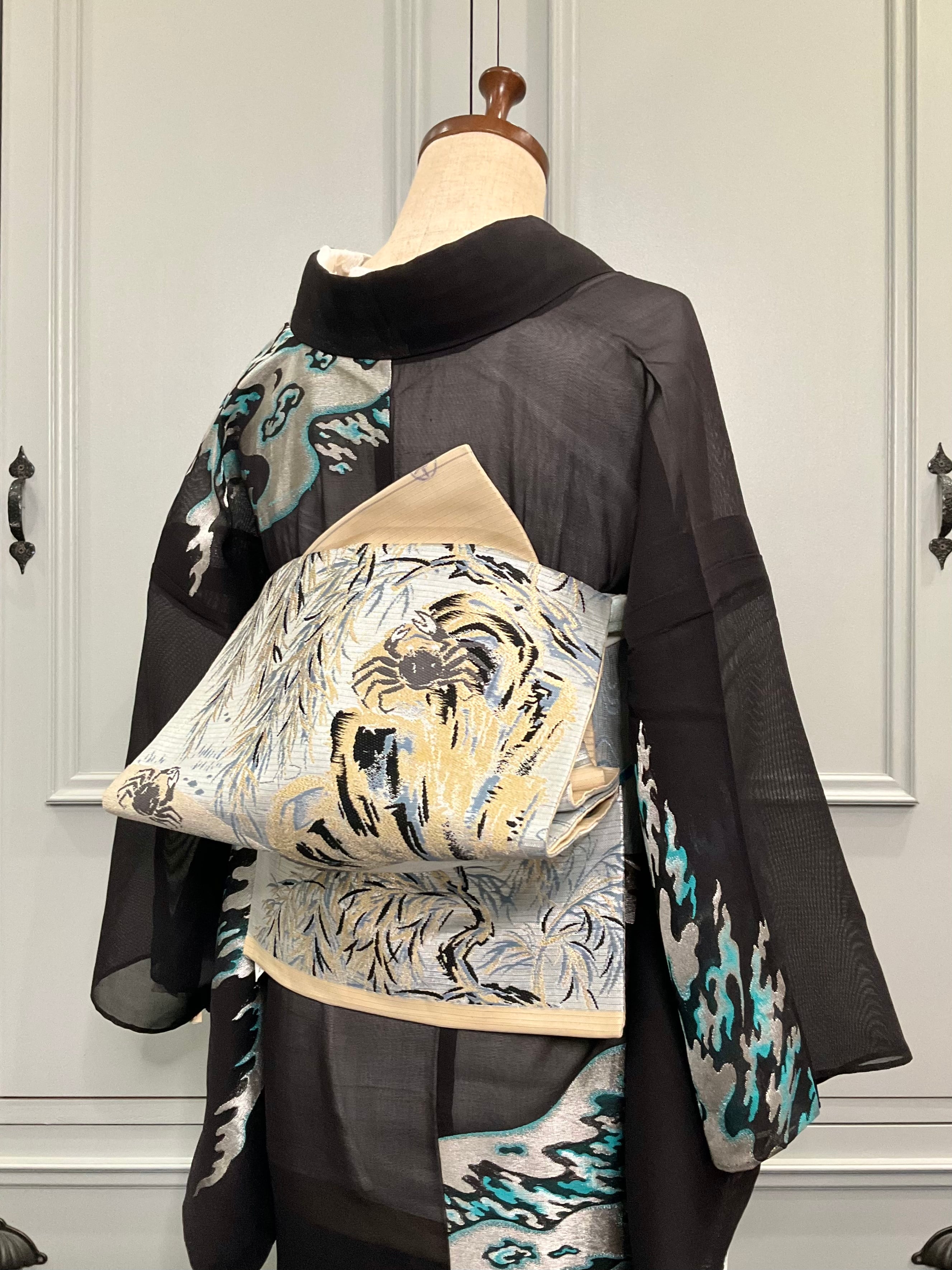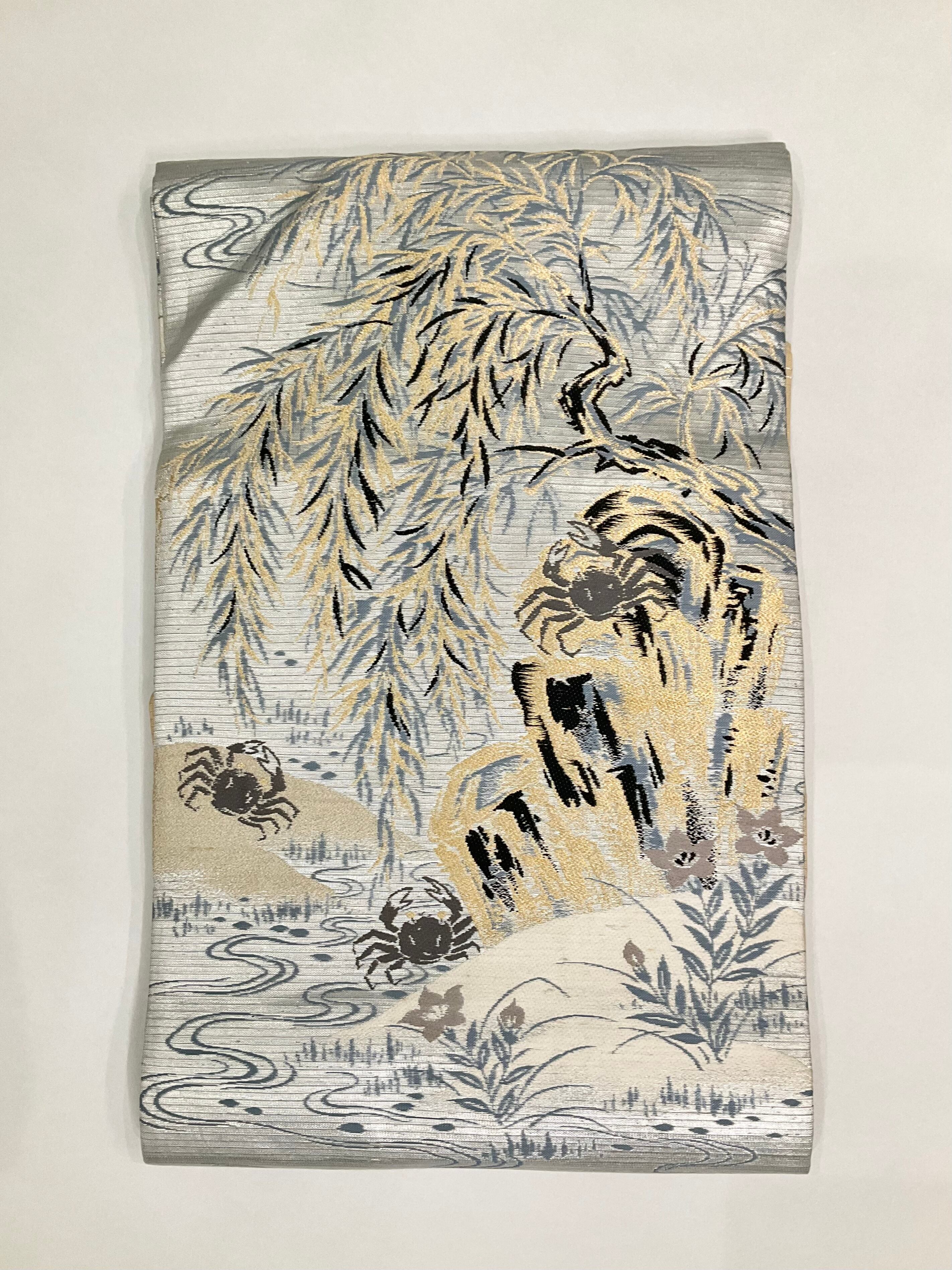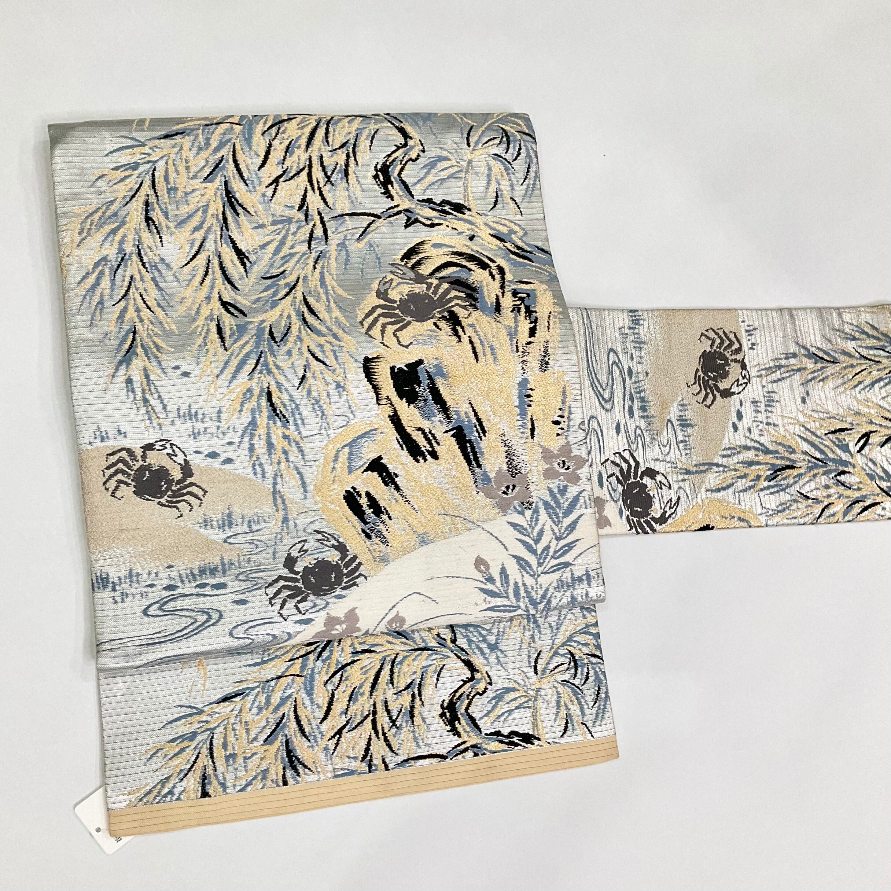 シルバーの地色に、自然の風景や蟹がデザインされた、夏の絽の名古屋帯です♪