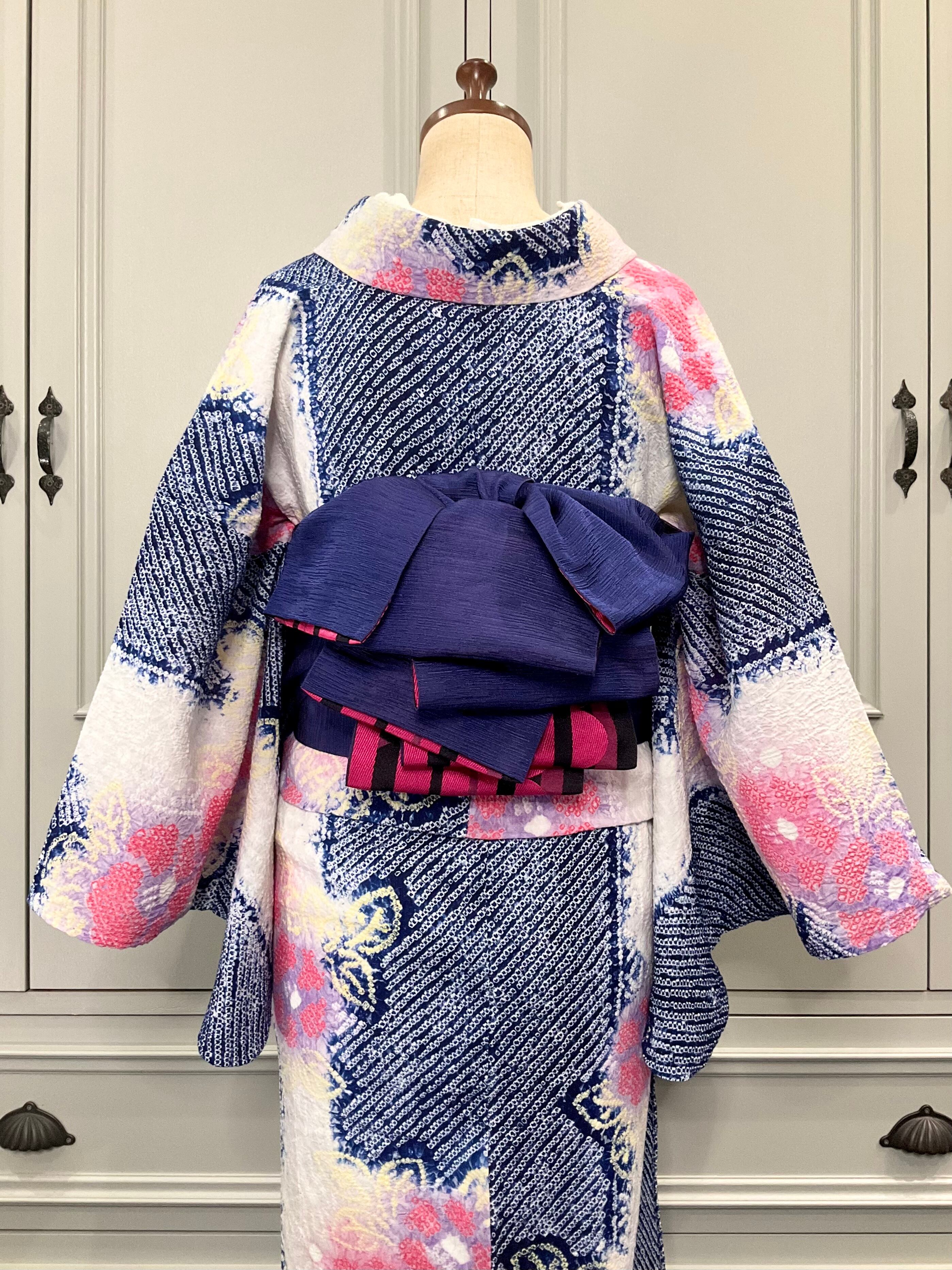 インディゴ×ホワイトの地色に、花模様がデザインされた、有松鳴海絞り浴衣です♪