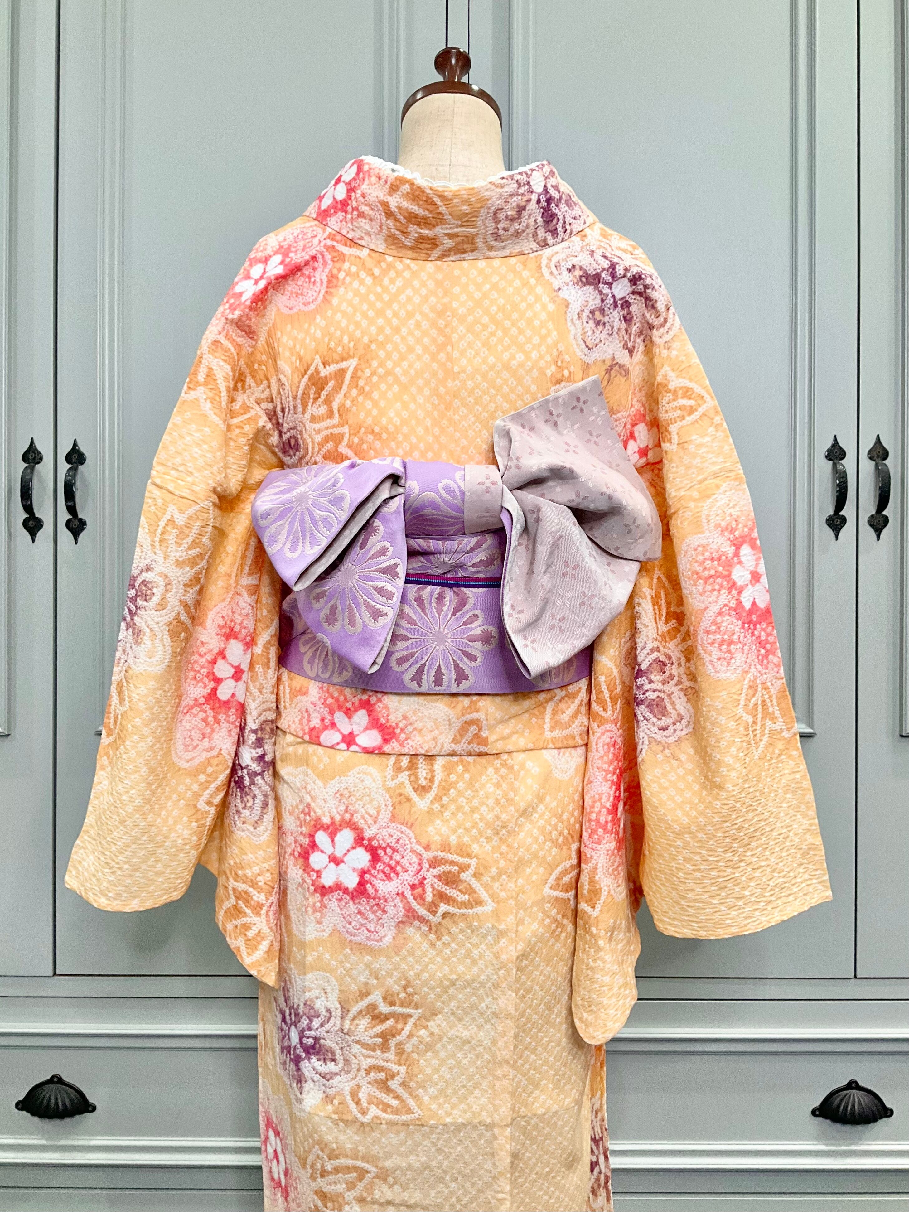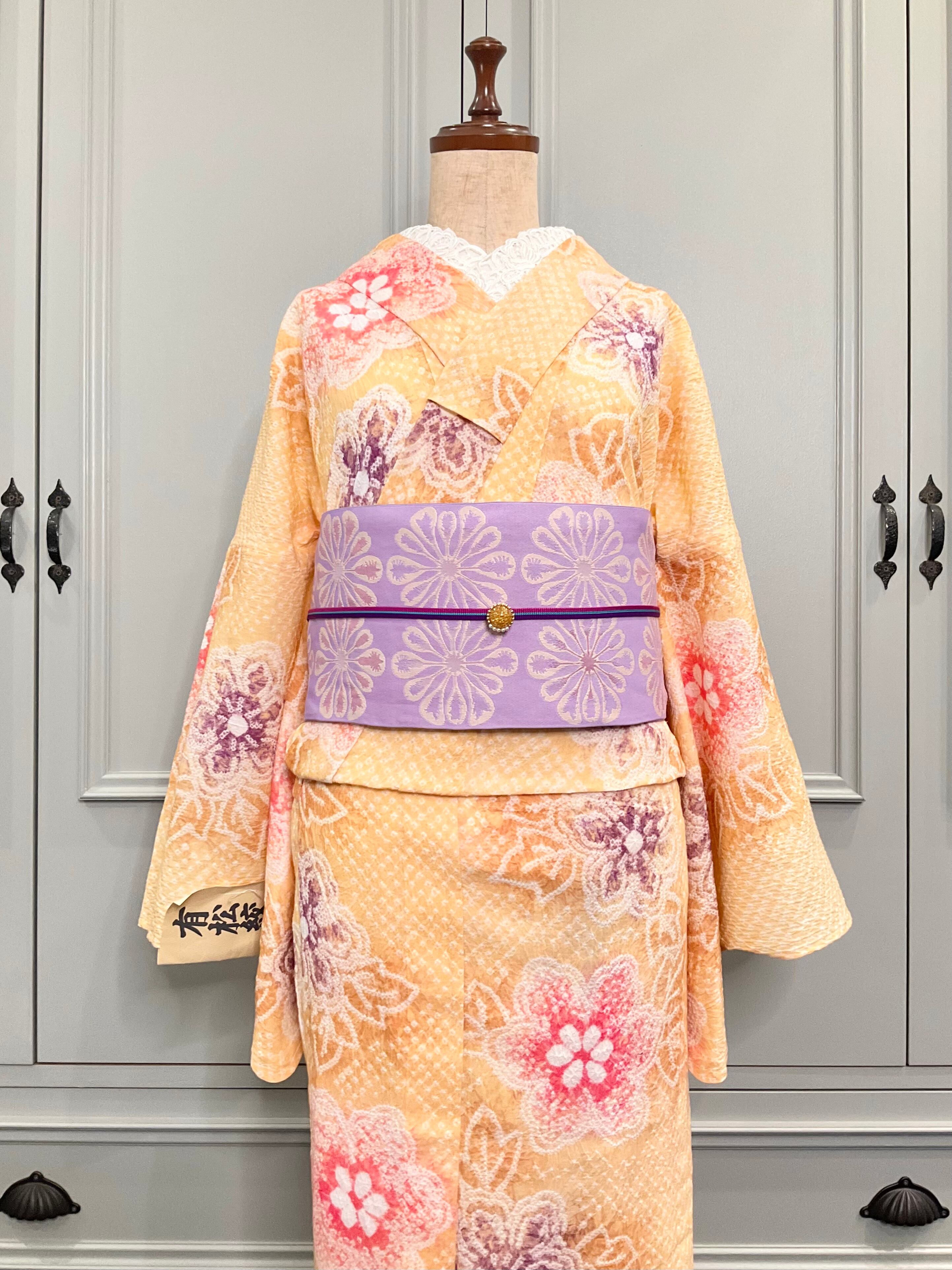 淡いオレンジ系の地色に、花模様がデザインされた、新品の有松鳴海絞り浴衣です♪
