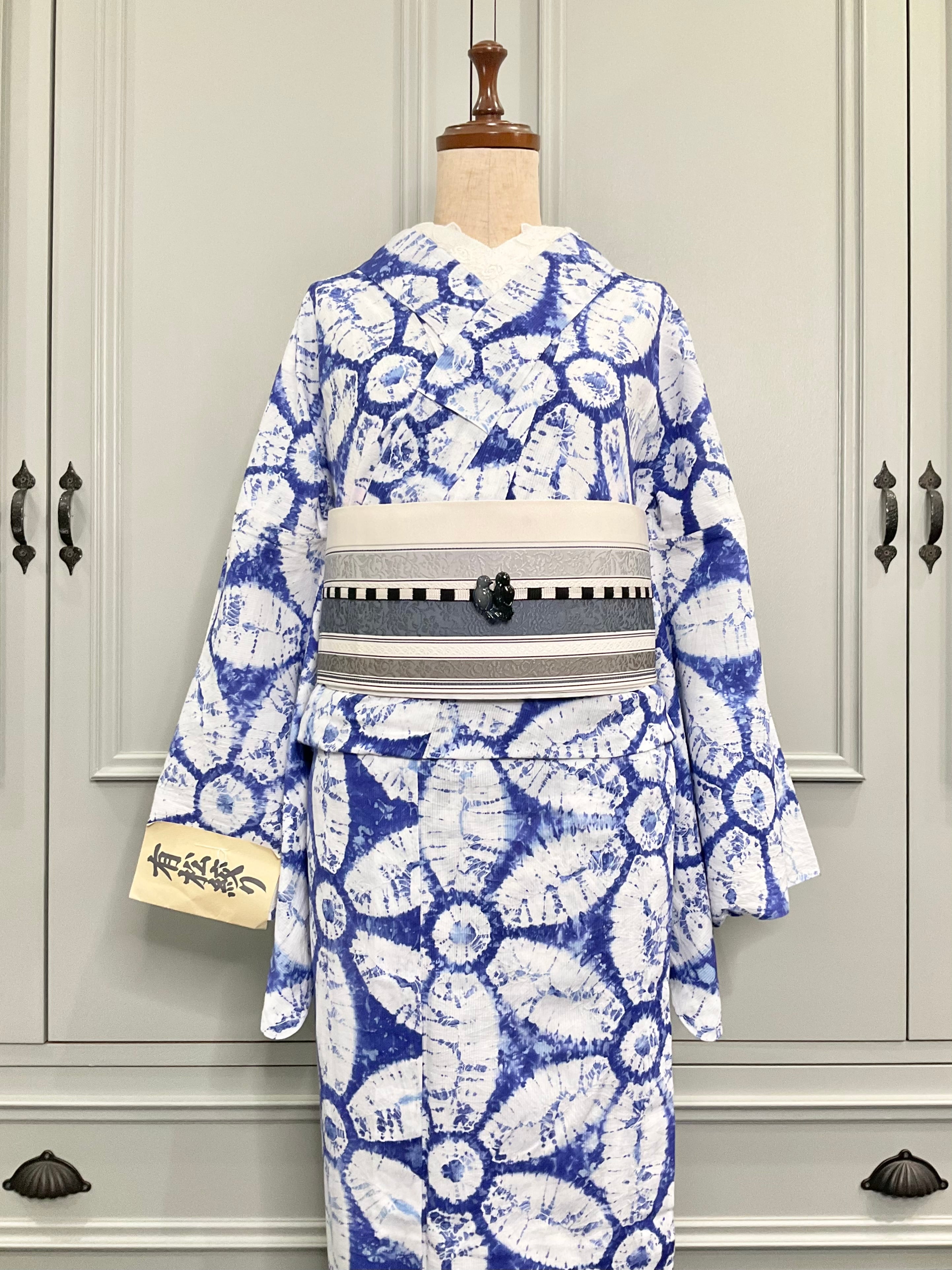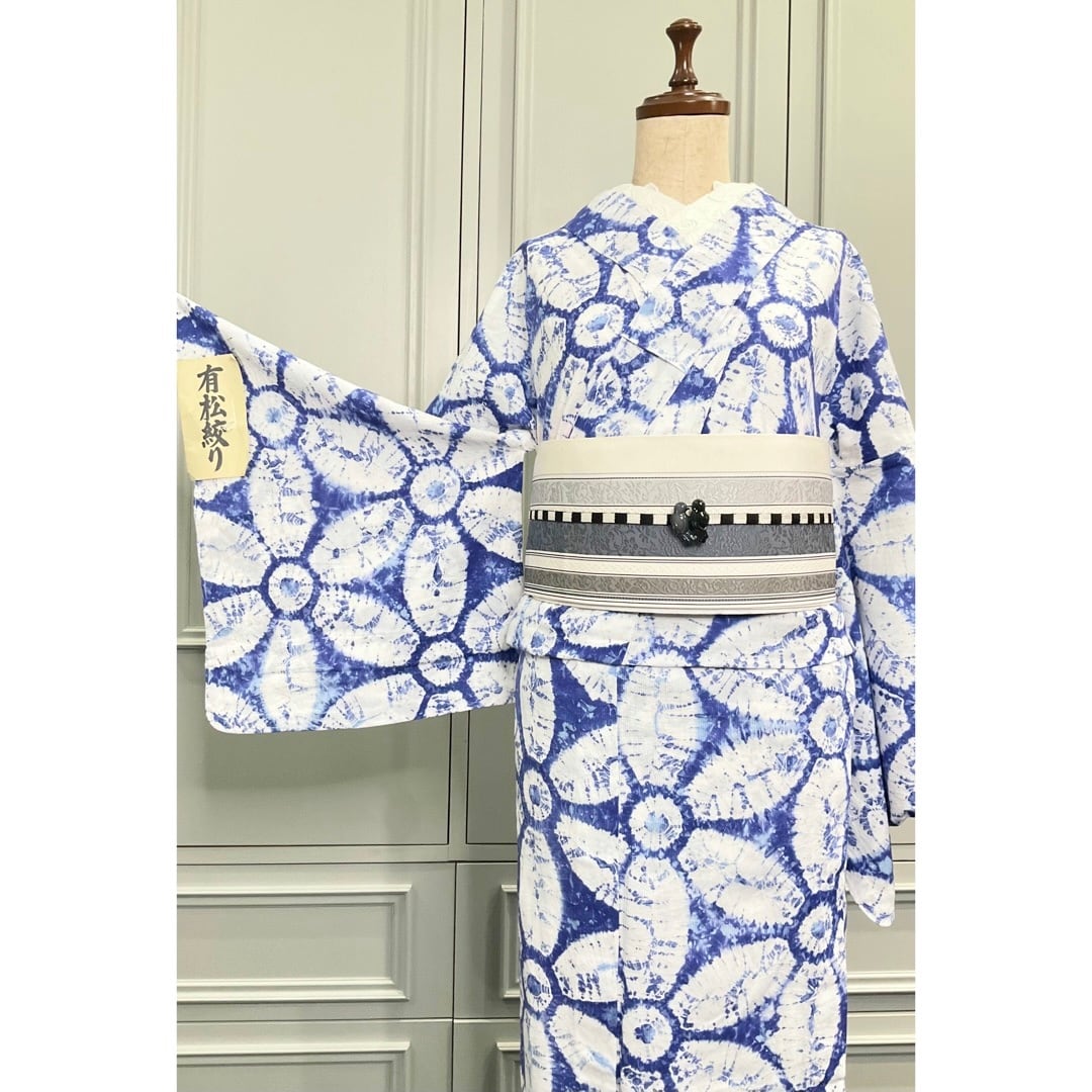 ブルー系×ホワイトの組み合わせに、大きな花模様が素敵な、新品の有松鳴海絞り浴衣です♪